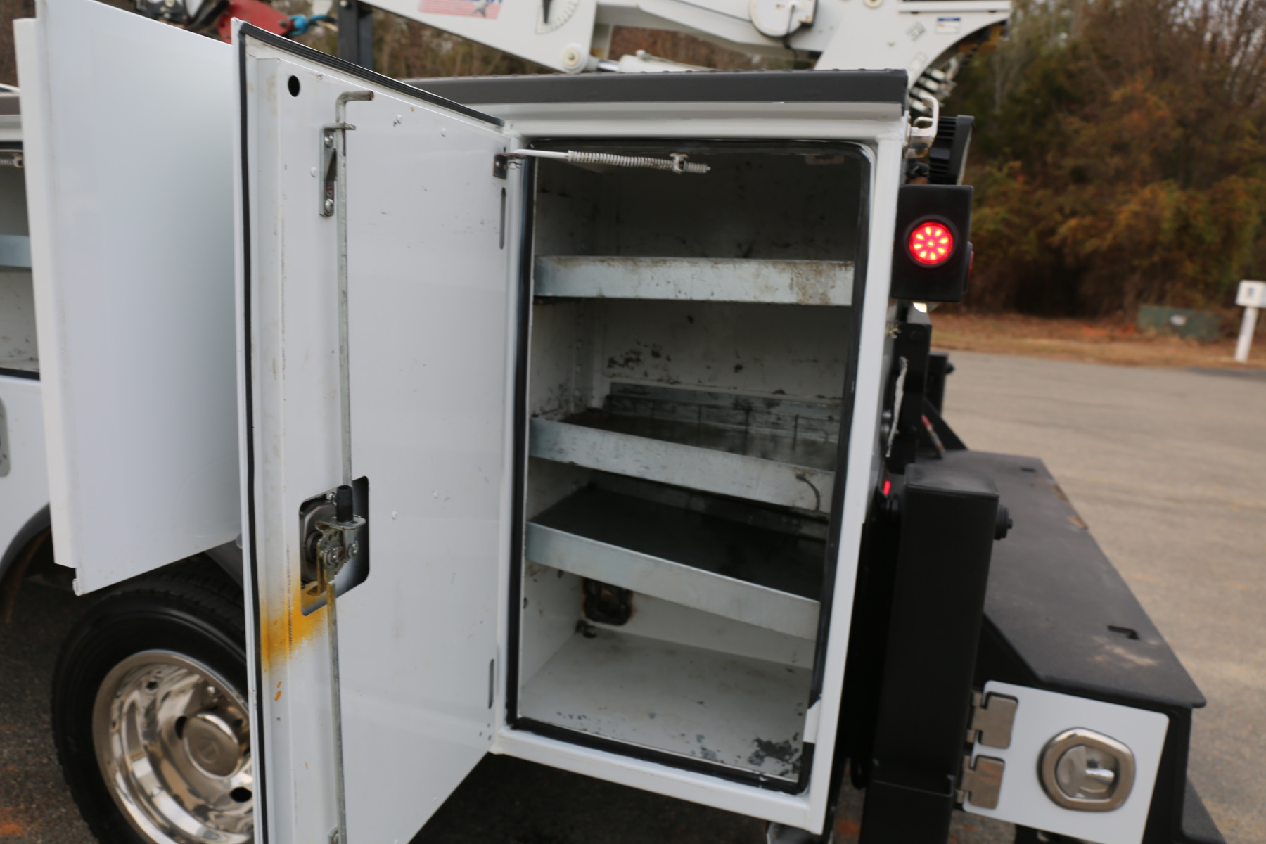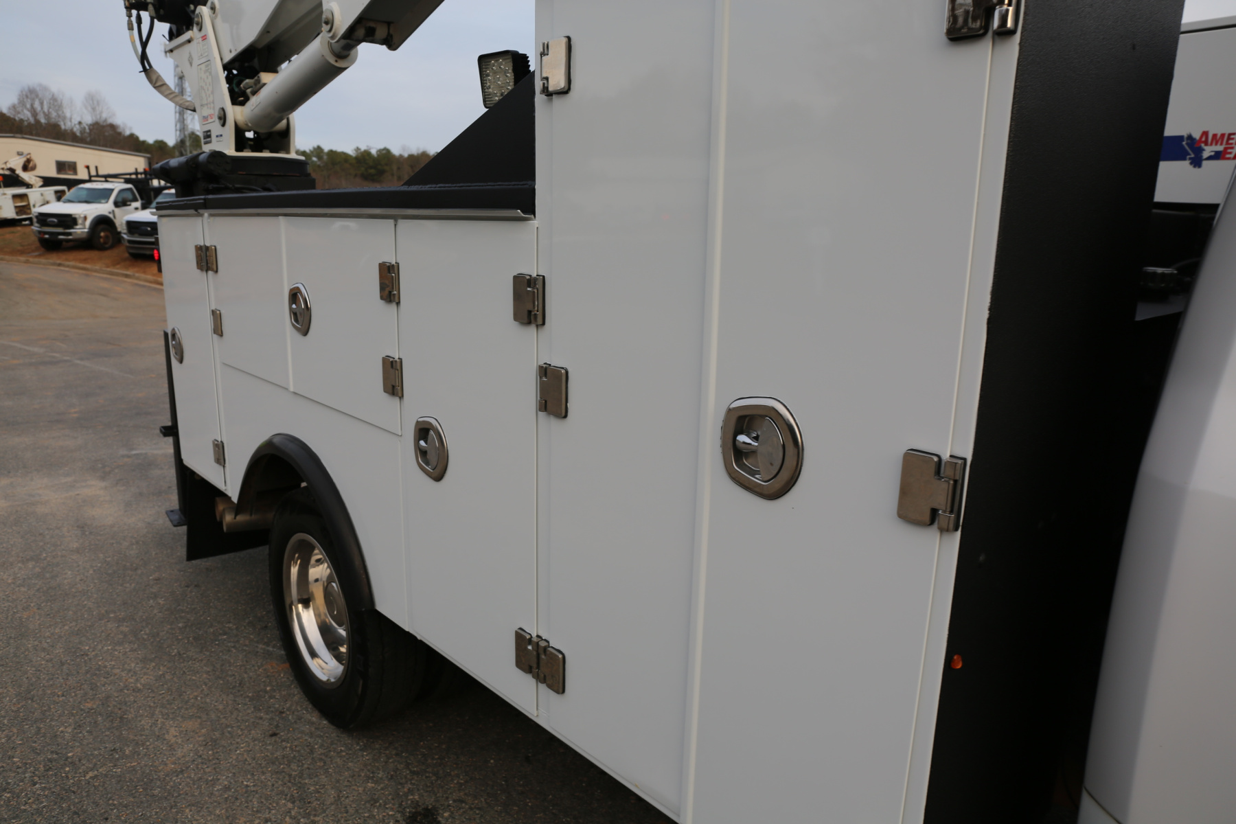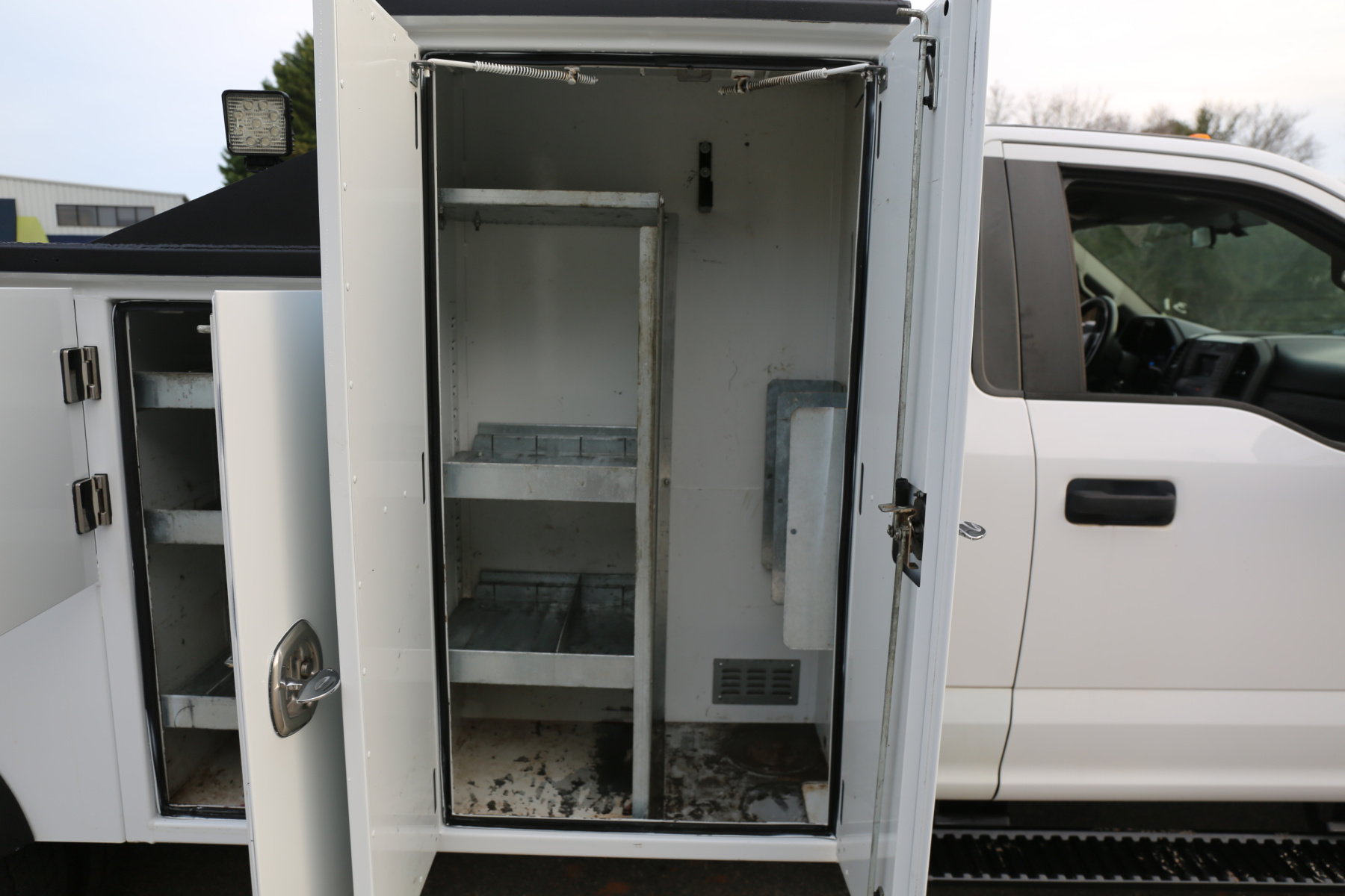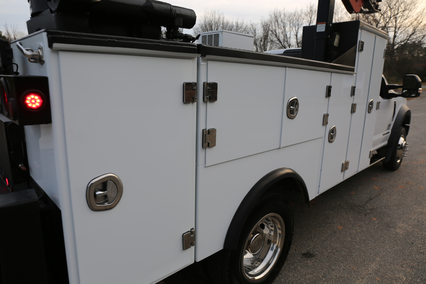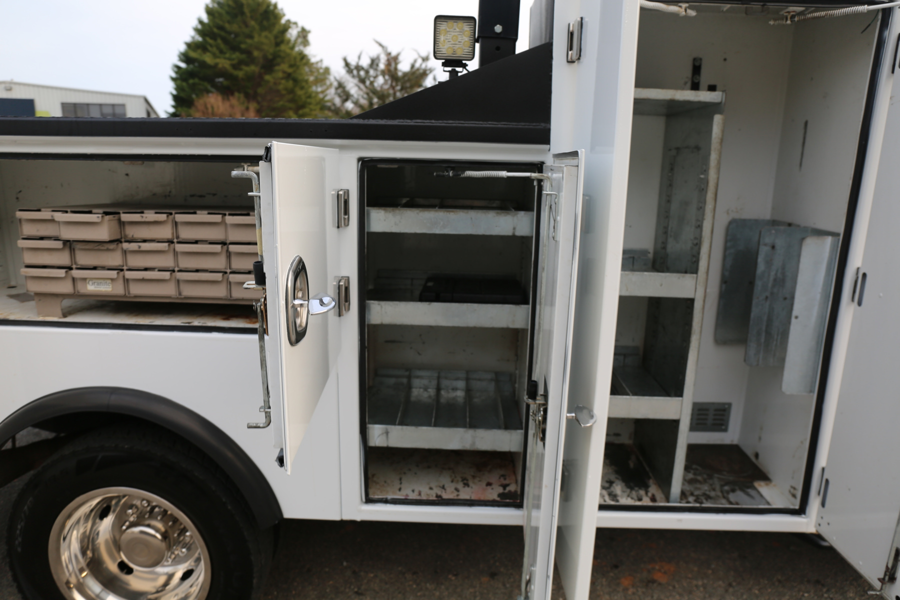 The service body is in excellent shape and free of any rust. The entire exterior of the bed was just sandblasted and repainted, with new bedliner applied to the work bench bumper, and shows like new. All of the doors close, latch, lock, and seal as they should. Interior compartment lighting throughout, as well as exterior LED work lighting – all lighting is operational.