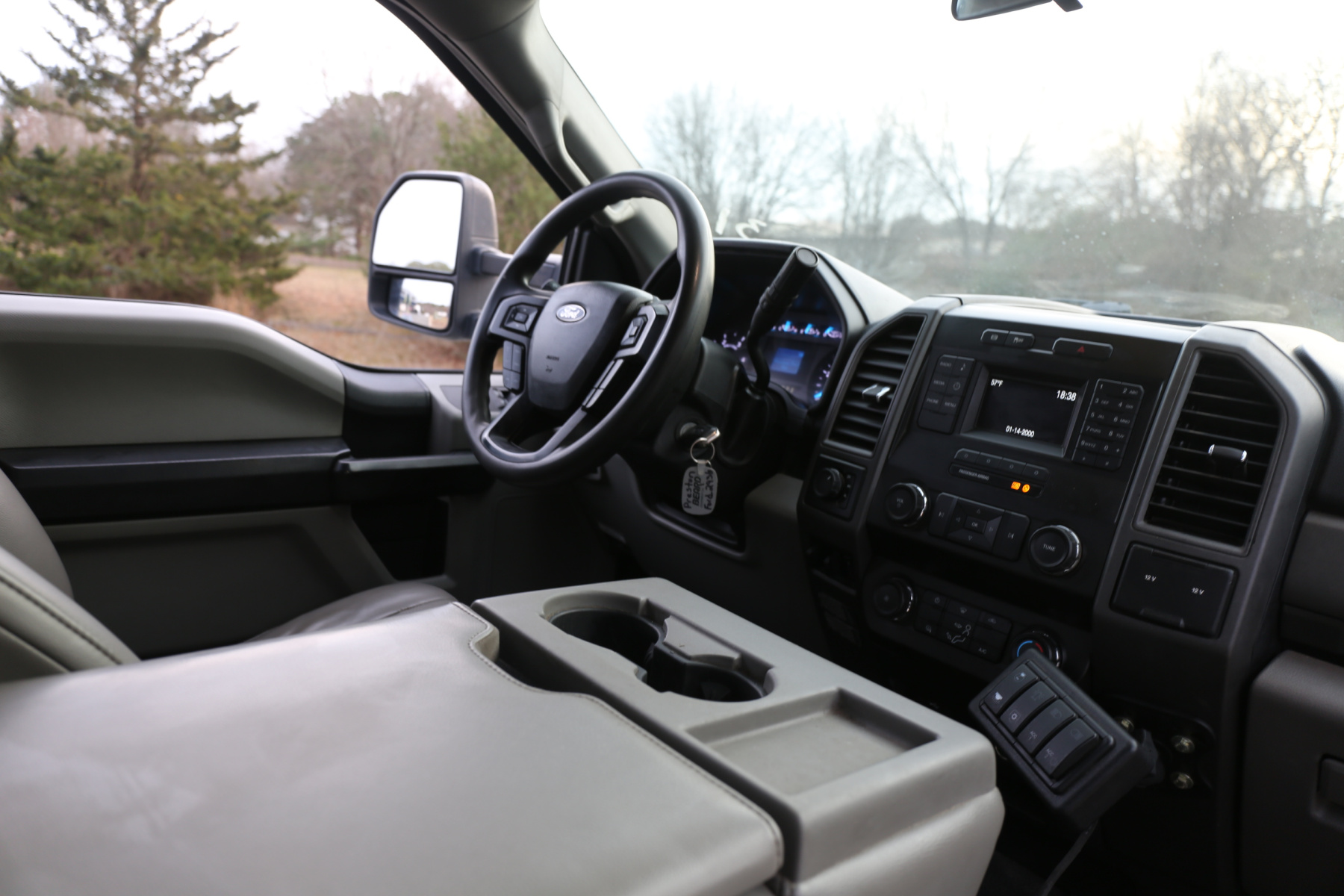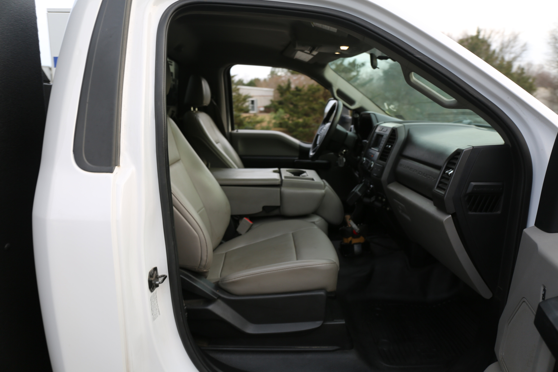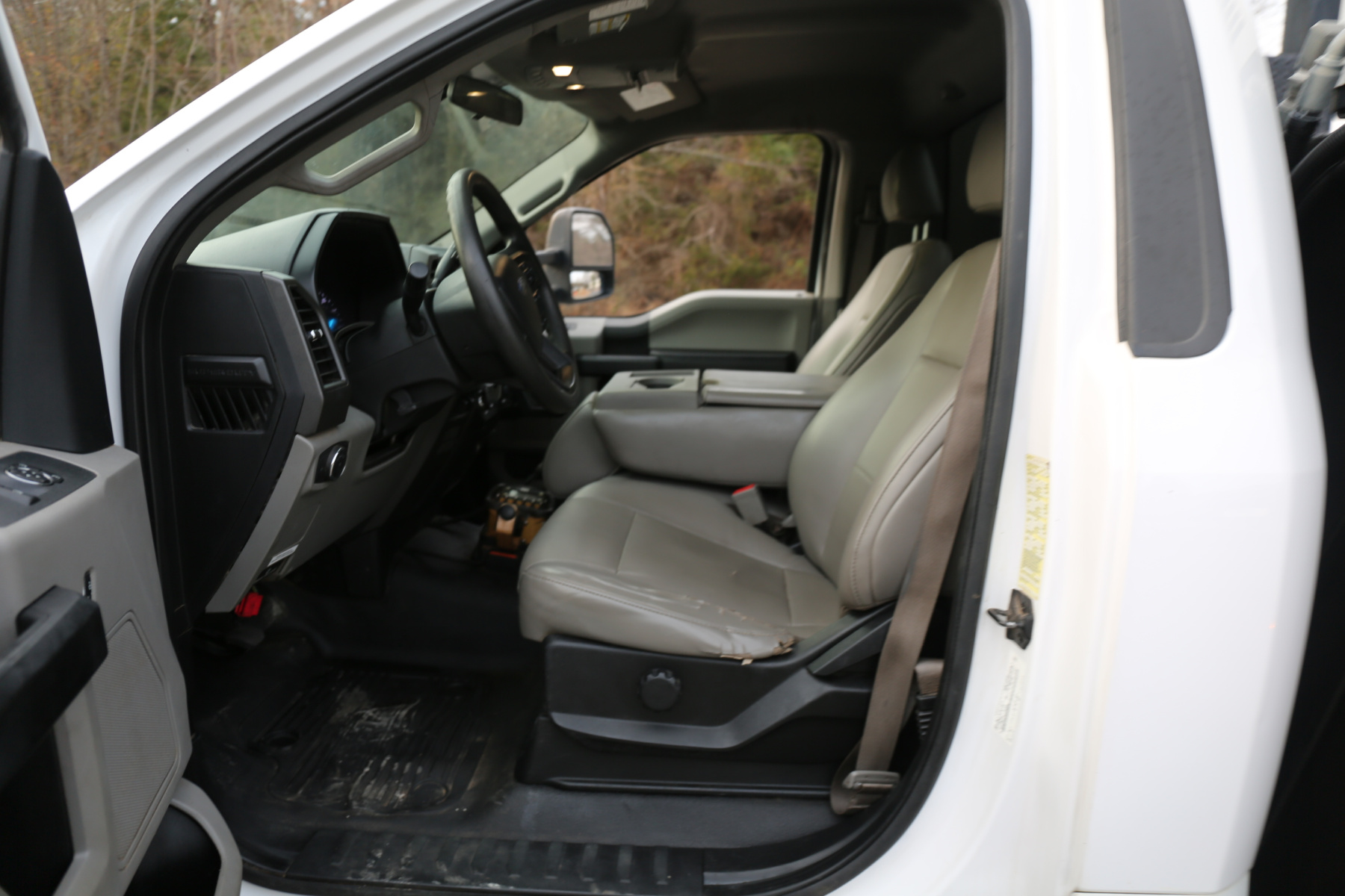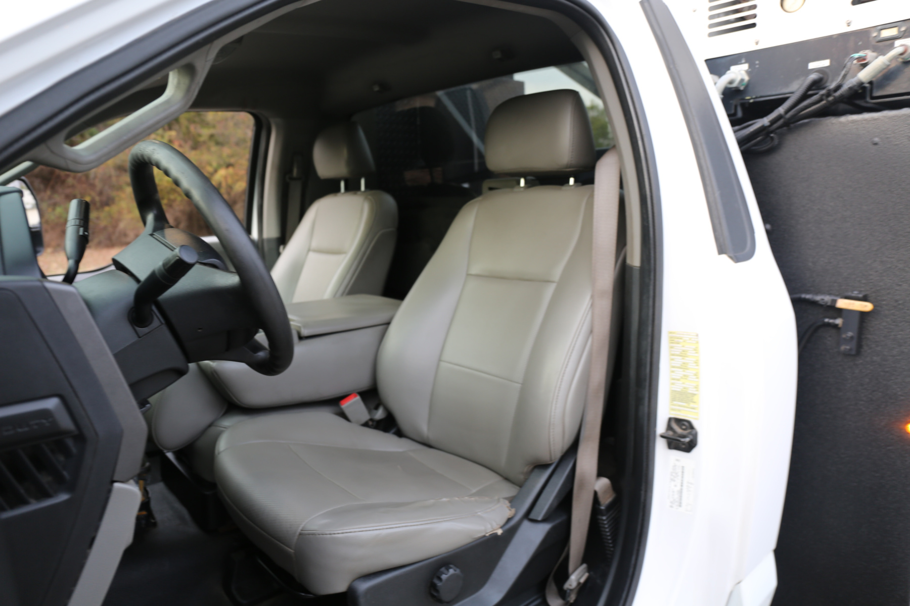 The cab is fairly clean, some minor dents to the chrome front bumper, otherwise free of any major damage. The interior is clean and free of any rips or tears. Vinyl seats and rubber floors, power locks and windows, cruise control, SYNC bluetooth, and factory exhaust brake.