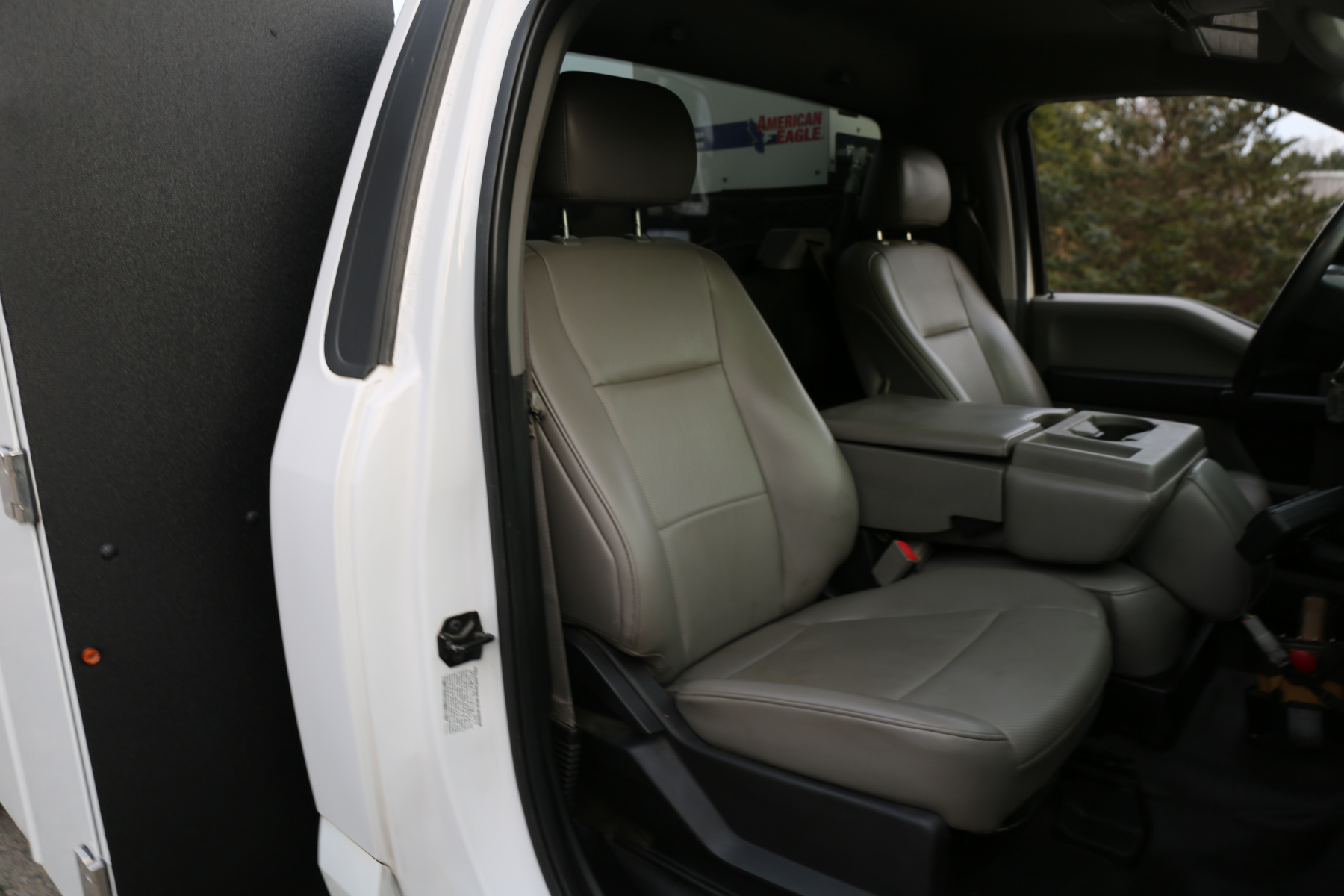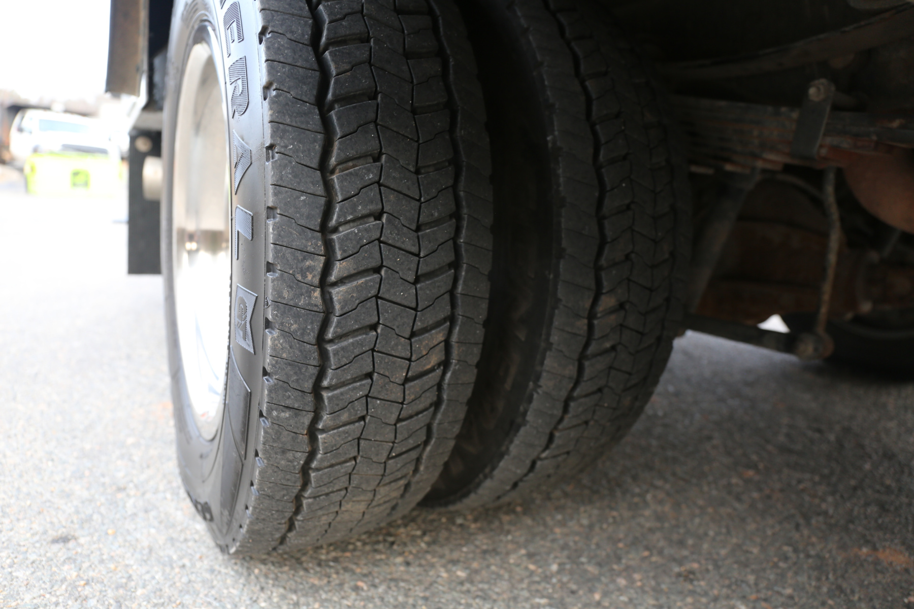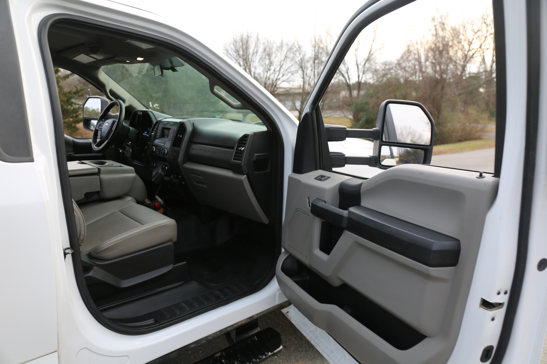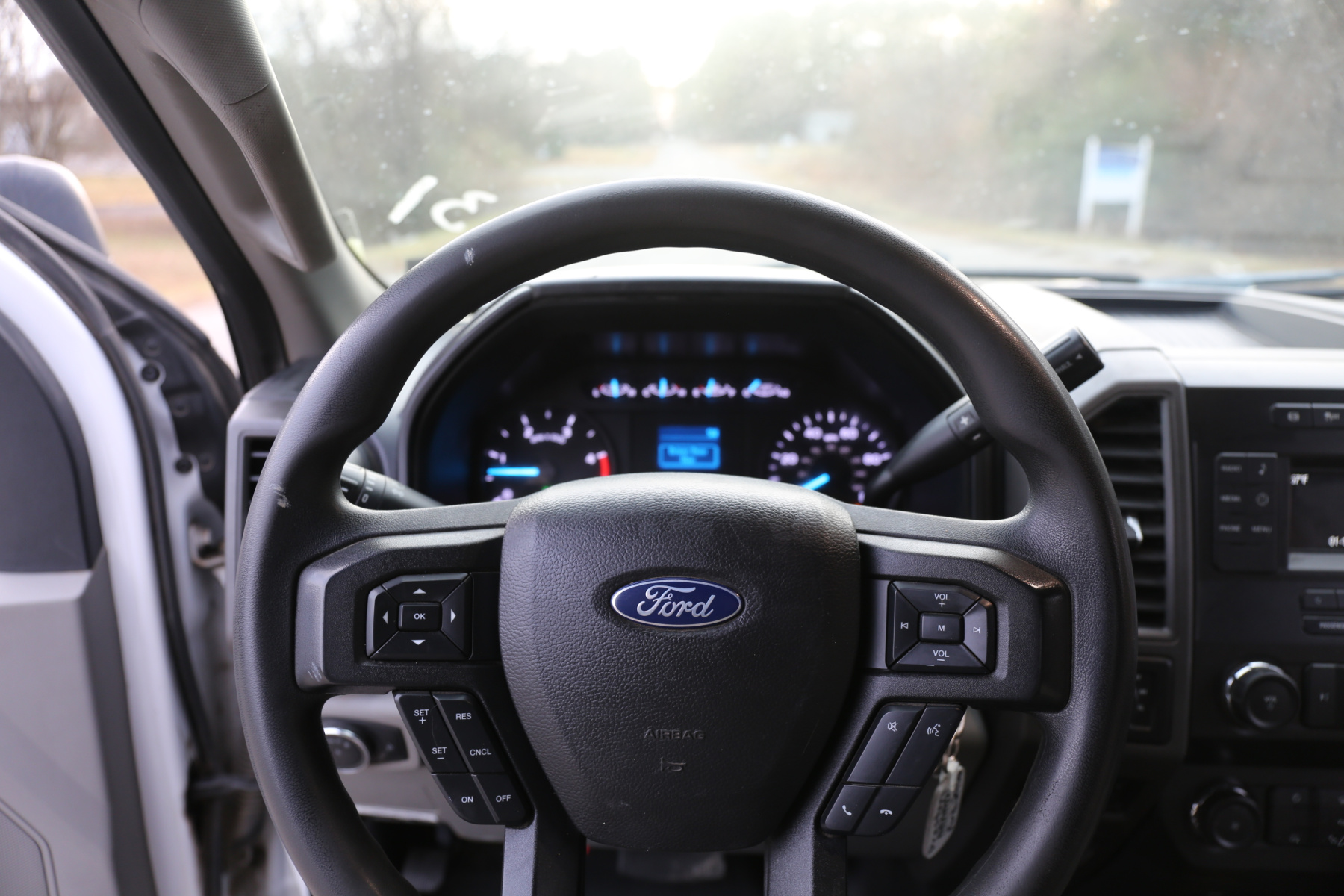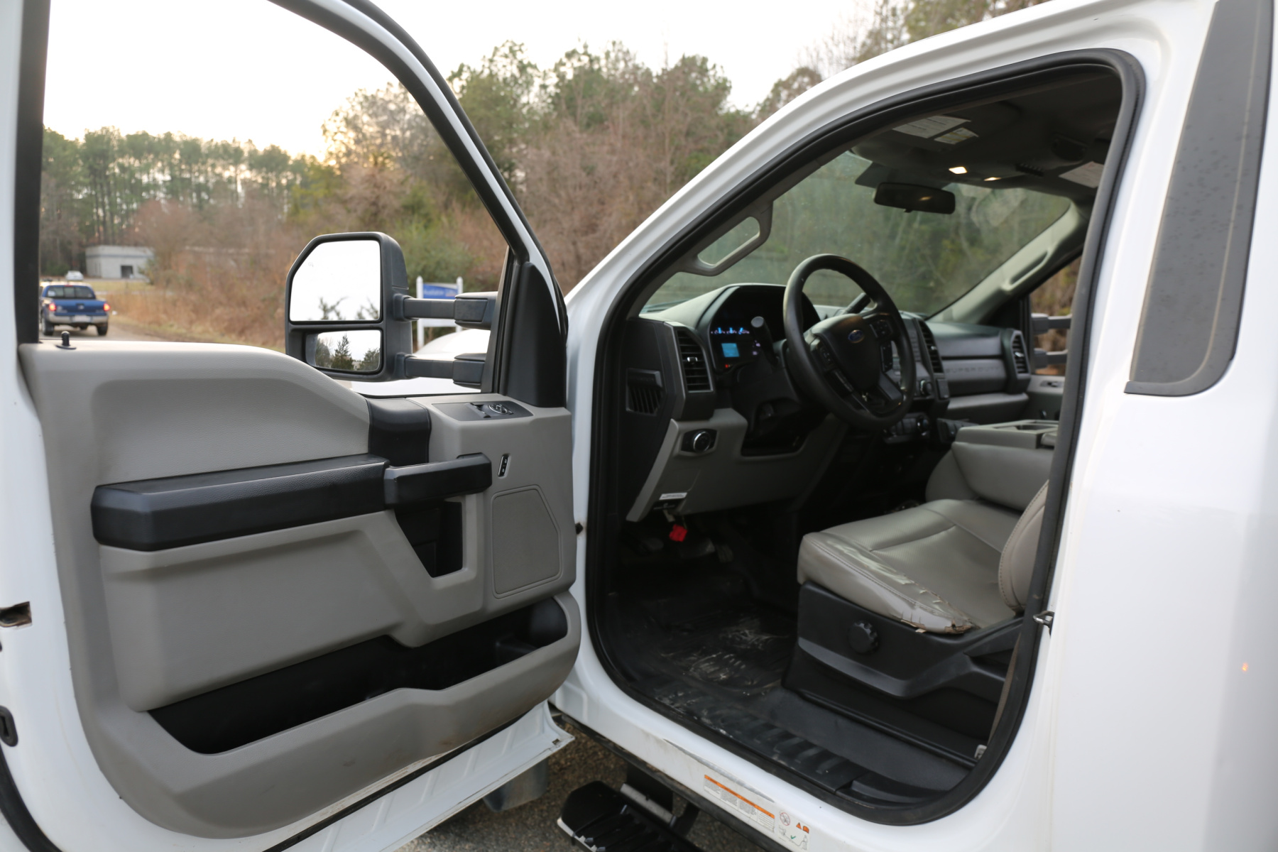 The cab is fairly clean, some minor dents to the chrome front bumper, otherwise free of any major damage. The interior is clean and free of any rips or tears. Vinyl seats and rubber floors, power locks and windows, cruise control, SYNC bluetooth, and factory exhaust brake.