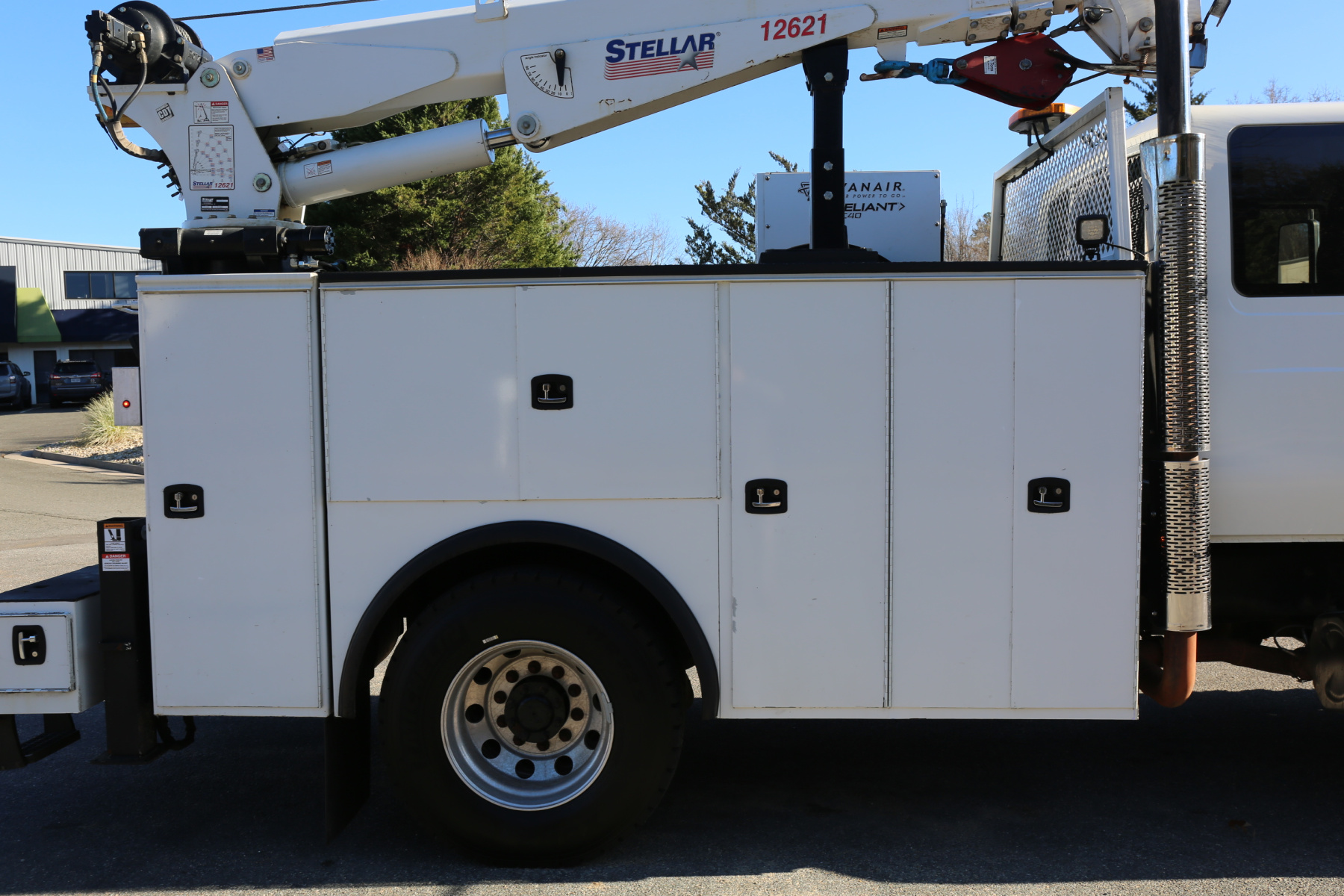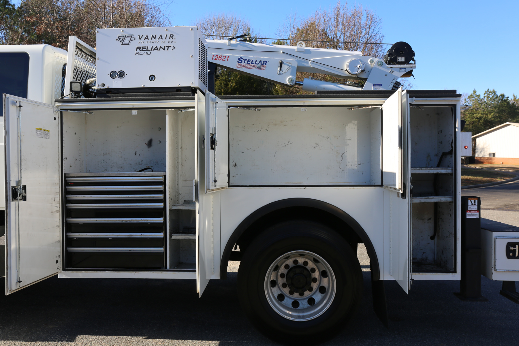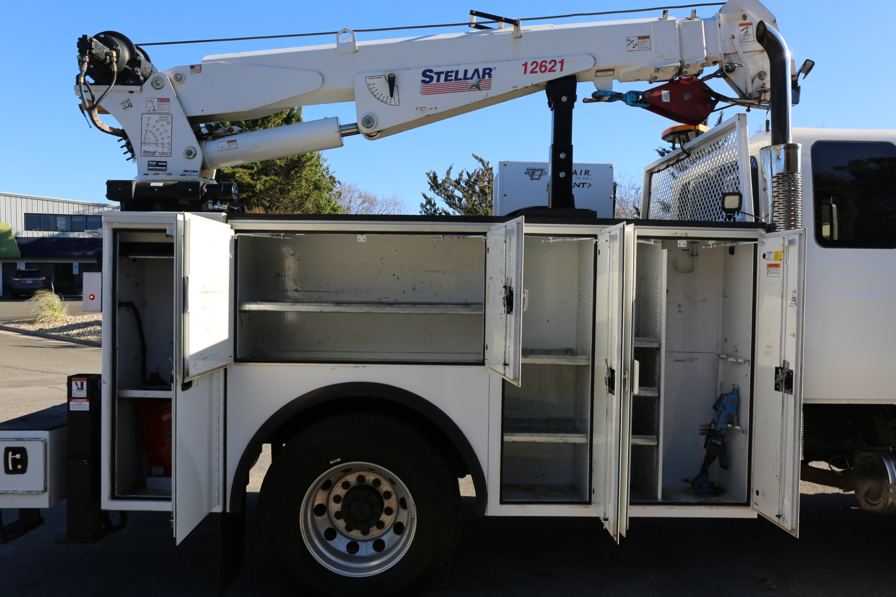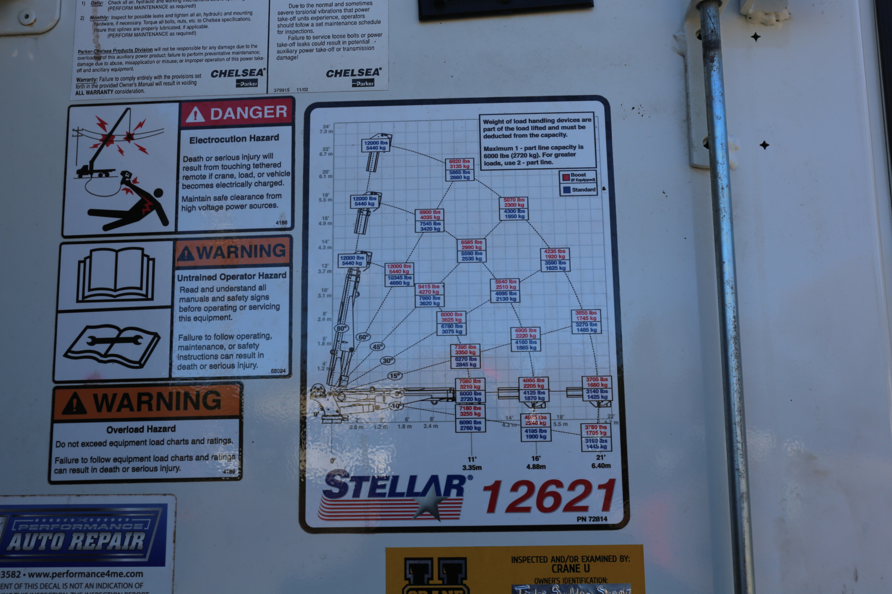 The crane is a Stellar 12621, with a 12,000# maximum lifting capacity and a two stage hydraulic extension out to 21′ of total reach. Run off a factory wireless remote – the remote turns the truck on and off, idles the truck up, and also controls the compressor.