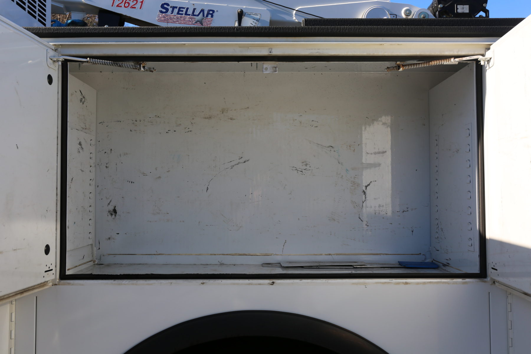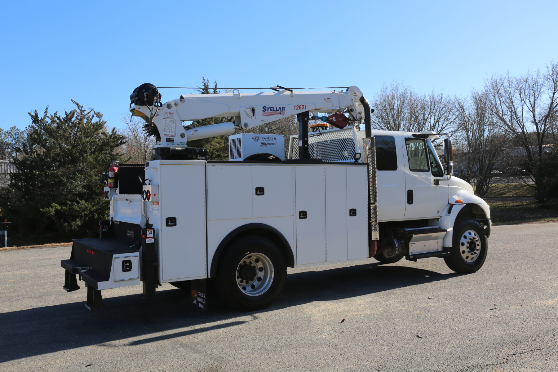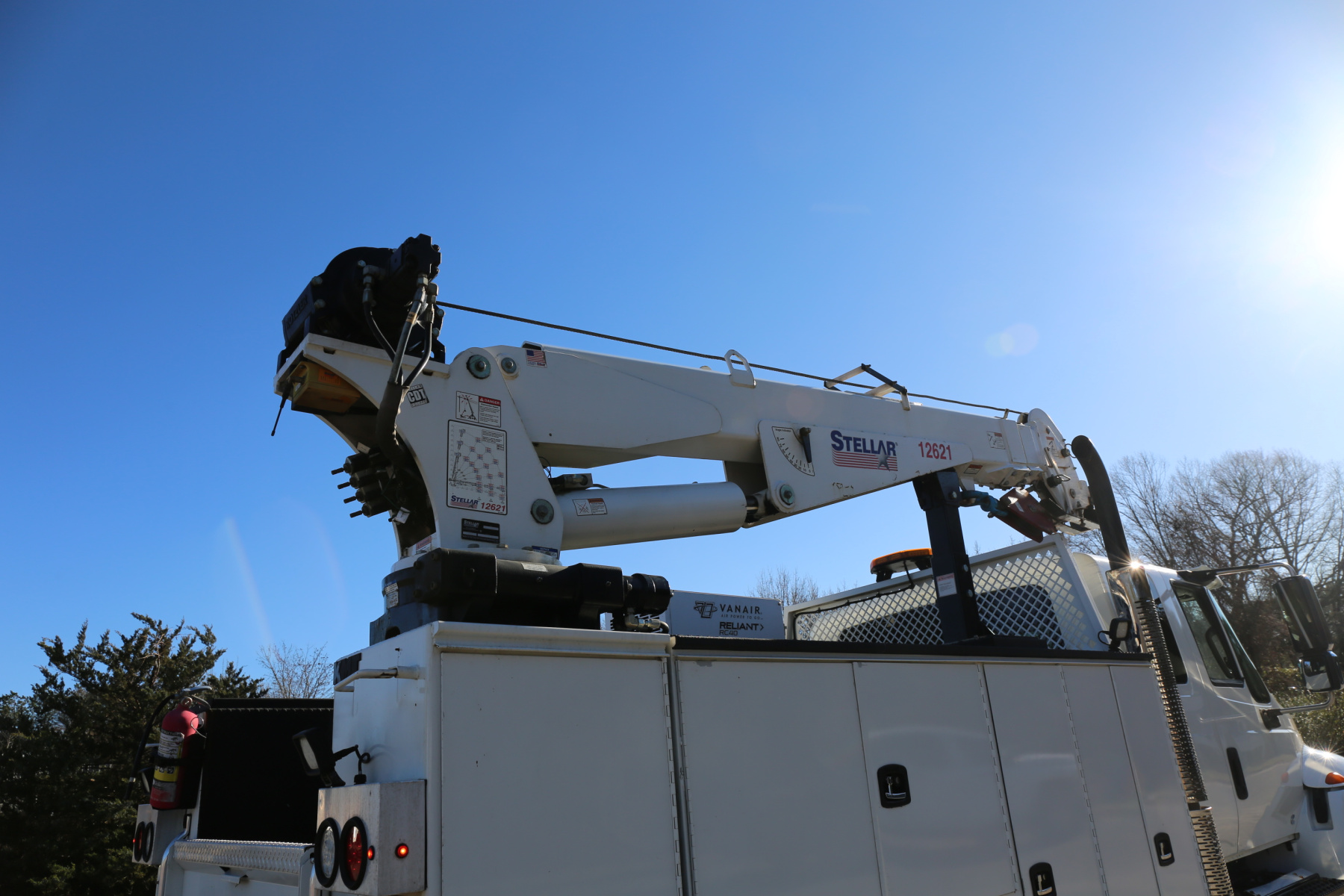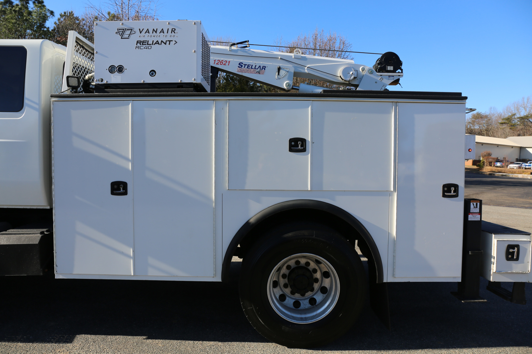 The crane is a Stellar 12621, with a 12,000# maximum lifting capacity and a two stage hydraulic extension out to 21′ of total reach. Run off a factory wireless remote – the remote turns the truck on and off, idles the truck up, and also controls the compressor.