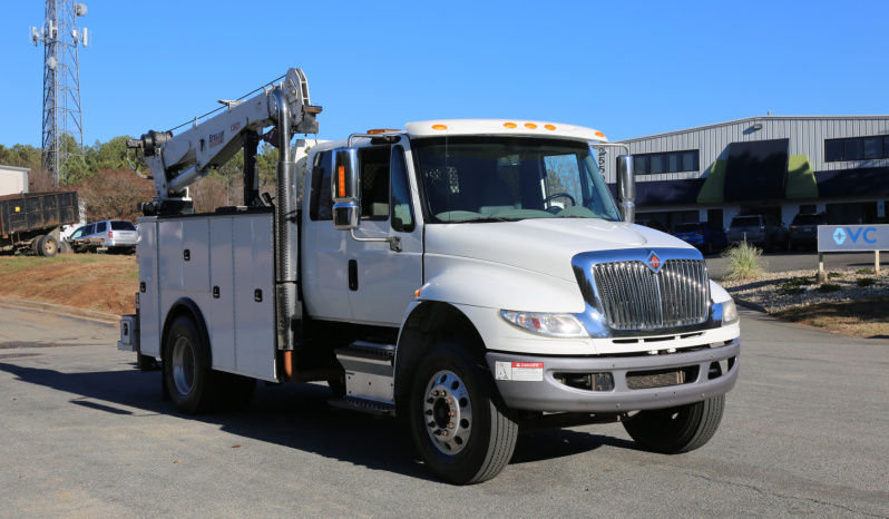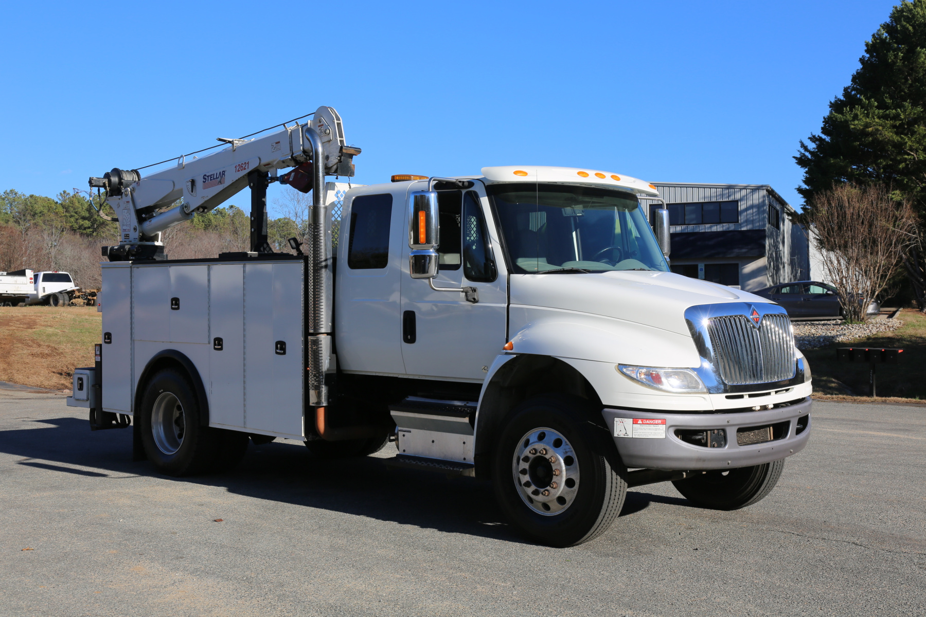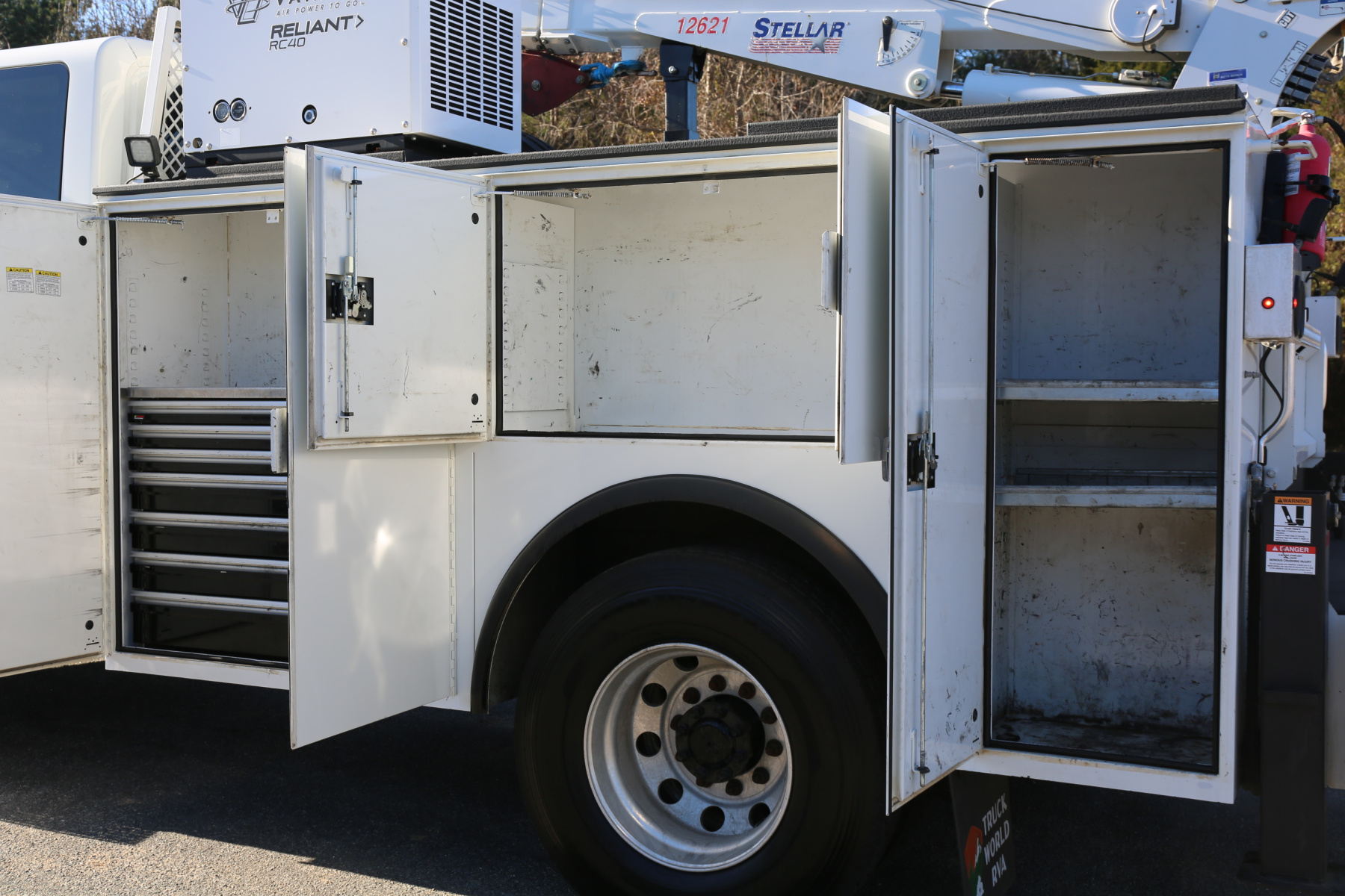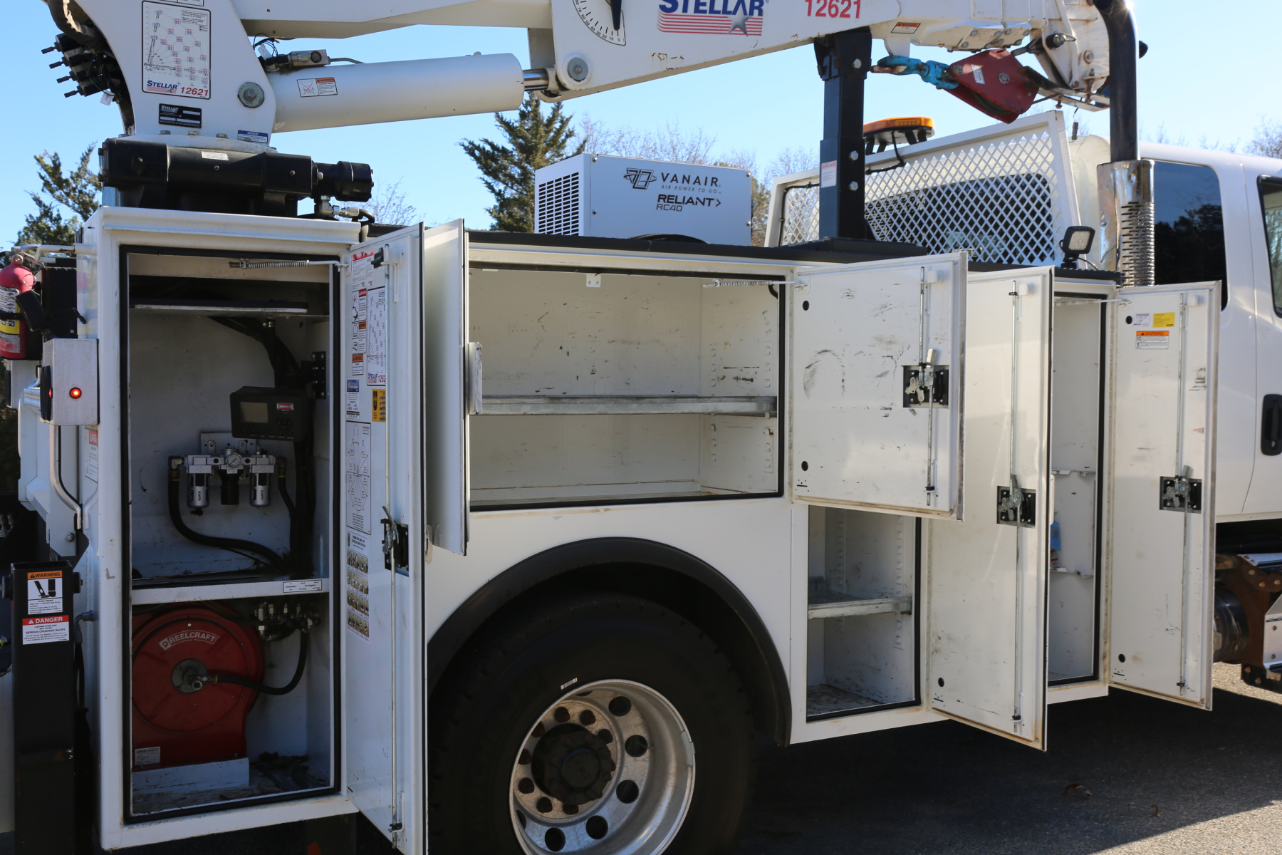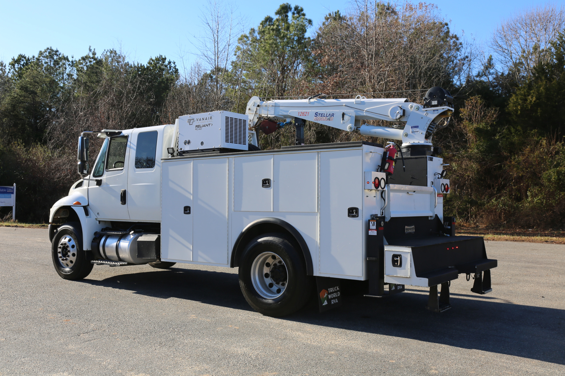 The crane is a Stellar 12621, with a 12,000# maximum lifting capacity and a two stage hydraulic extension out to 21′ of total reach. Run off a factory wireless remote – the remote turns the truck on and off, idles the truck up, and also controls the compressor.