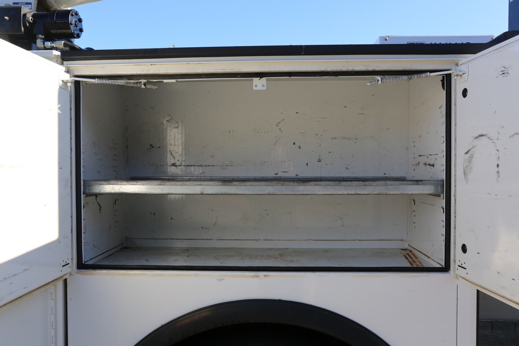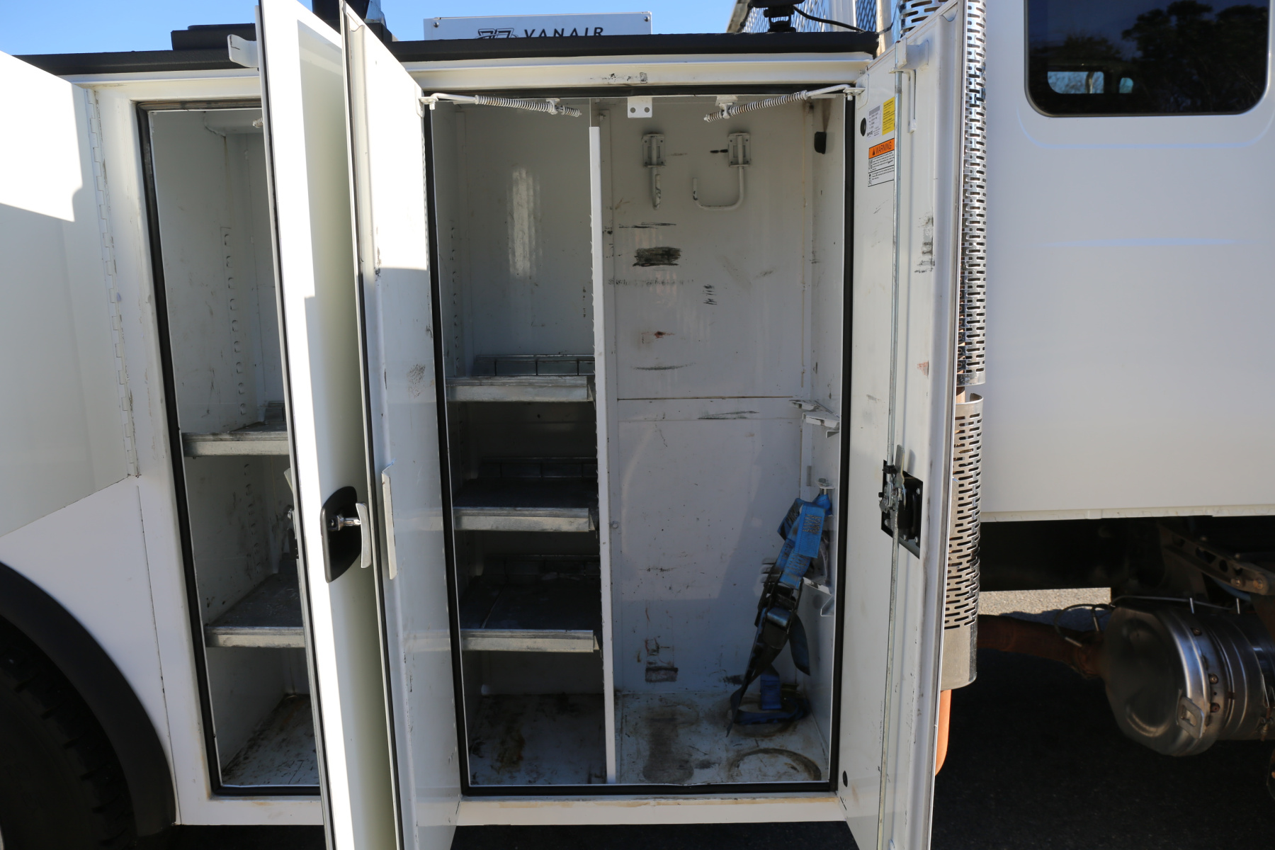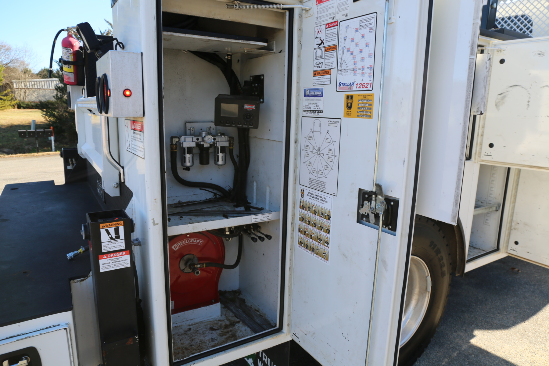The crane compartment houses a Reelcraft hose reel, new air regulator and drier, outrigger control levers, body control panel to control the bed lighting, and has one shelf.