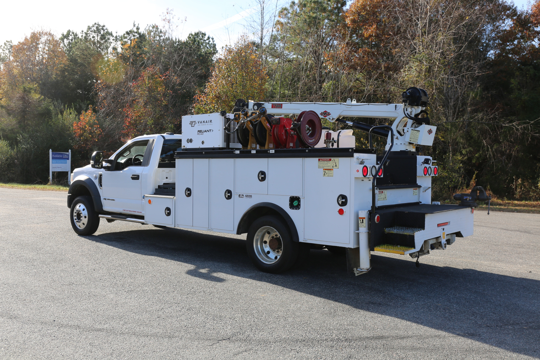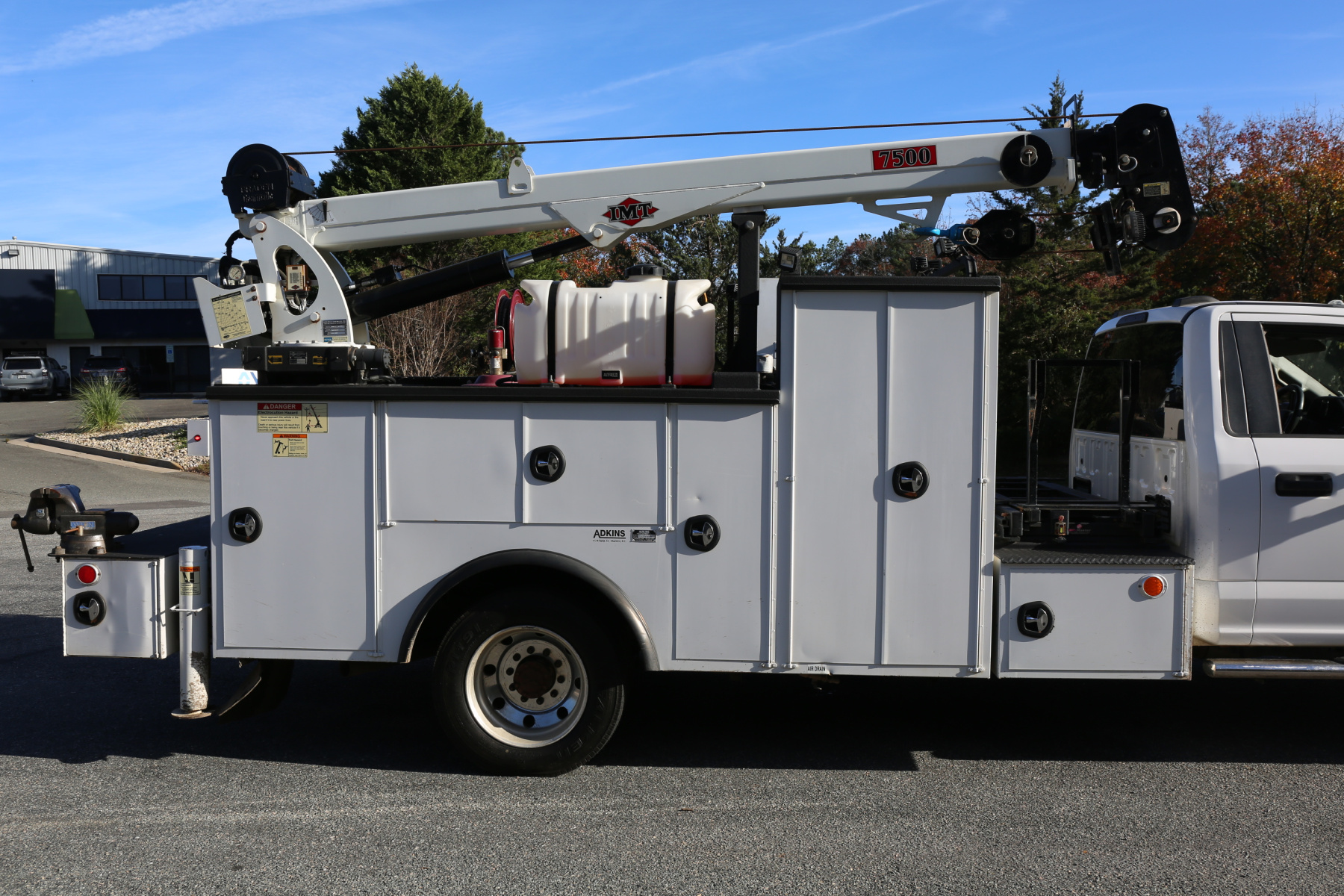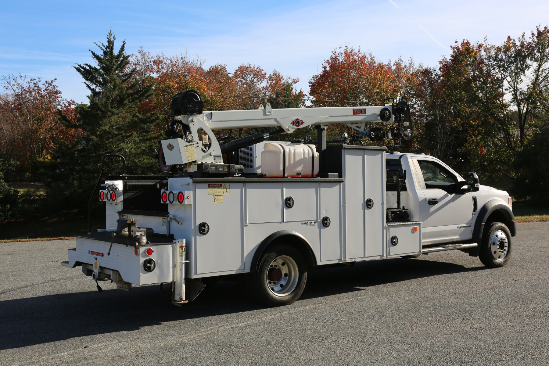 3′ weld deck with sliding welder platform, 11′ IMT/Adkins service body dated the same year as the truck. Two sets of drawers, an IMT 7500-22 series crane, and a CAS40P compressor. All of the equipment works as it should.