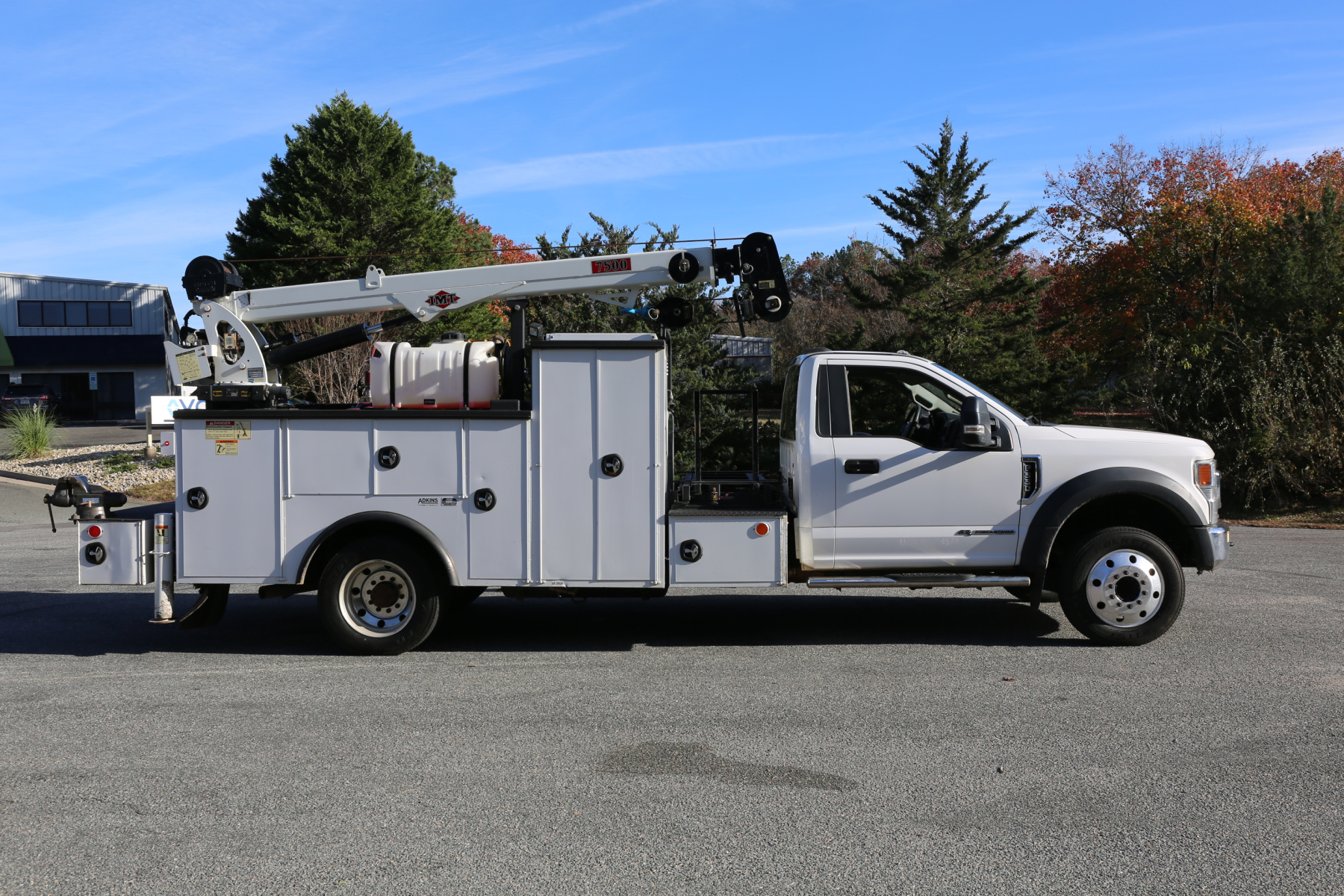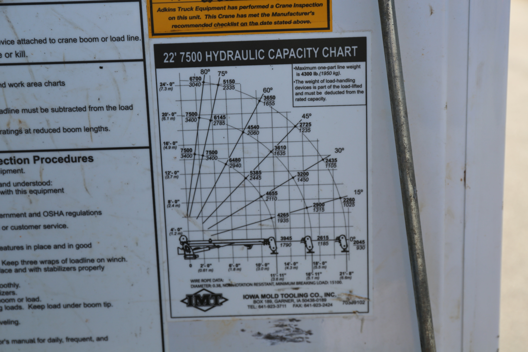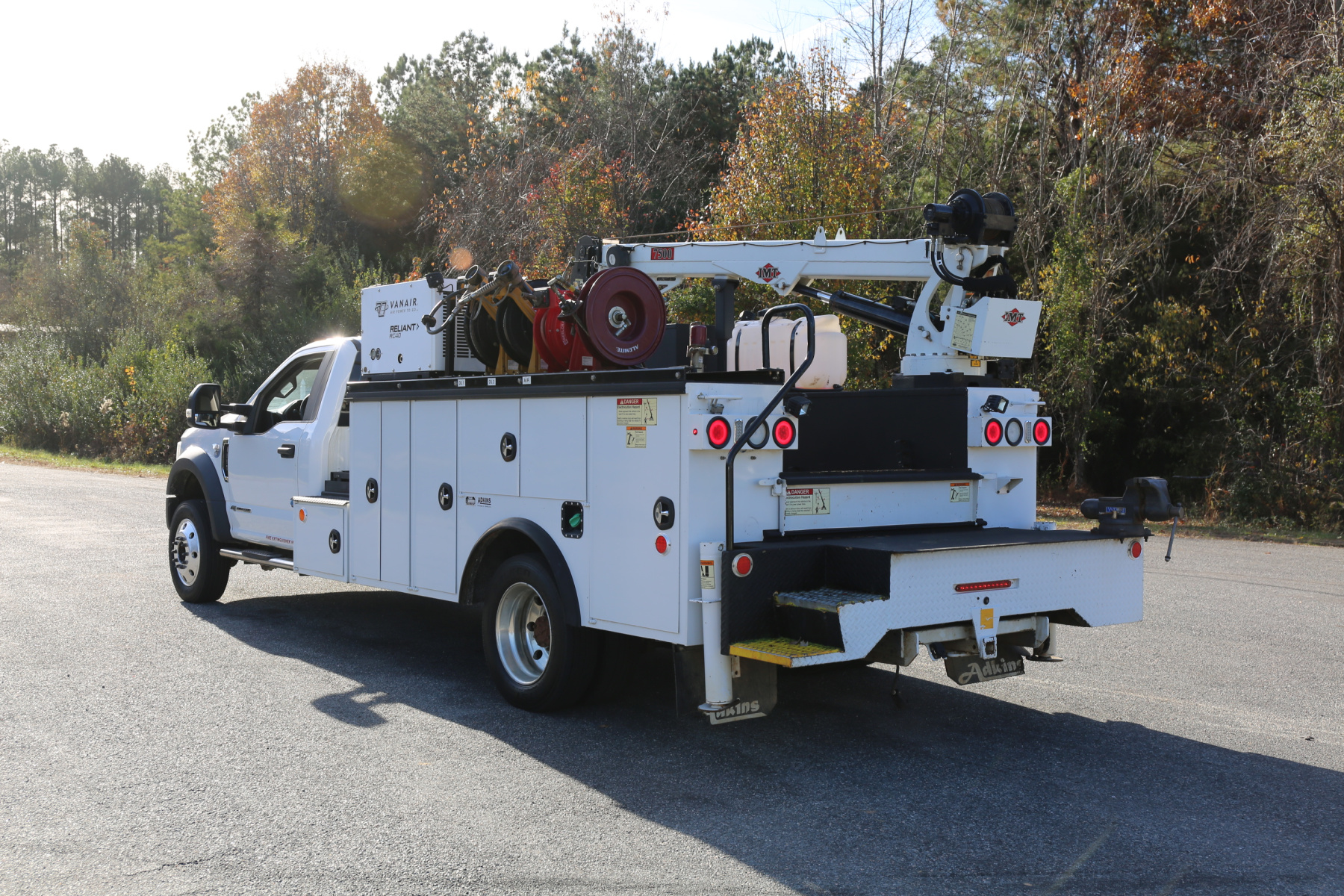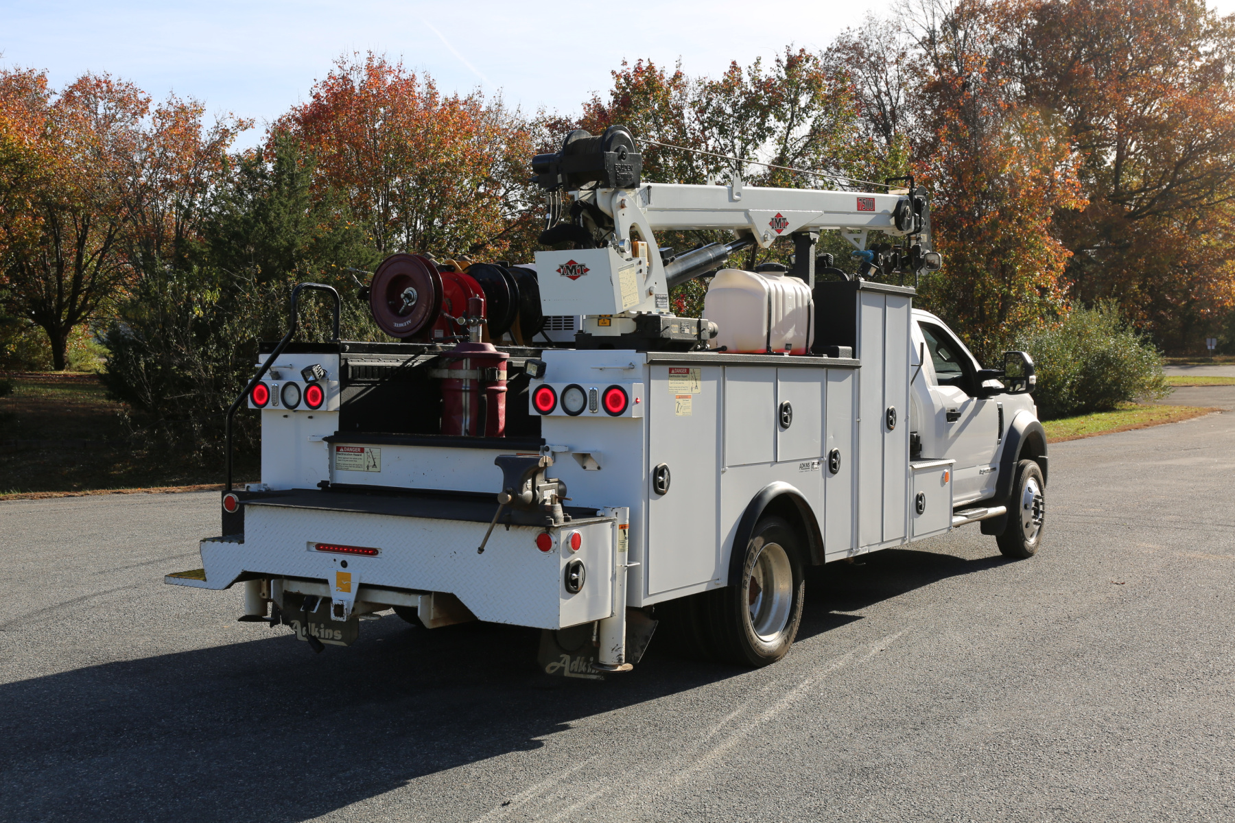 3′ weld deck with sliding welder platform, 11′ IMT/Adkins service body dated the same year as the truck. Two sets of drawers, an IMT 7500-22 series crane, and a CAS40P compressor. All of the equipment works as it should.