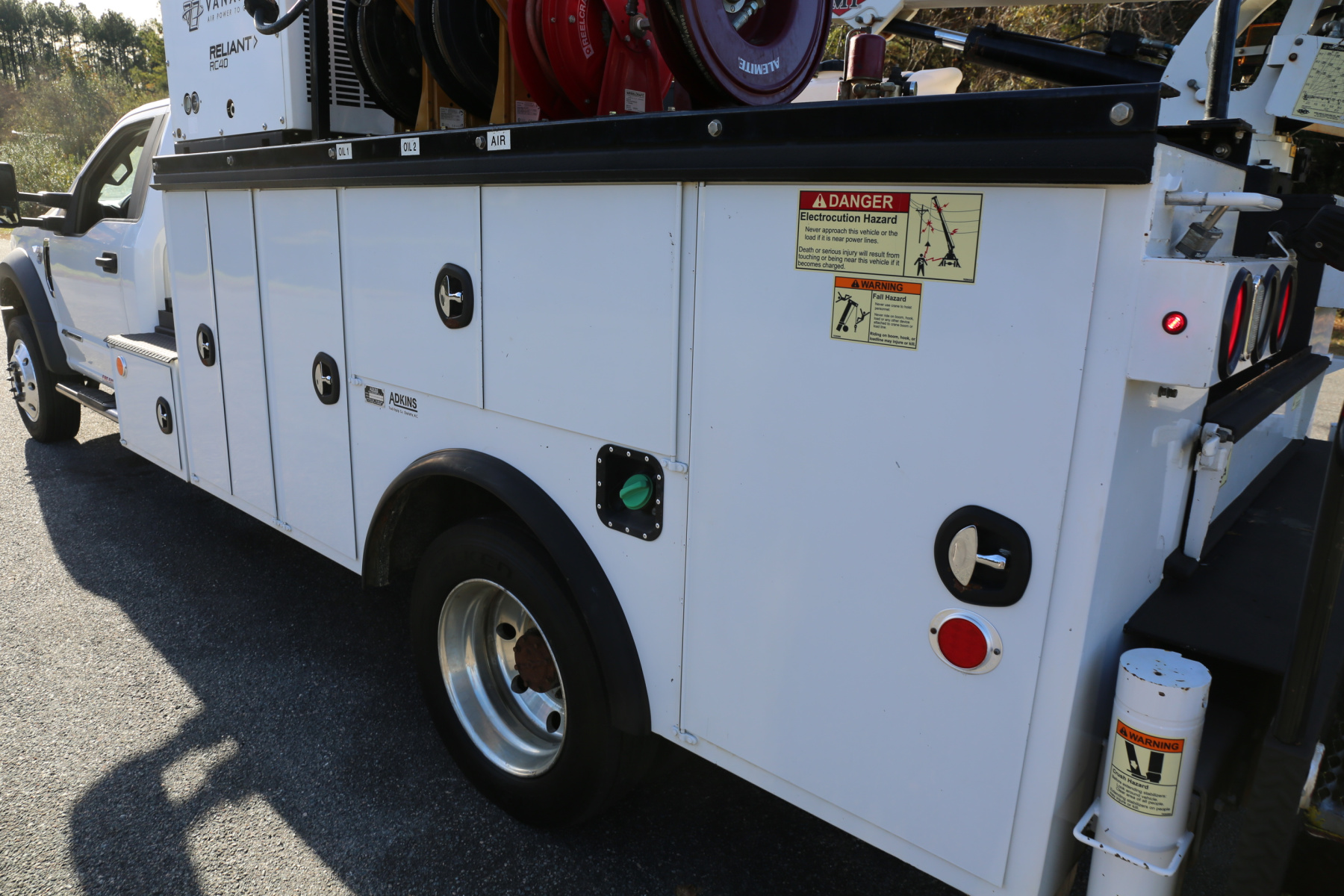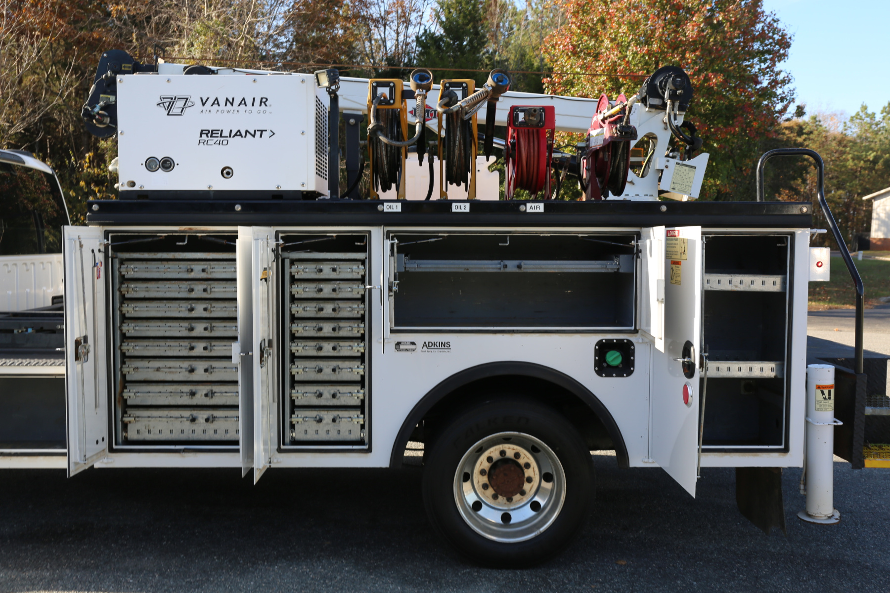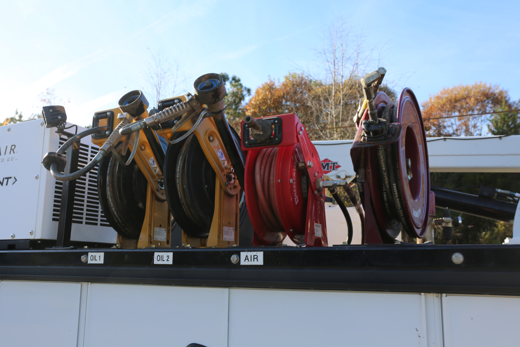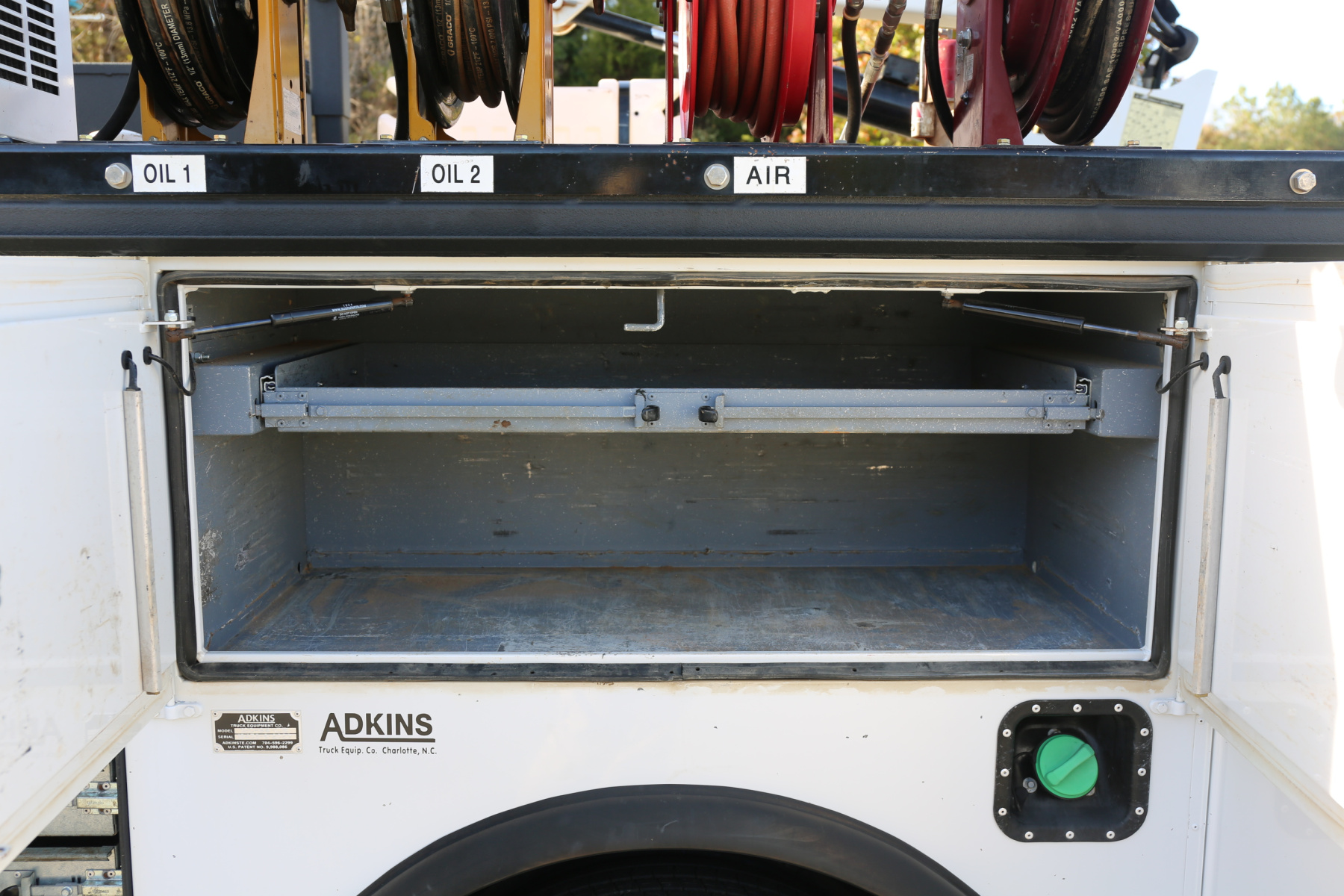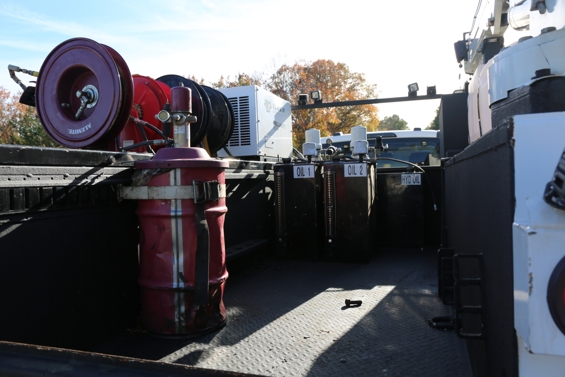 Inside the bed are two fresh oil tanks and a grease bucket, with fireball 300 air powered pumps, and oil reels and dispensers located behind the compressor.