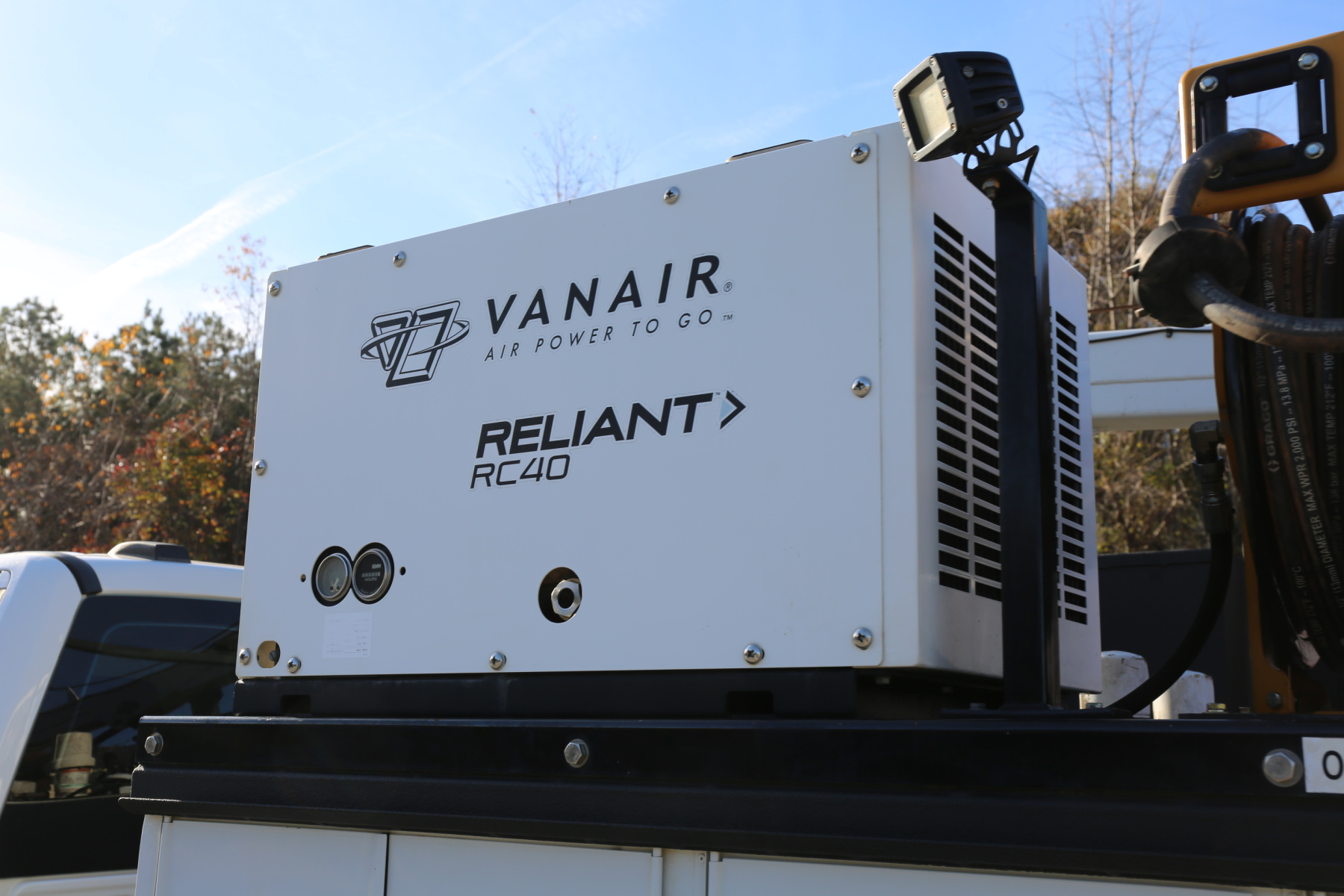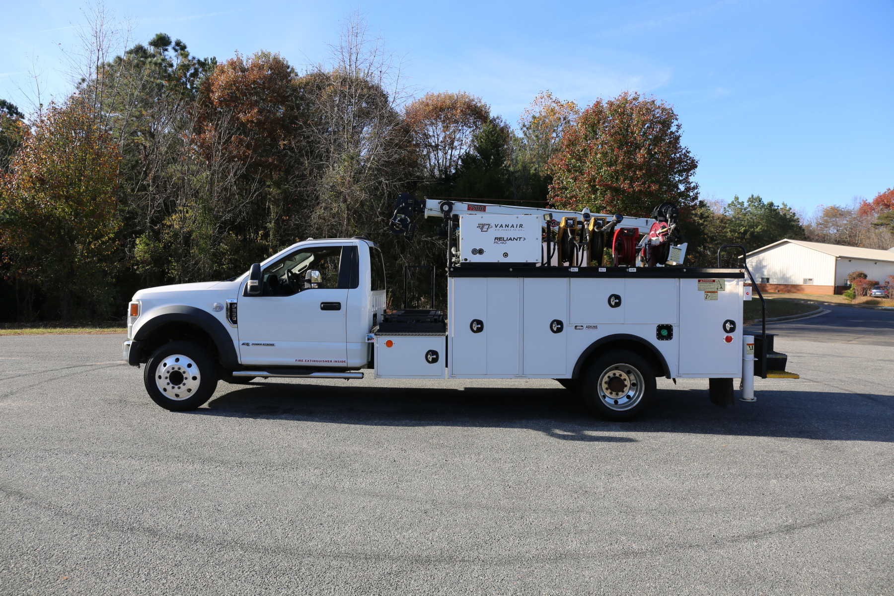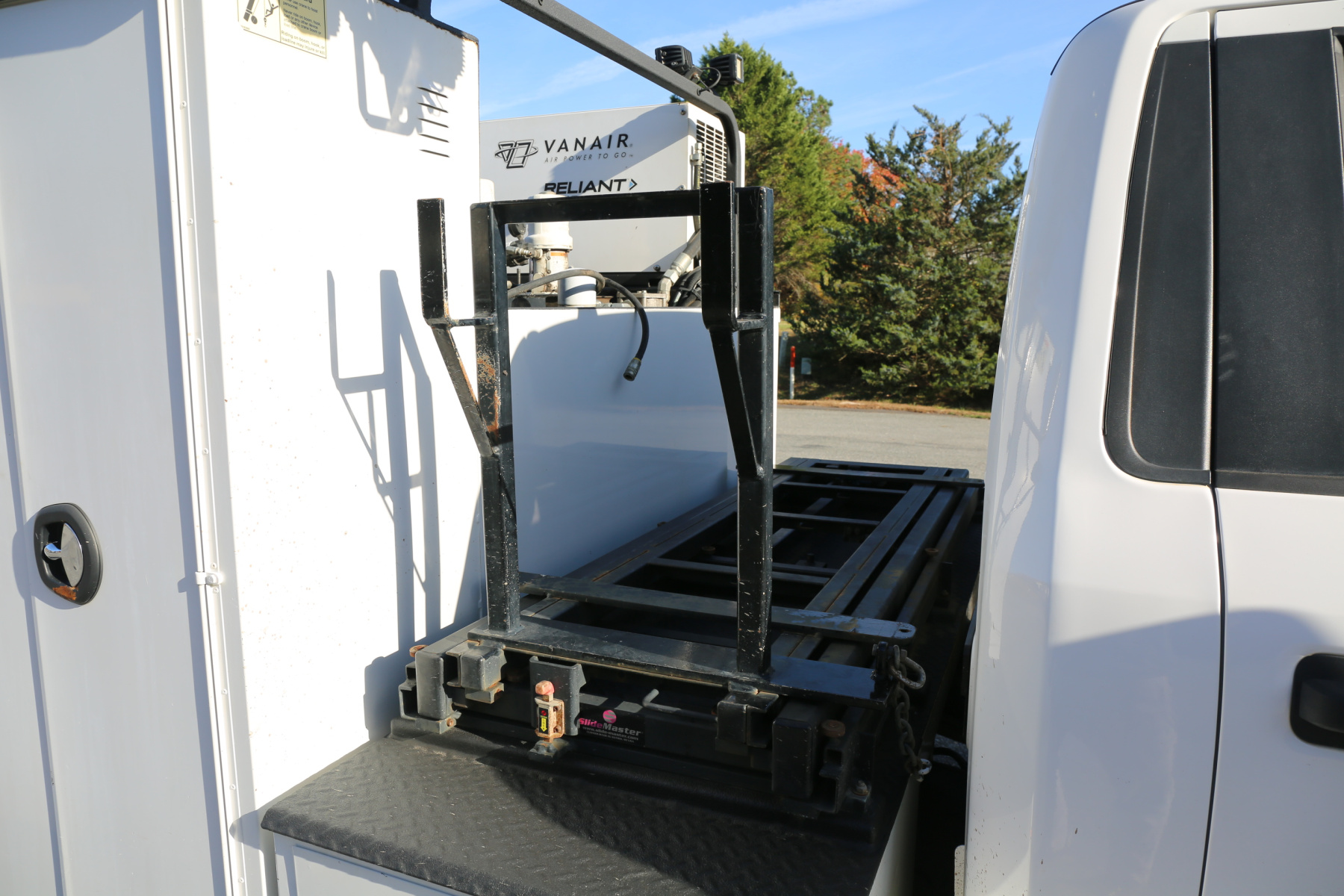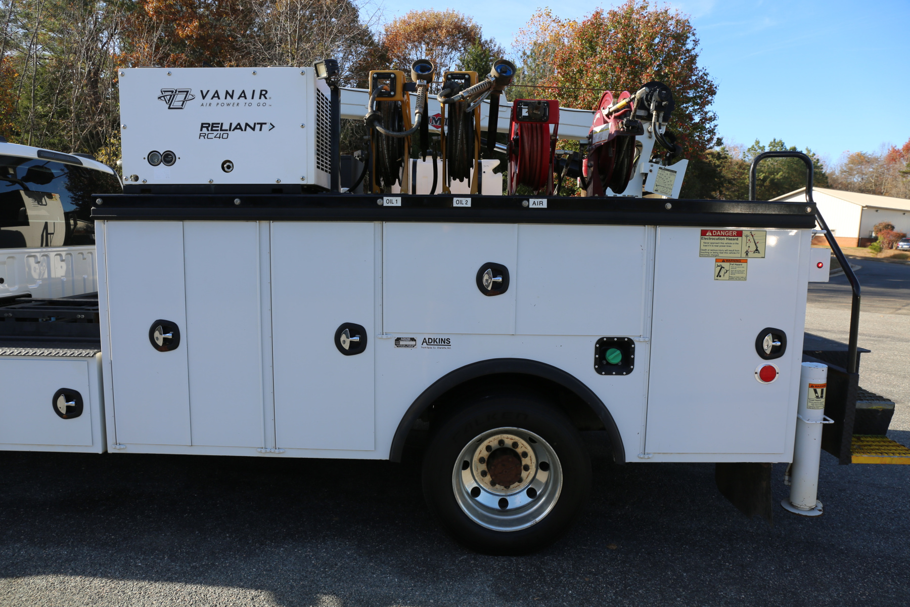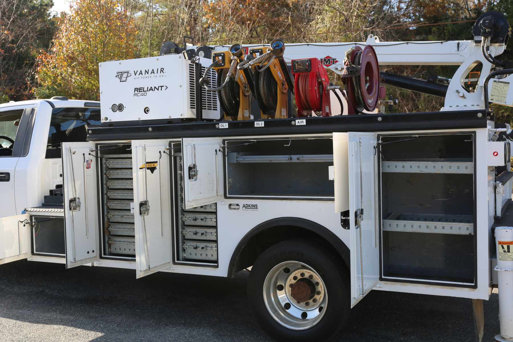 Inside the bed are two fresh oil tanks and a grease bucket, with fireball 300 air powered pumps, and oil reels and dispensers located behind the compressor.