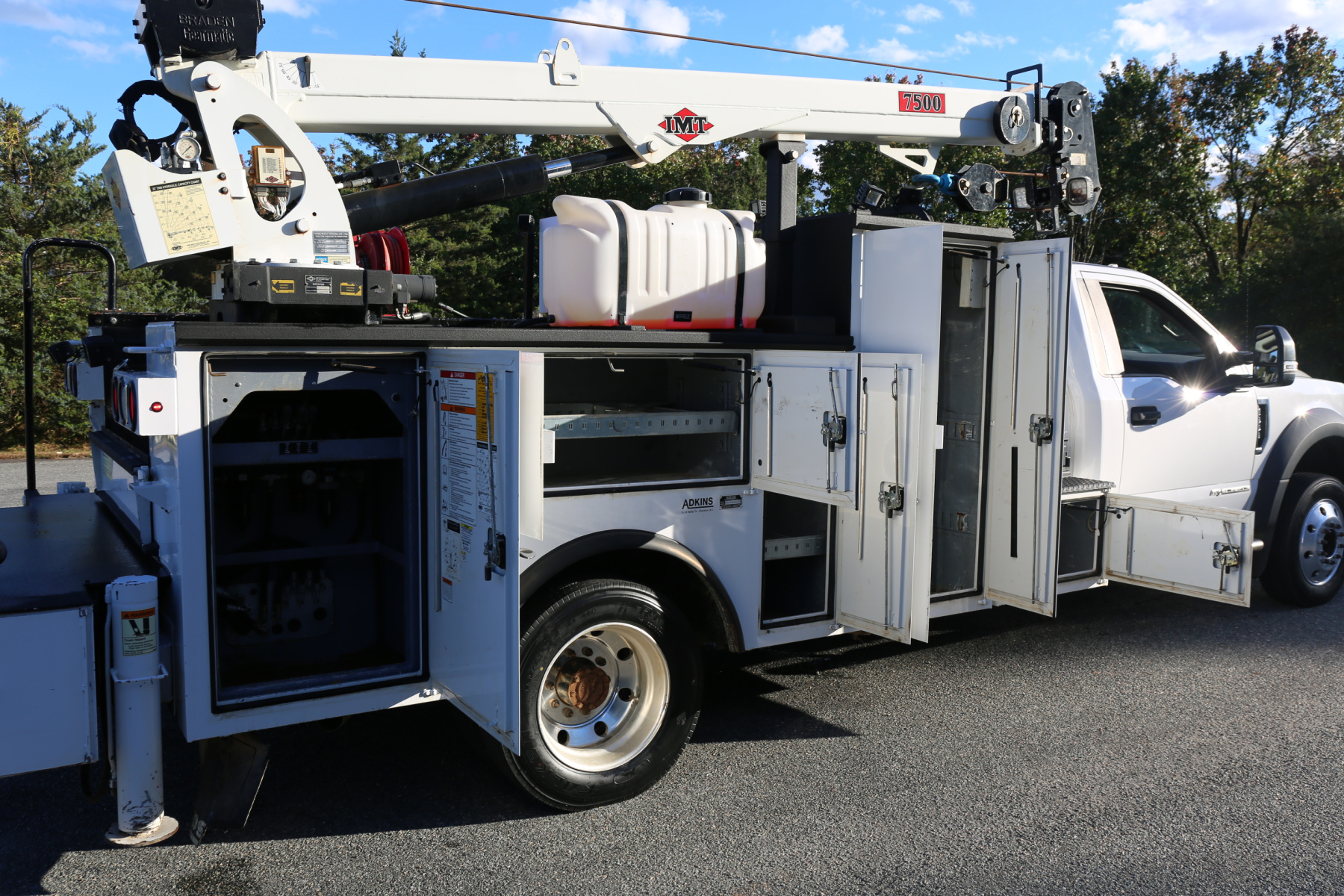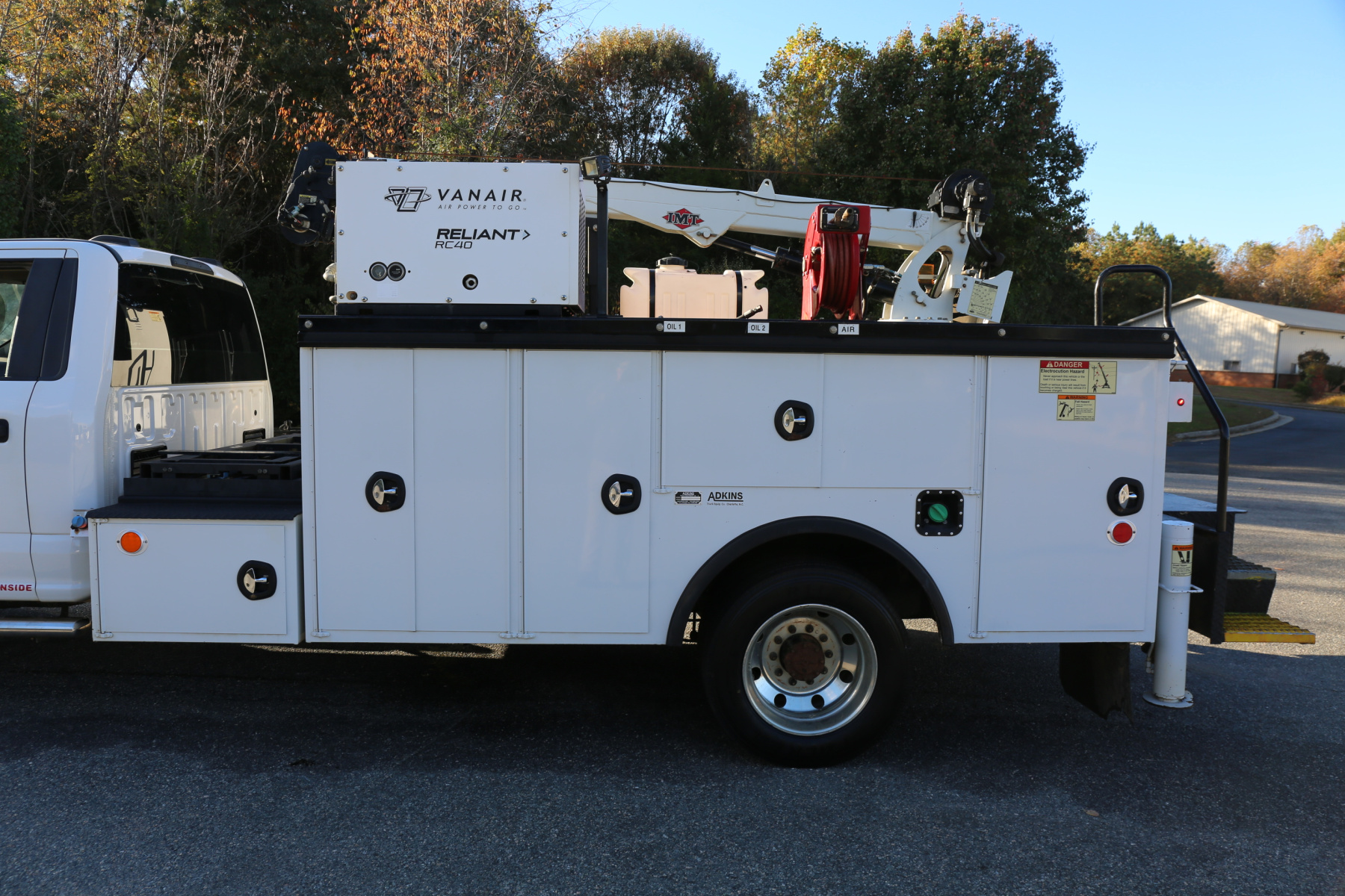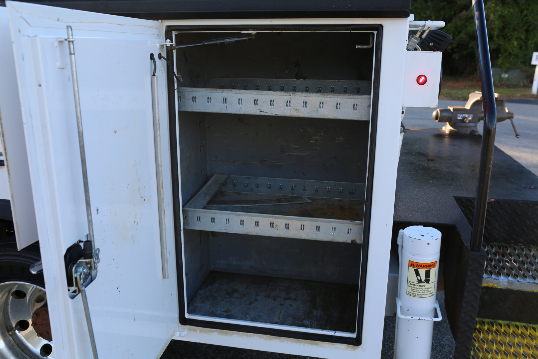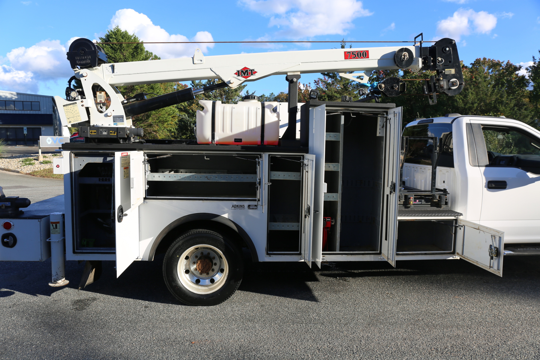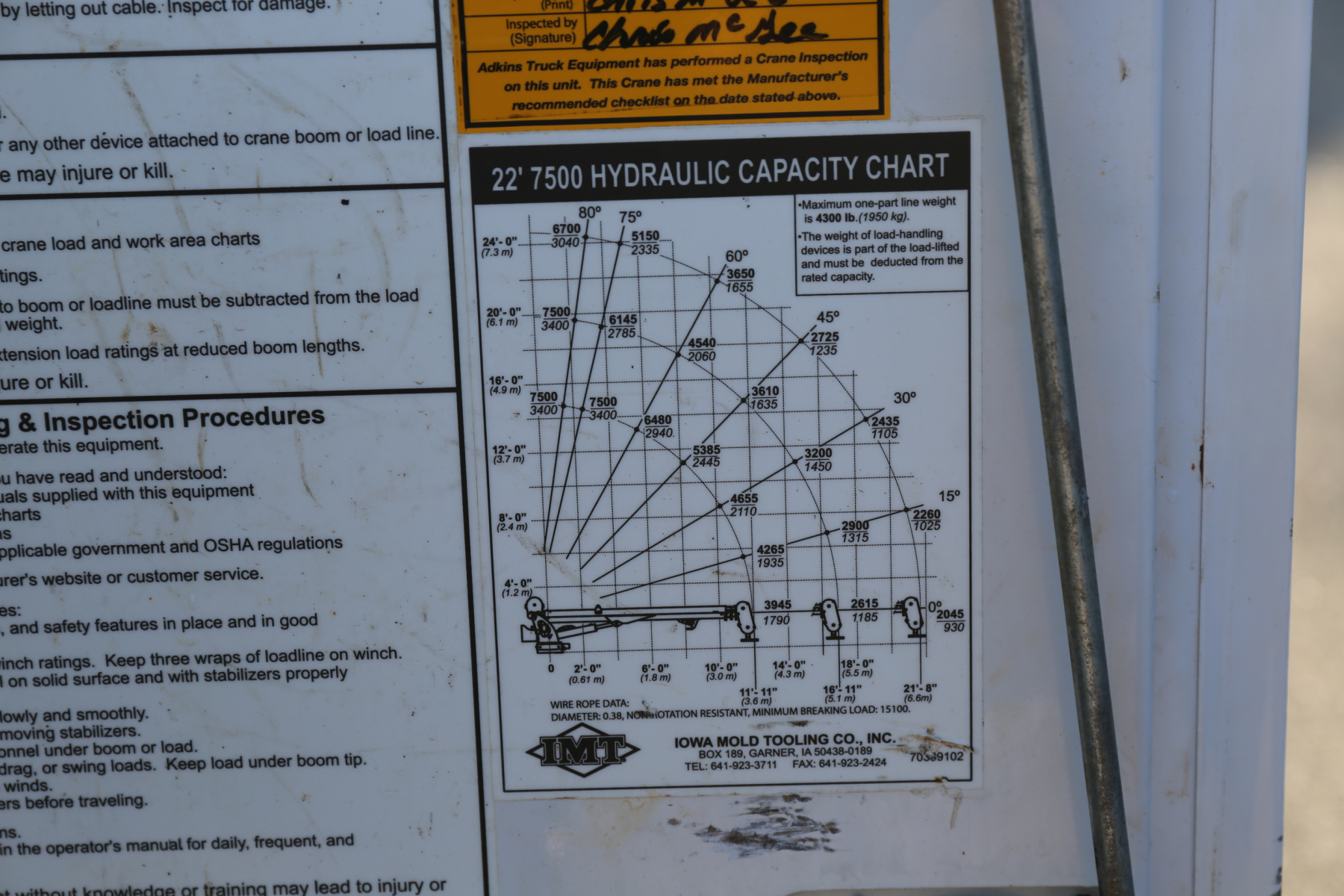 The crane is an IMT 7500-22 series, with a 7500# maximum lifting capacity and a two stage hydraulic extension out to 22′ of reach. Run off a factory remote, the remote controls the compressor and can also turn the truck on and off.