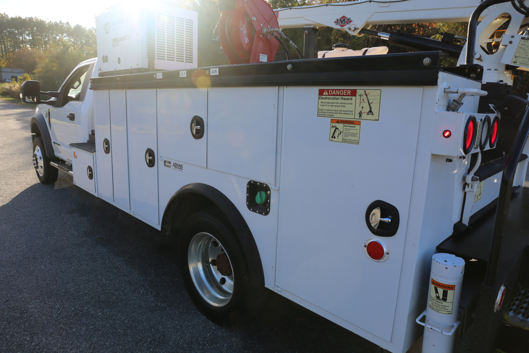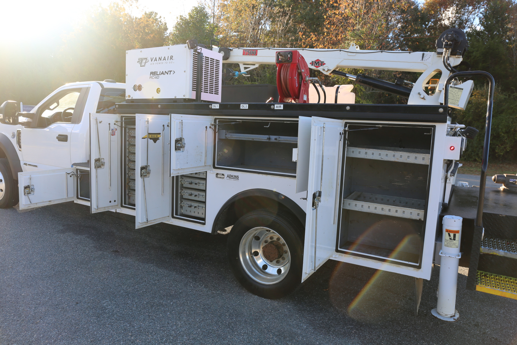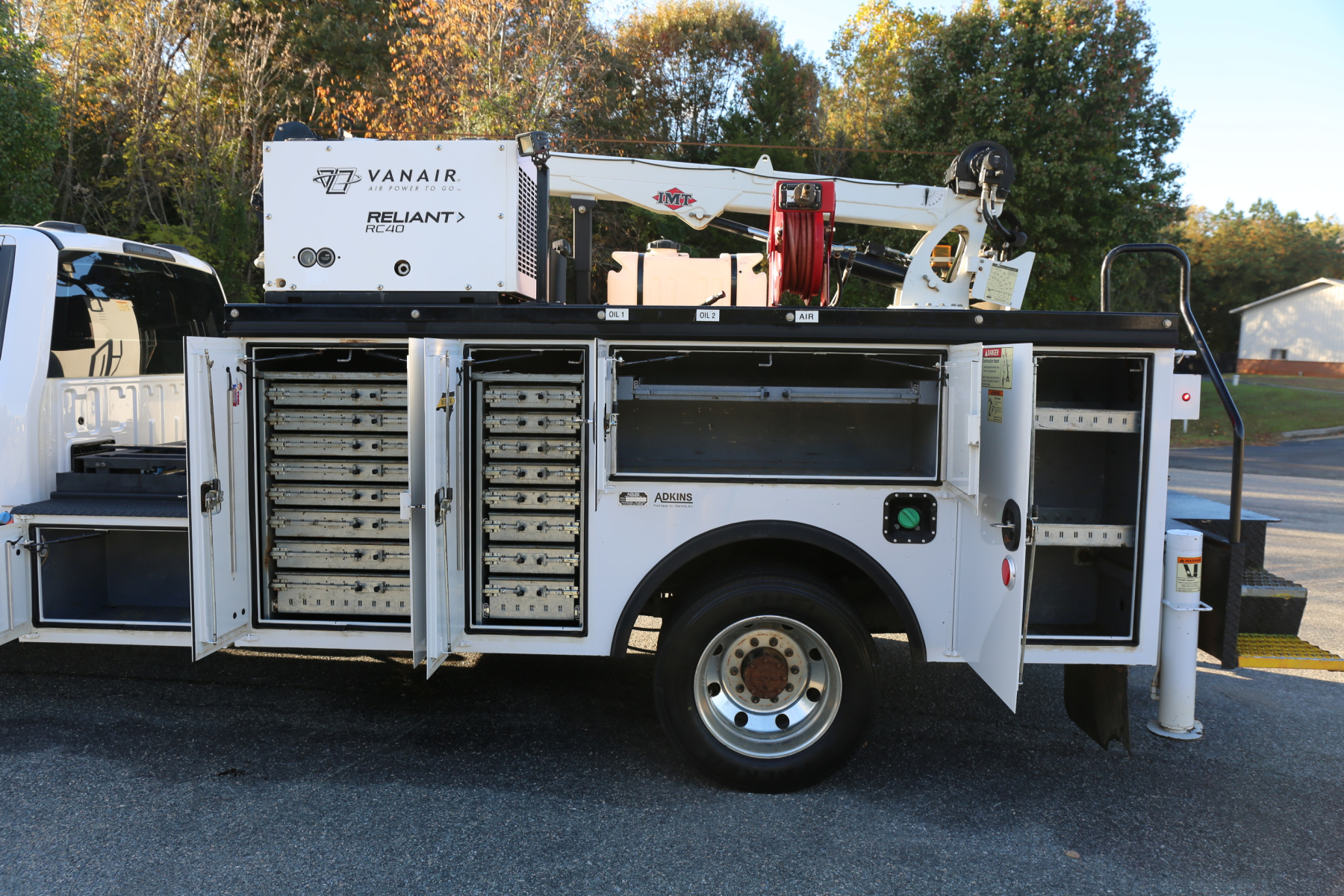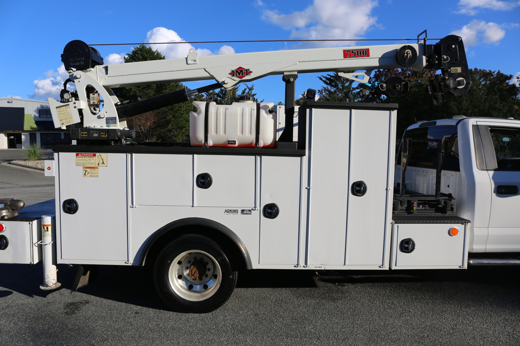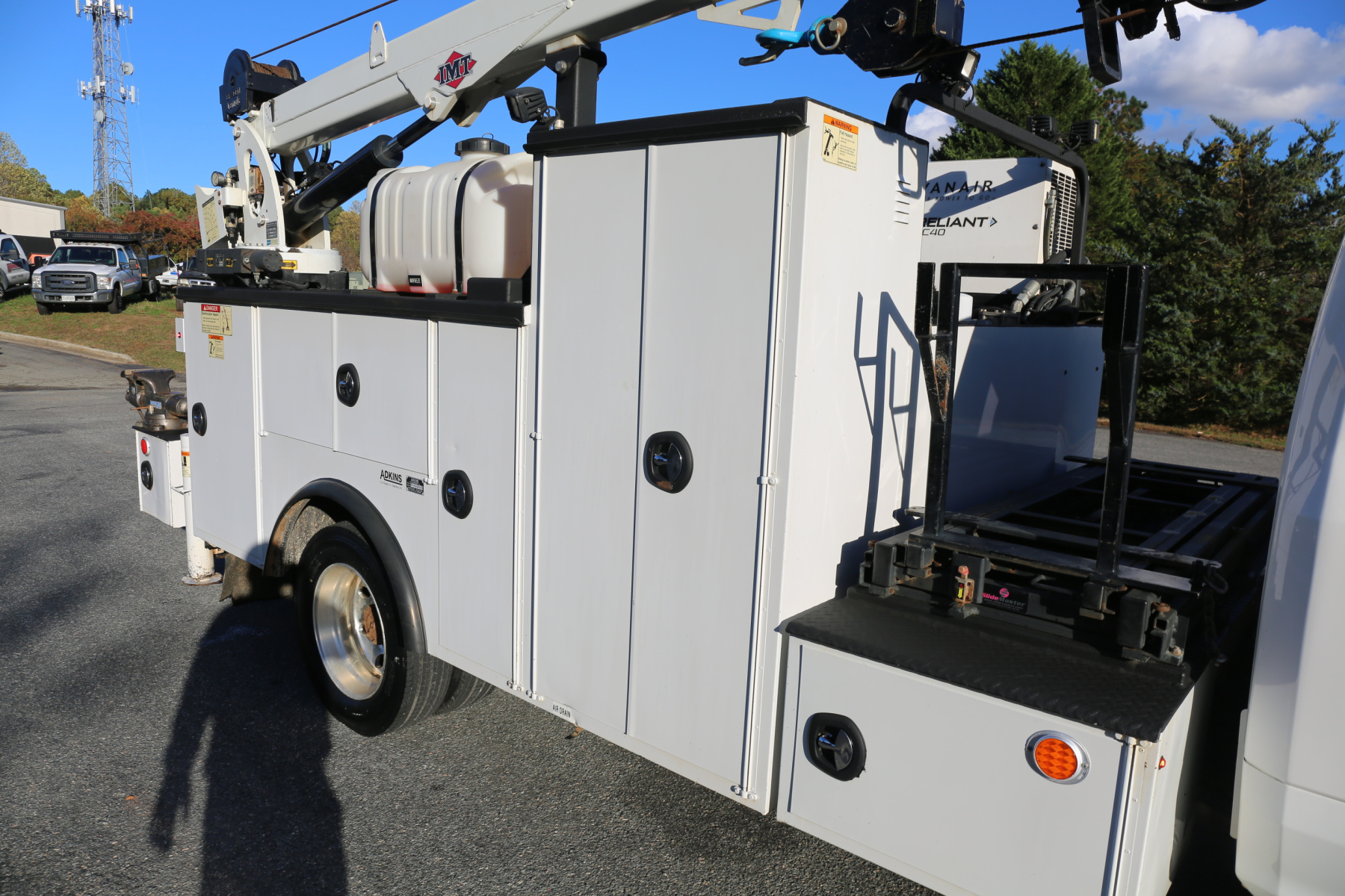 The crane is an IMT 7500-22 series, with a 7500# maximum lifting capacity and a two stage hydraulic extension out to 22′ of reach. Run off a factory remote, the remote controls the compressor and can also turn the truck on and off.