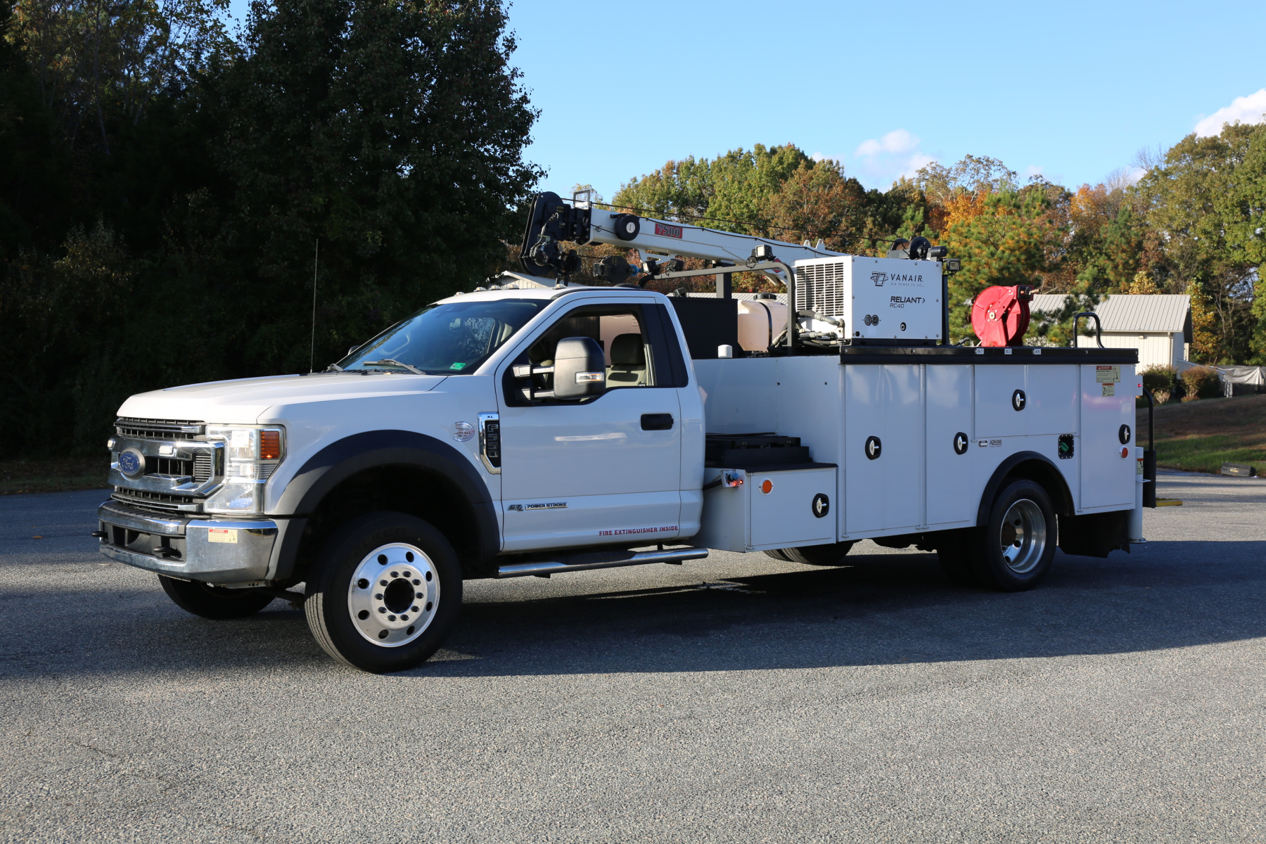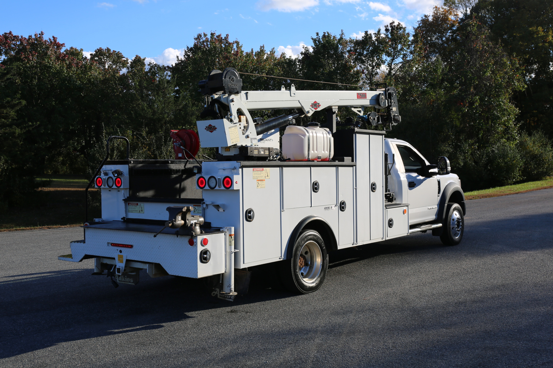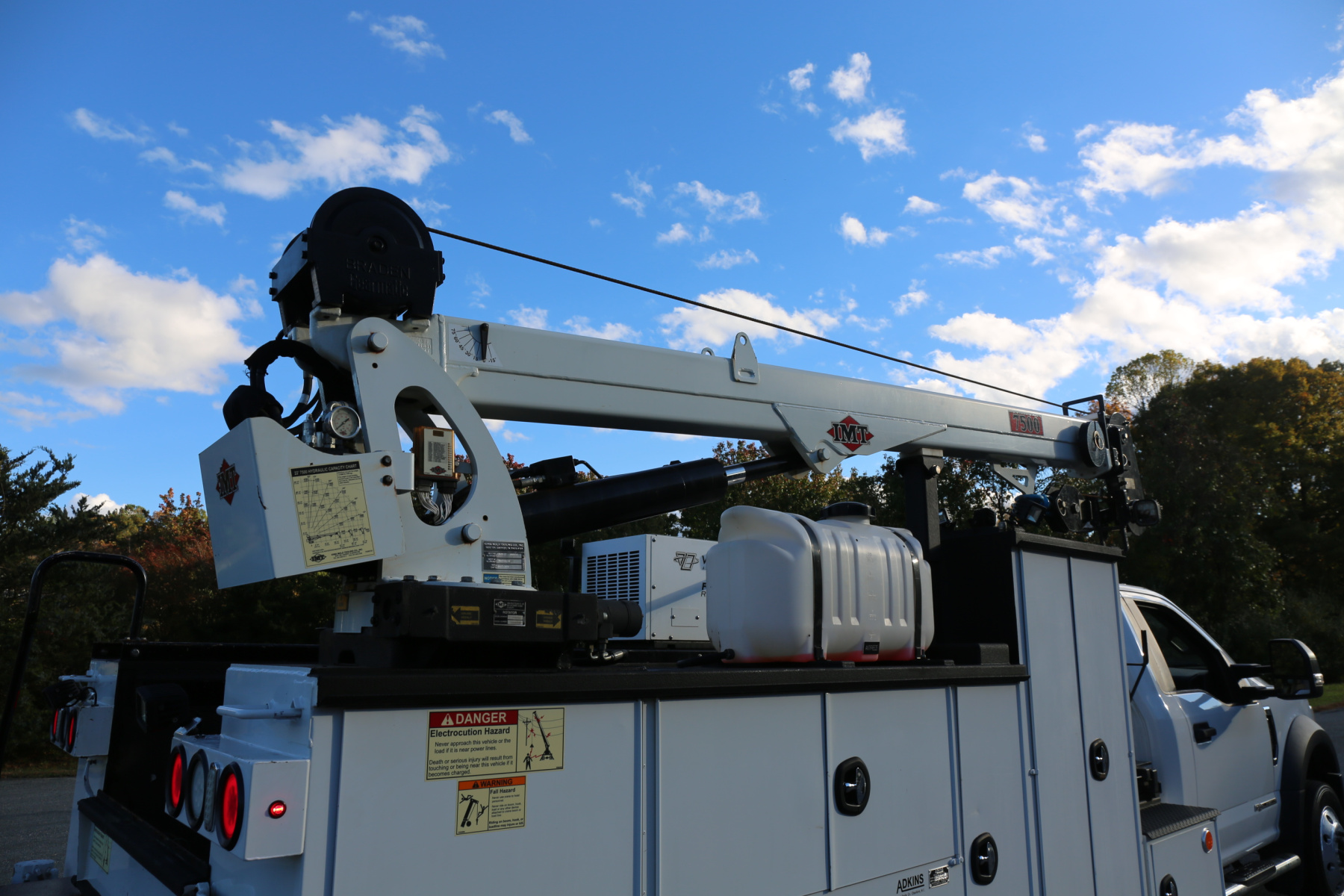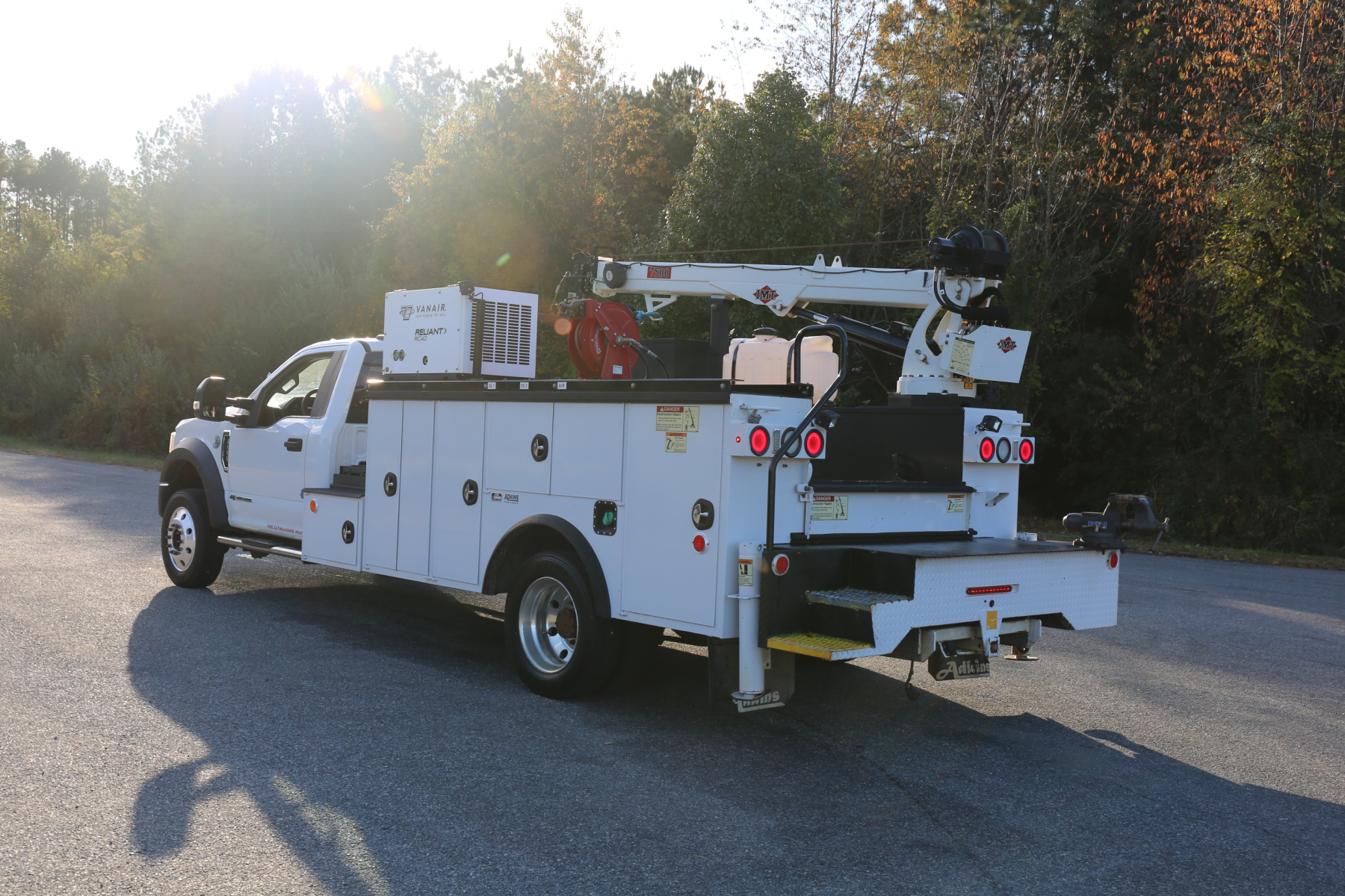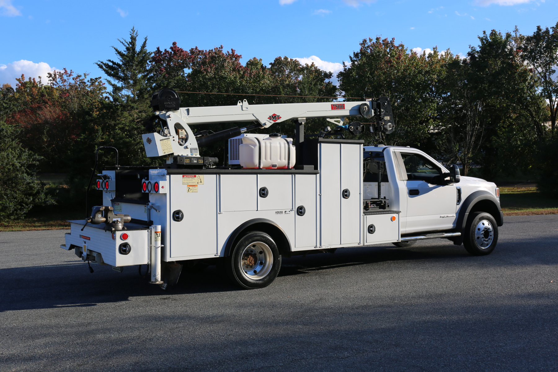 The crane is an IMT 7500-22 series, with a 7500# maximum lifting capacity and a two stage hydraulic extension out to 22′ of reach. Run off a factory remote, the remote controls the compressor and can also turn the truck on and off.