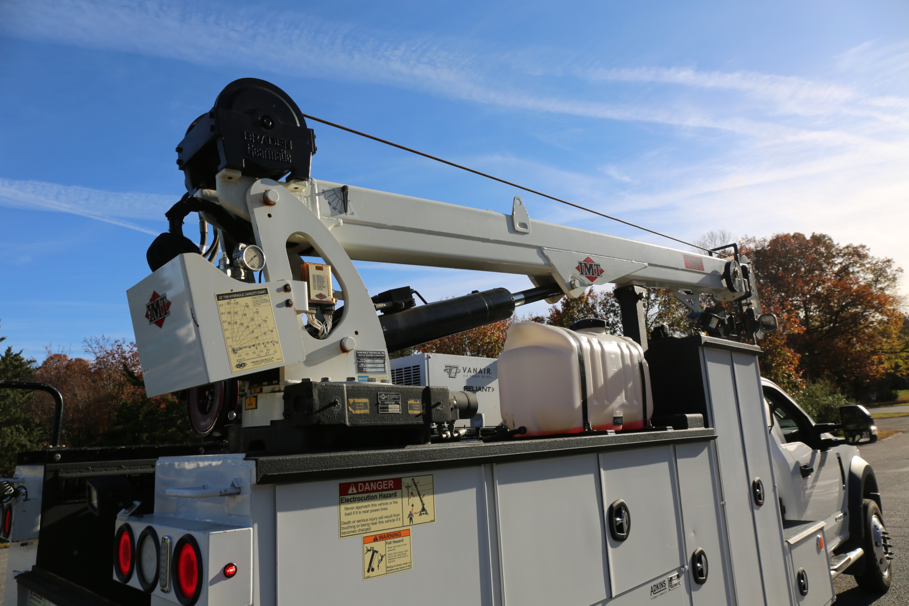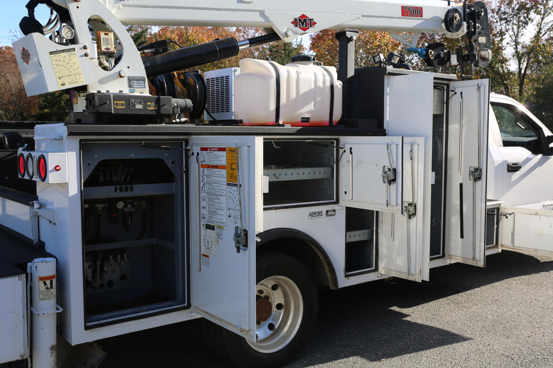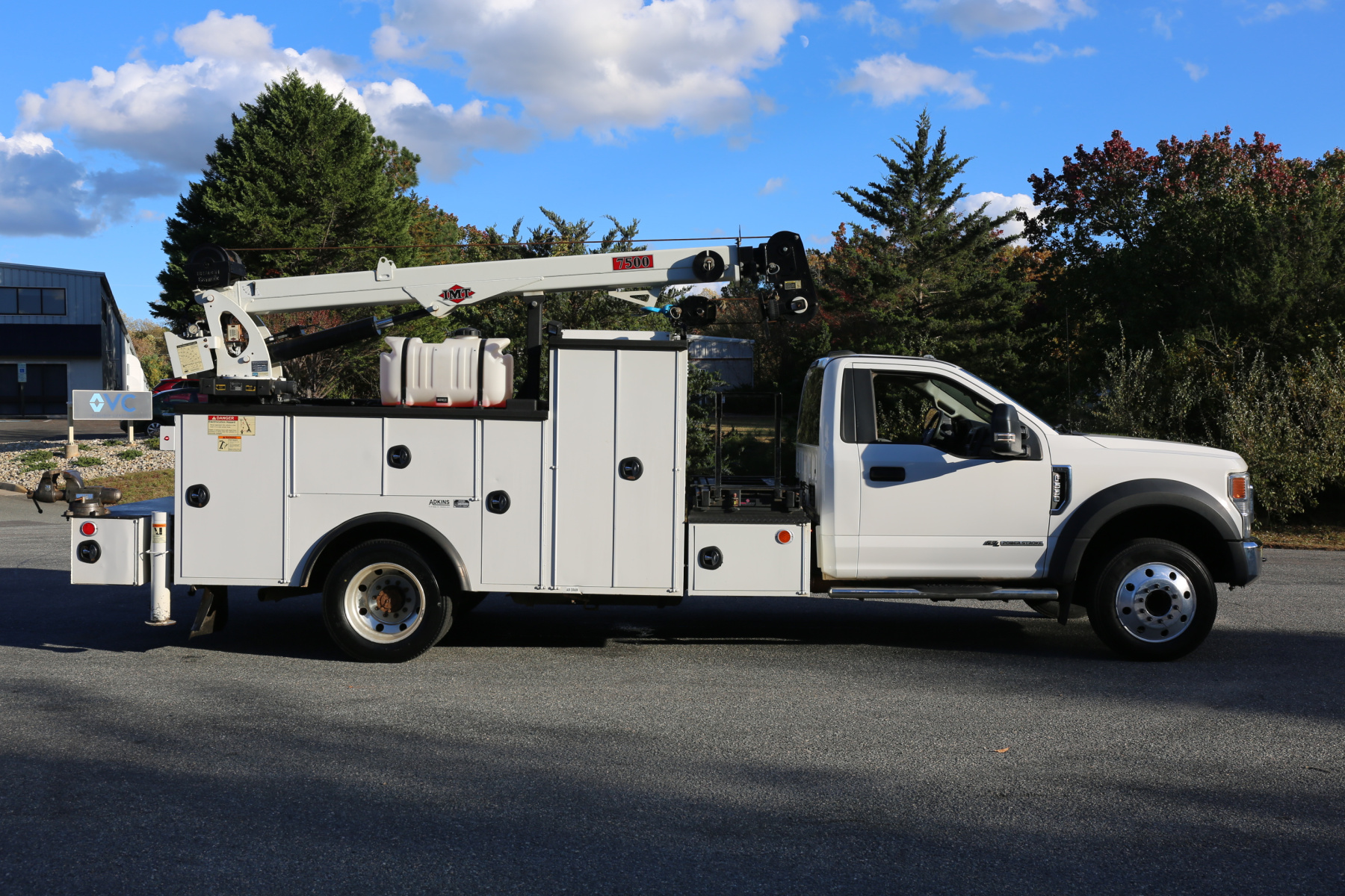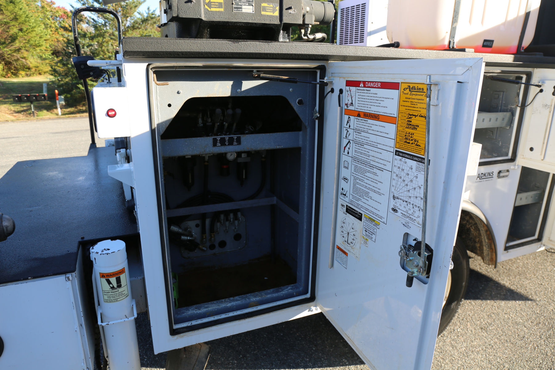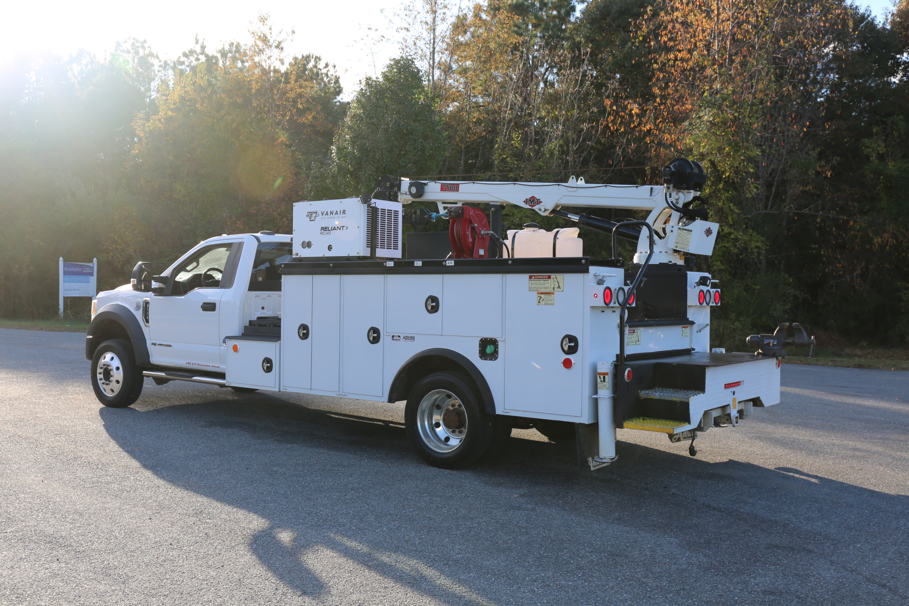 The crane is an IMT 7500-22 series, with a 7500# maximum lifting capacity and a two stage hydraulic extension out to 22′ of reach. Run off a factory remote, the remote controls the compressor and can also turn the truck on and off.