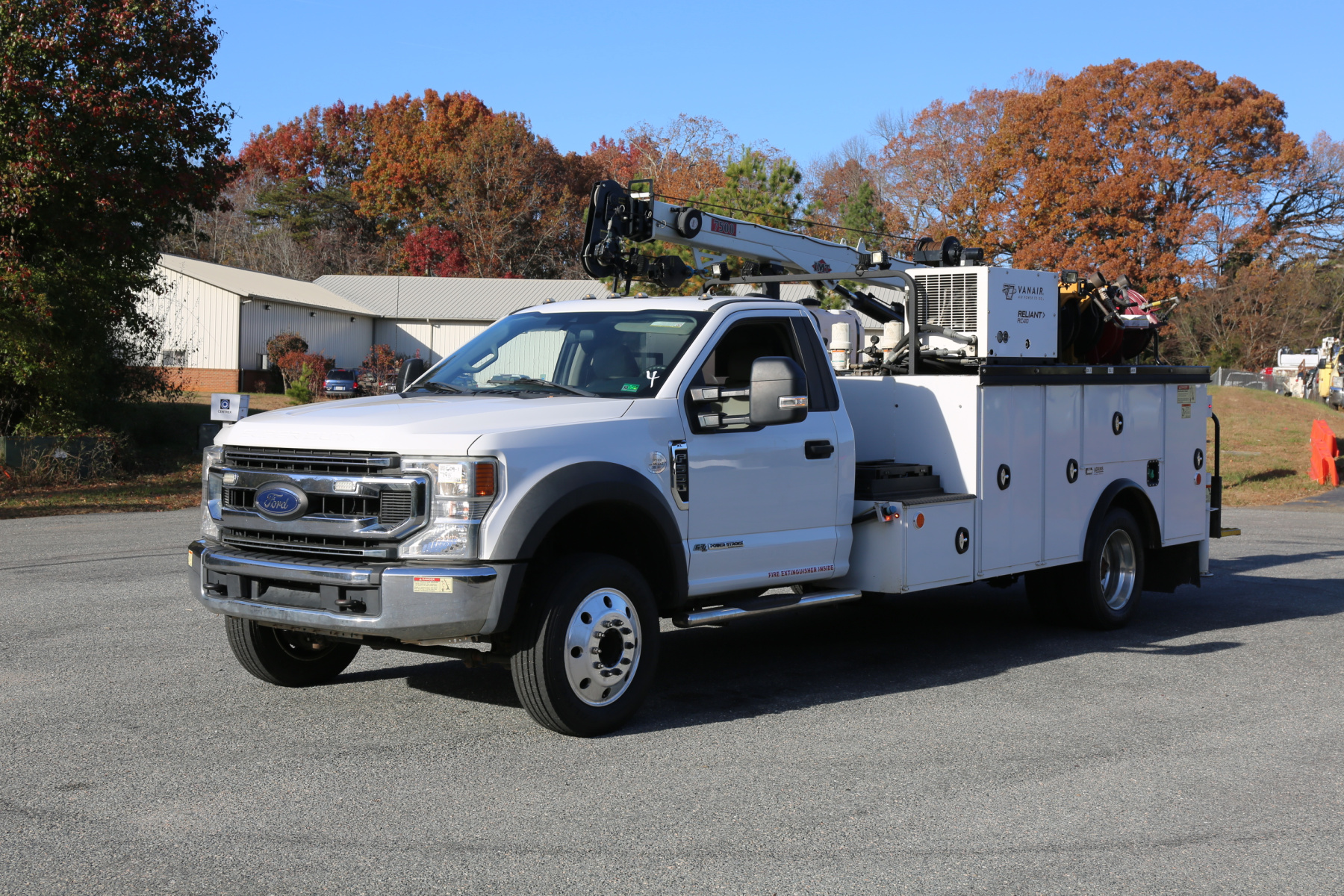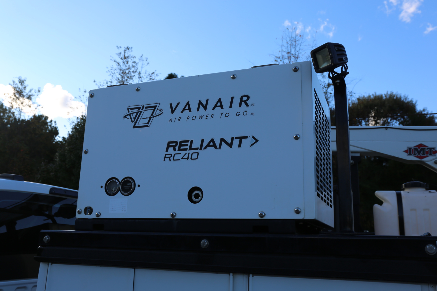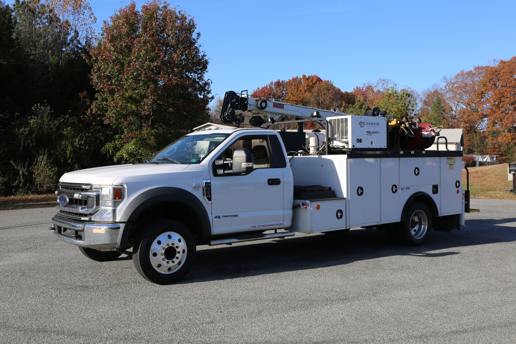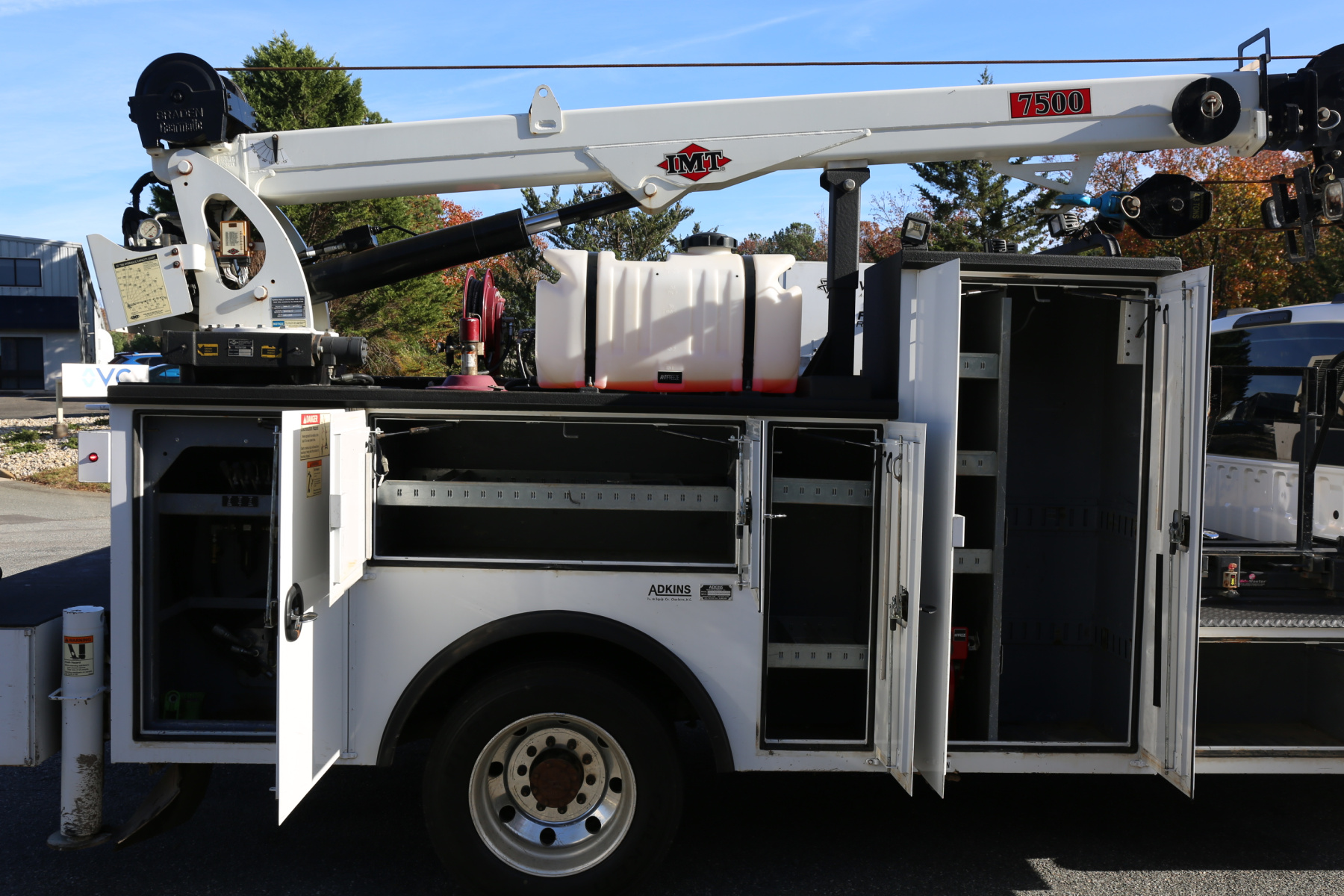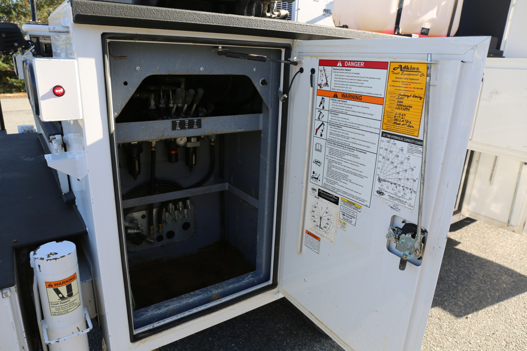 The crane is an IMT 7500-22 series, with a 7500# maximum lifting capacity and a two stage hydraulic extension out to 22′ of reach. Run off a factory remote, the remote controls the compressor and can also turn the truck on and off.