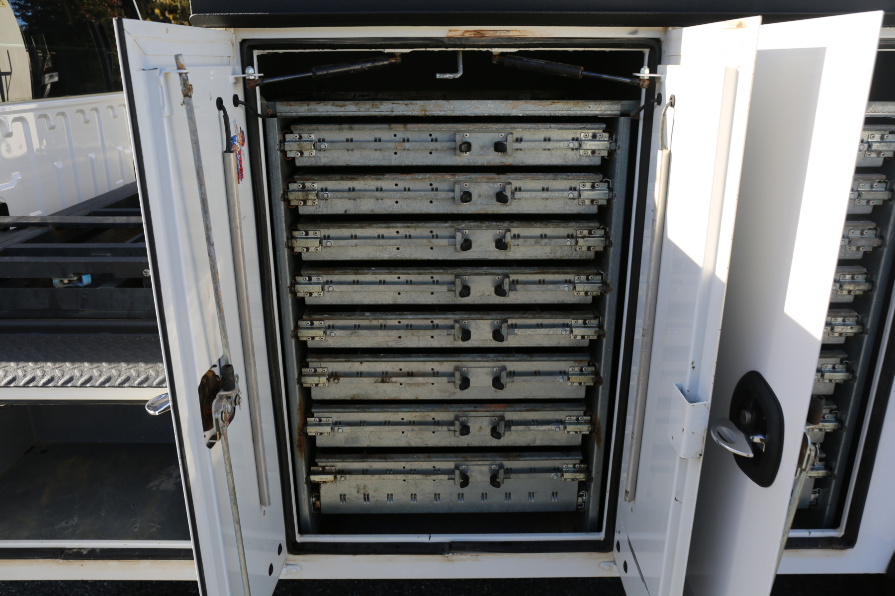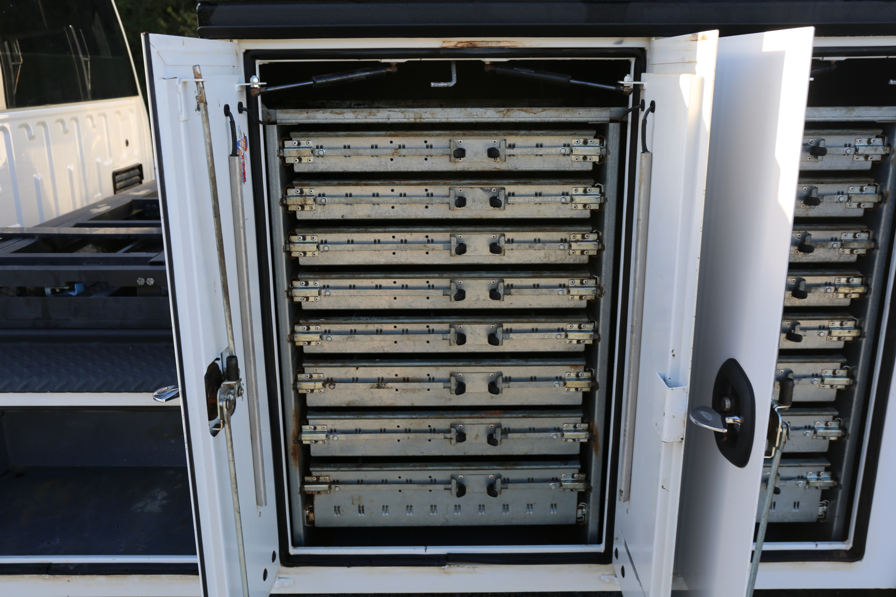 Between the bed and truck is a 3′ welder platform, with a sliding welder bracket and a storage bin underneath. The D1 compartment has a full set of eight drawers. The D2 compartment has another full set of eight drawers. One sliding shelf over the driver wheel well. Two shelves in the D4 compartment.