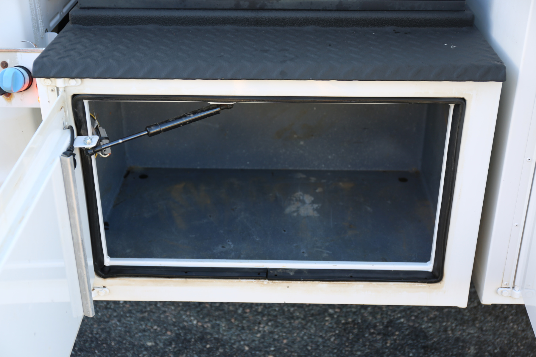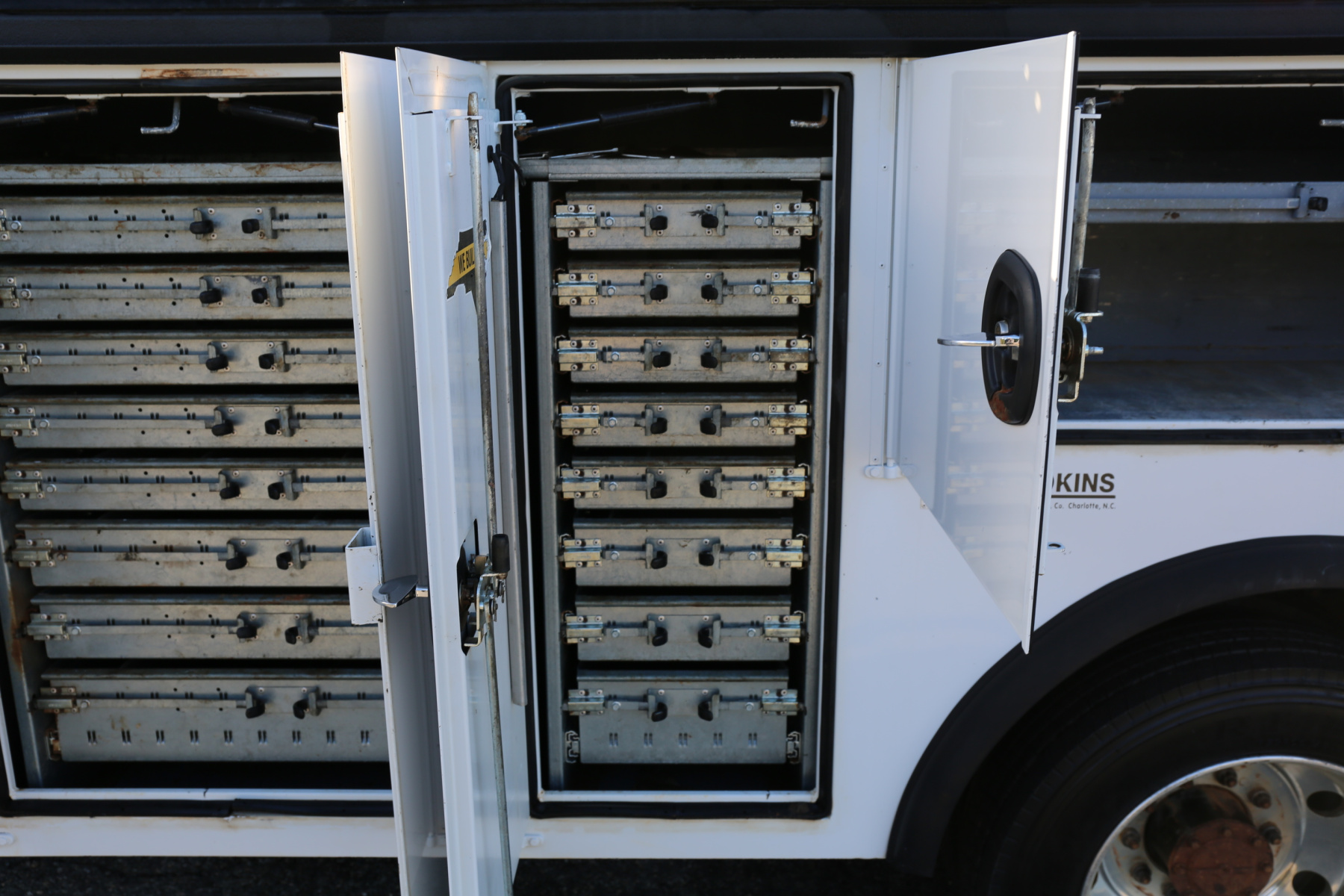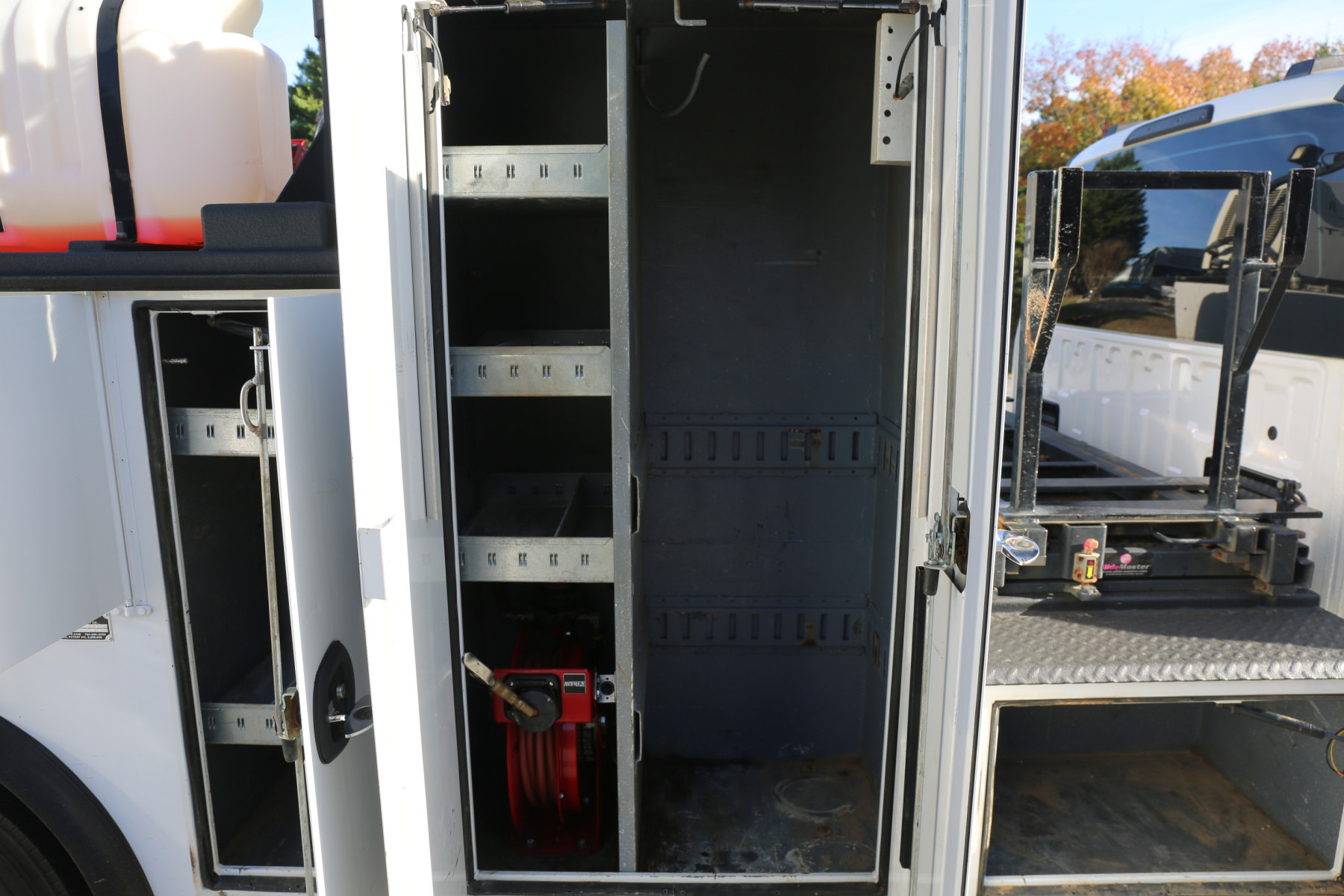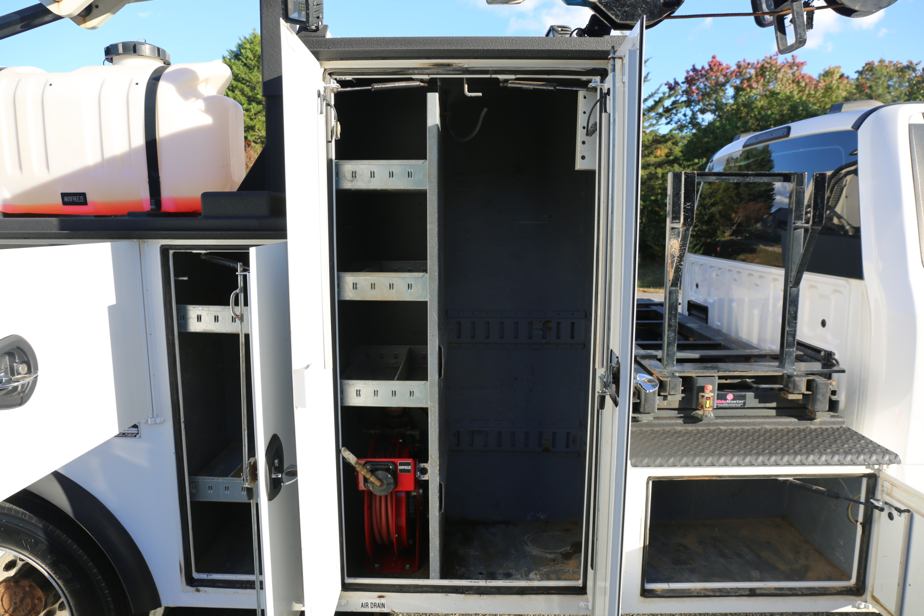 The crane compartment houses your air regulator and drier, and the outrigger control levers. One shelf over the passenger wheel well. Two shelves in the P2 compartment. Three shelves in the P1 compartment, with a space in front for torch bottles. E track inside of this compartment for securing bottles, as well as an antifreeze reel for the antirfreeze tank mounted under the crane.