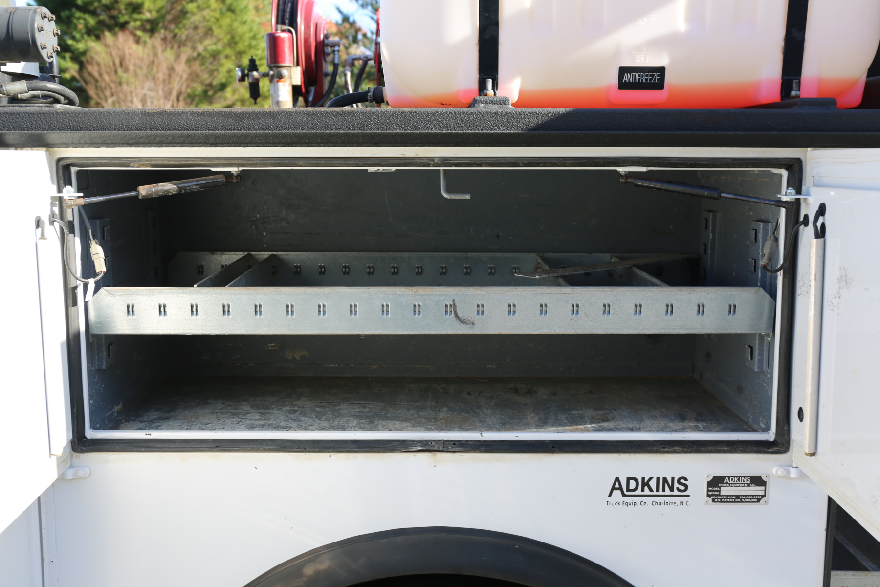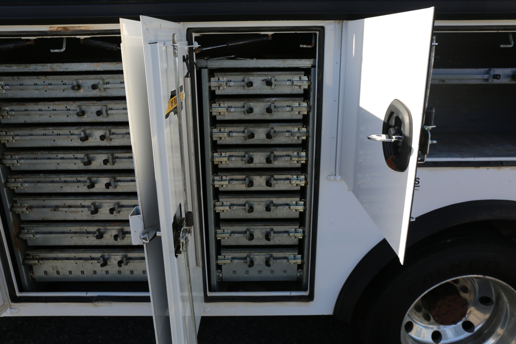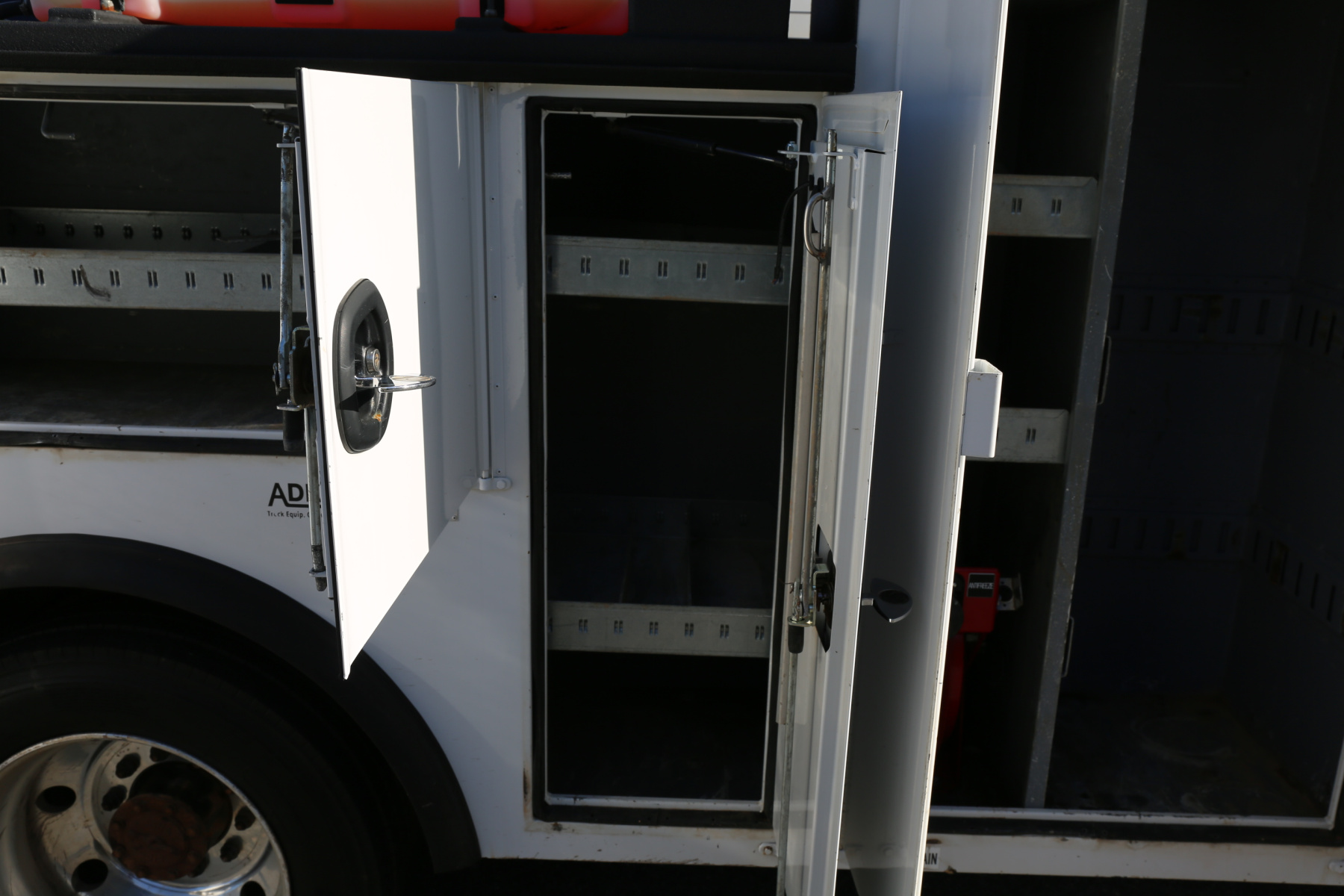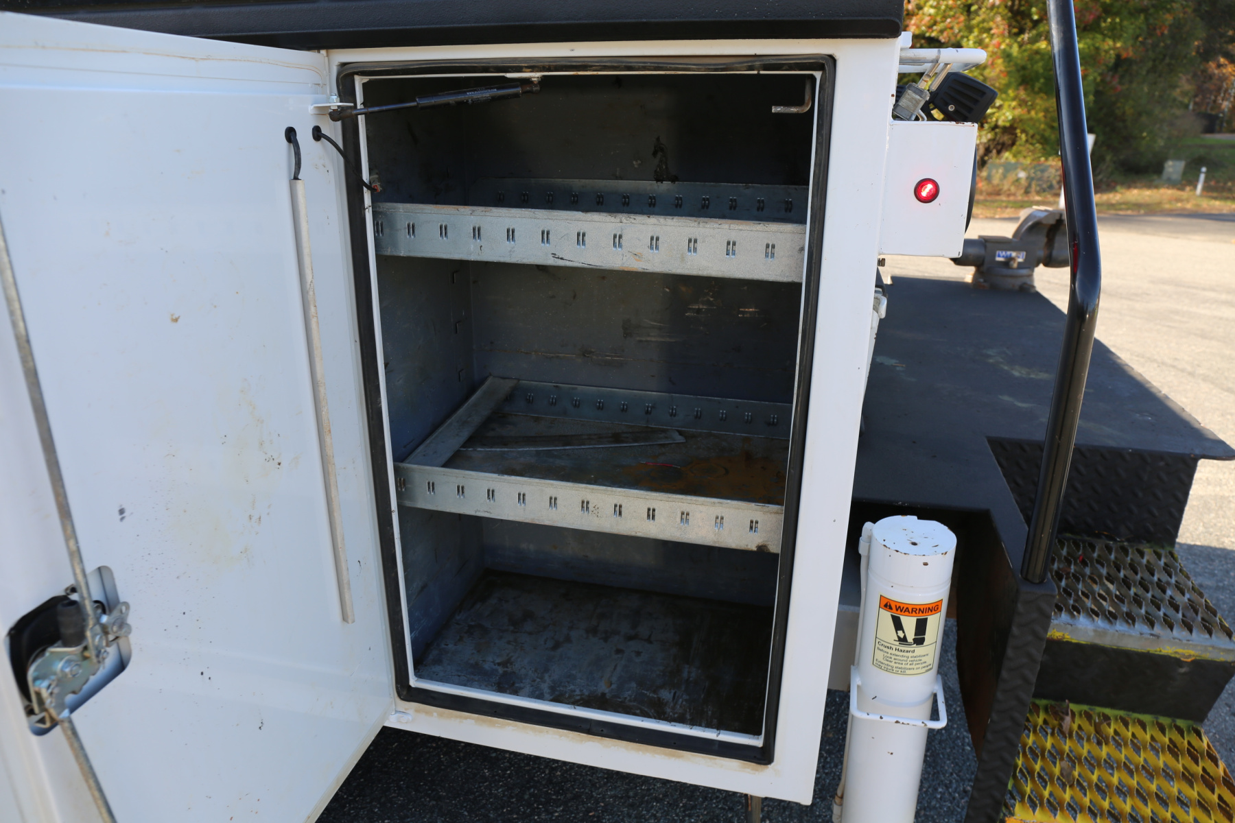 The crane compartment houses your air regulator and drier, and the outrigger control levers. One shelf over the passenger wheel well. Two shelves in the P2 compartment. Three shelves in the P1 compartment, with a space in front for torch bottles. E track inside of this compartment for securing bottles, as well as an antifreeze reel for the antirfreeze tank mounted under the crane.