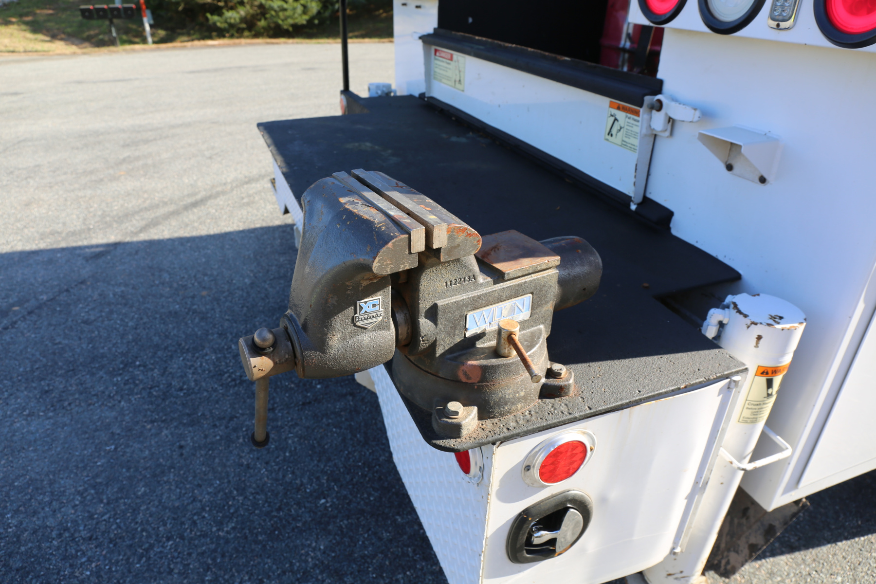 Work bench rear bumper with a bin on the passenger side, and steps on the driver side. Working Wilton bullet Vise, hydraulic outriggers, and a tow hitch receiver.