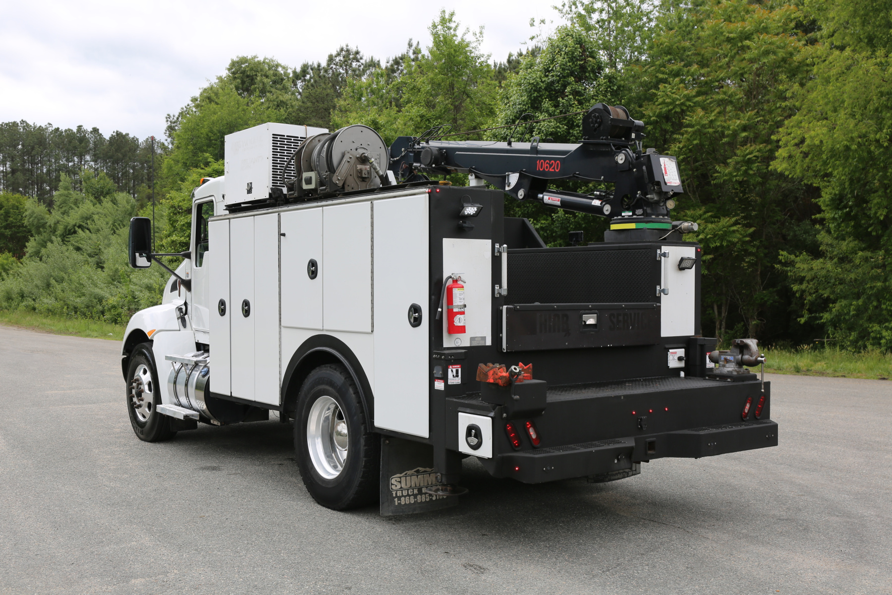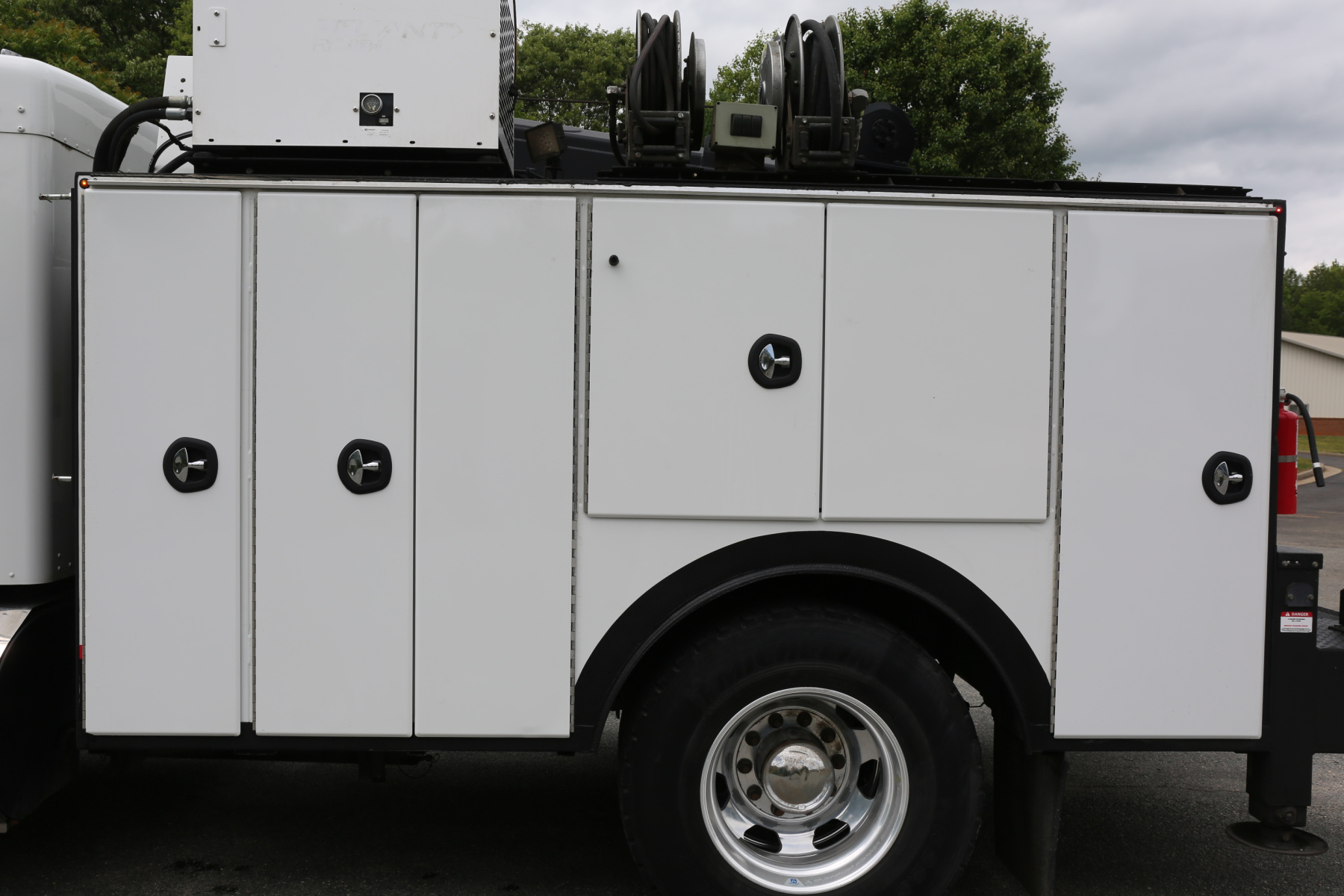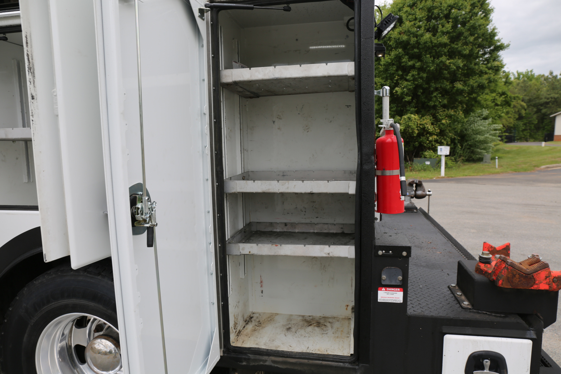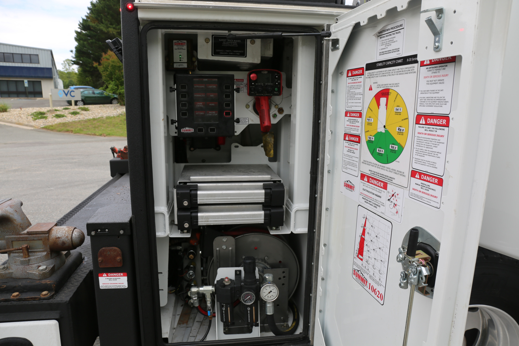 Equipped with a same model year 11′ Summit service body, a 10620 series Summit crane and factory wireless remote, a Vanair RC40 hydraulic compressor, 40g waste oil and 40g fresh oil tanks and reels, hydraulic outriggers, and one set of drawers. Very well equipped truck.