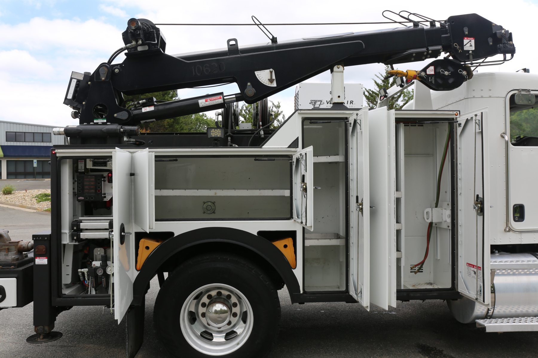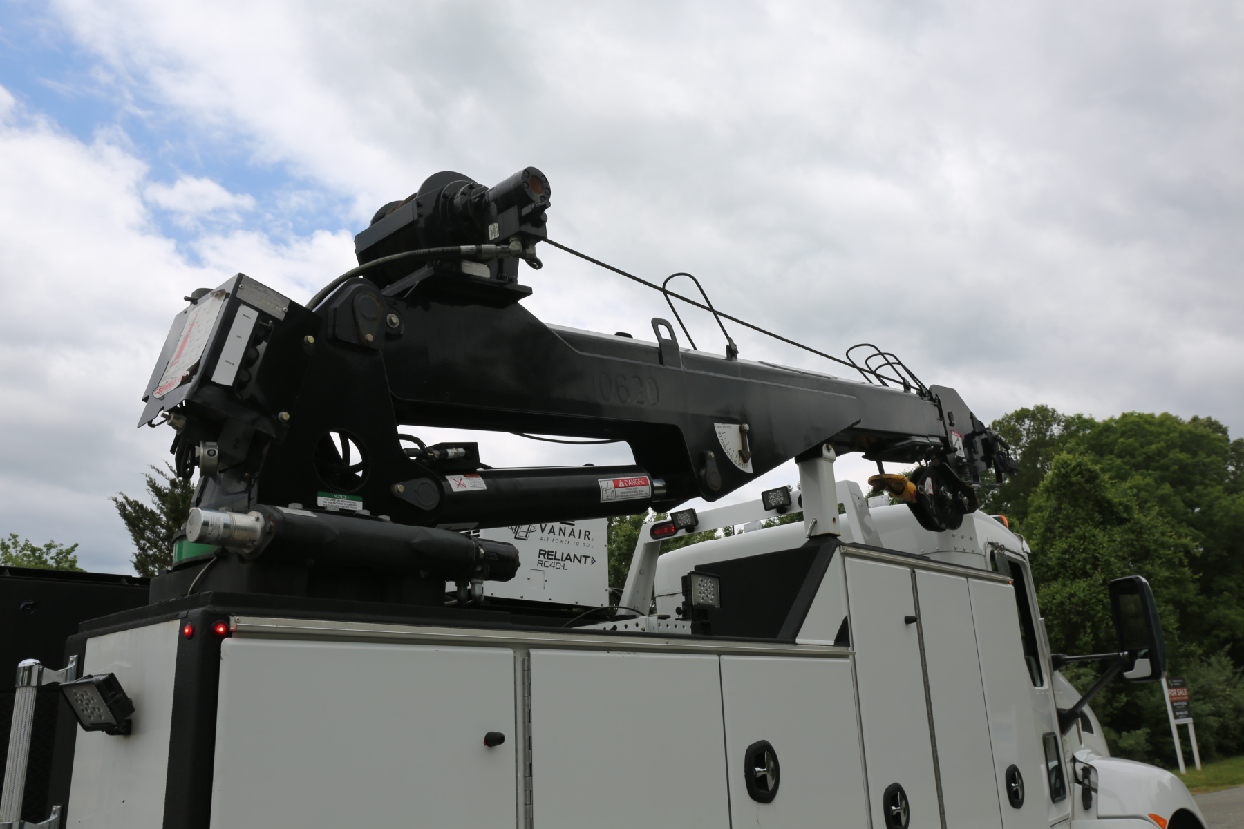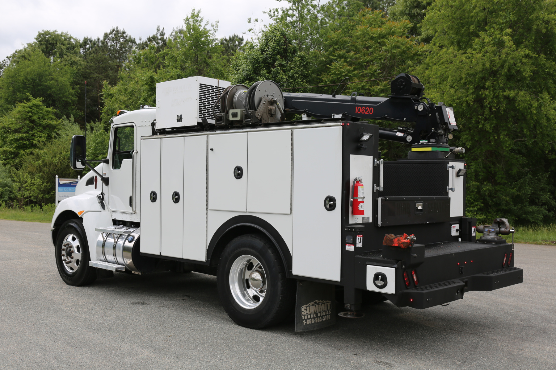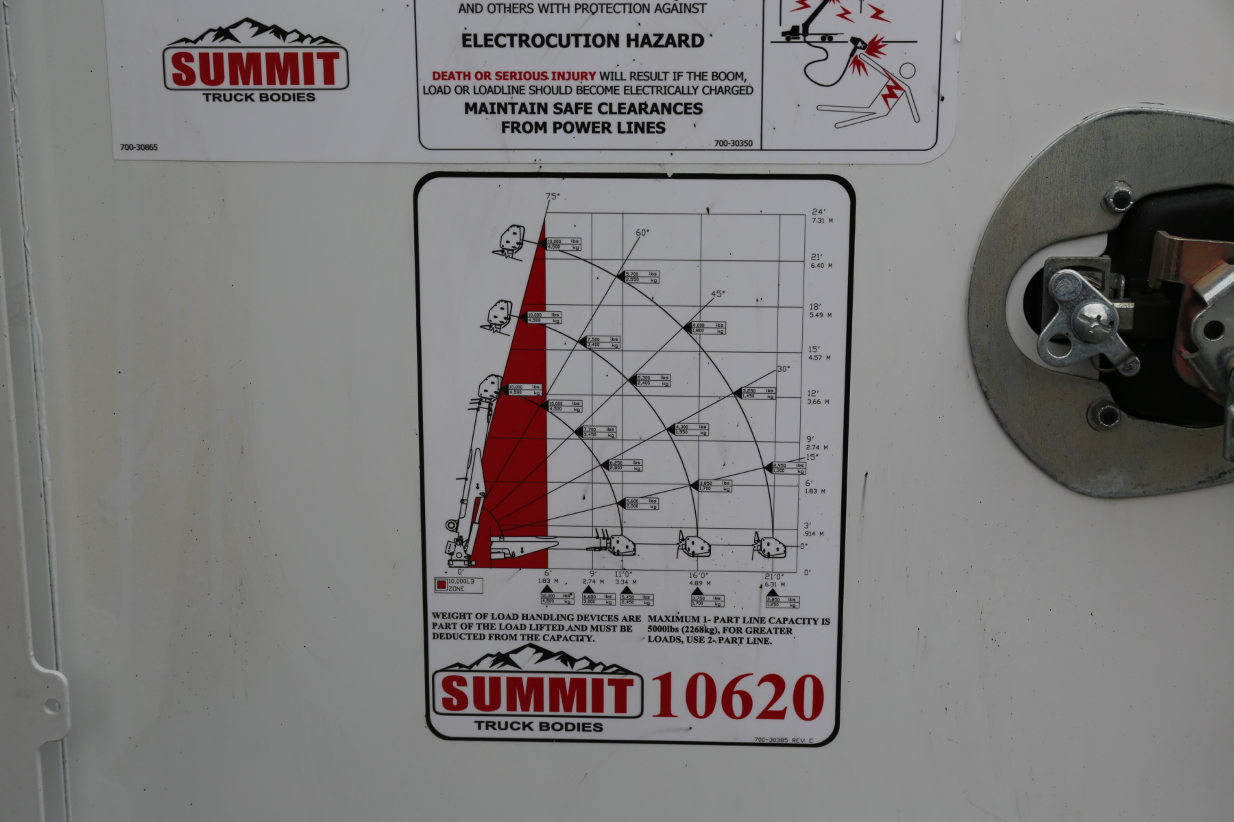 The crane is a Summit 10620 with a 10,000# maximum lifting capacity and a two stage extension out to 20′ of reach. Run off a factory wireless remote, the remote can turn the truck on and off and controls the compressor as well.