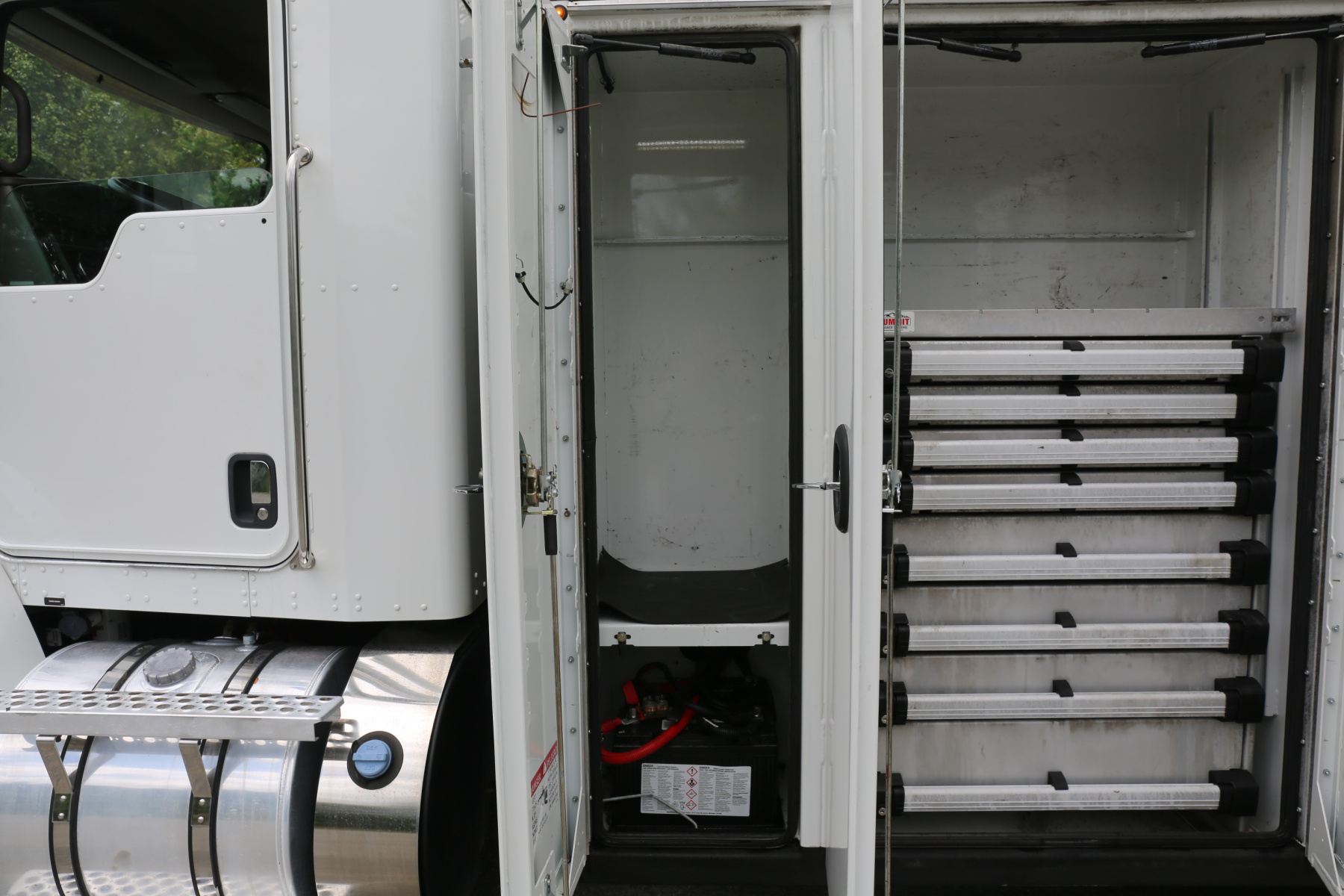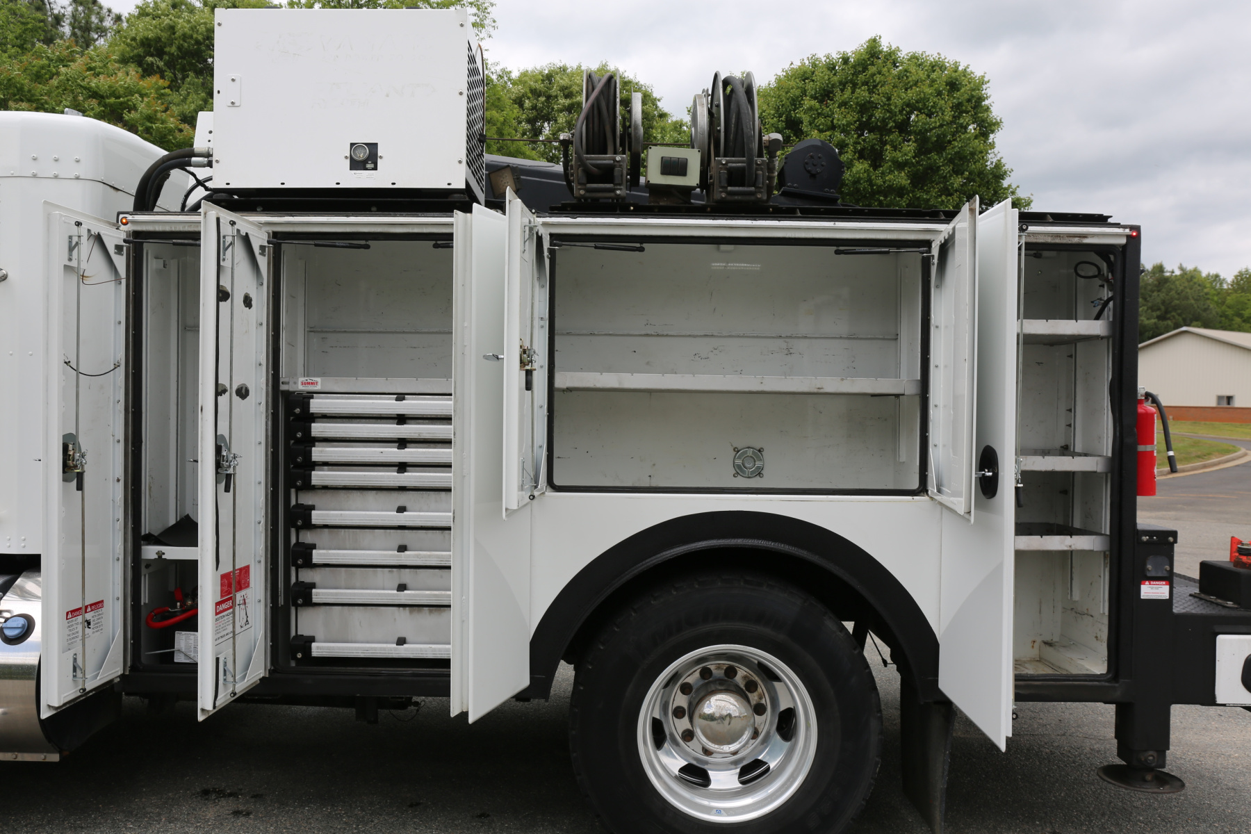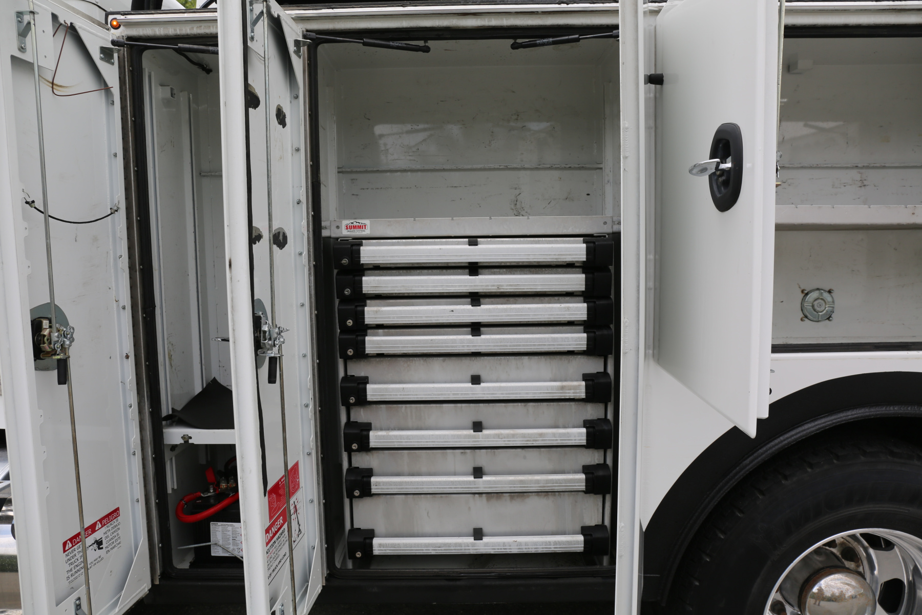 The D1 compartment houses the truck batteries, and has one shelf. The D2 compartment has a set of Summit drawers, eight total, and one shelf. The driver wheel well compartment has one shelf. Three shelves in the driver rear compartment.