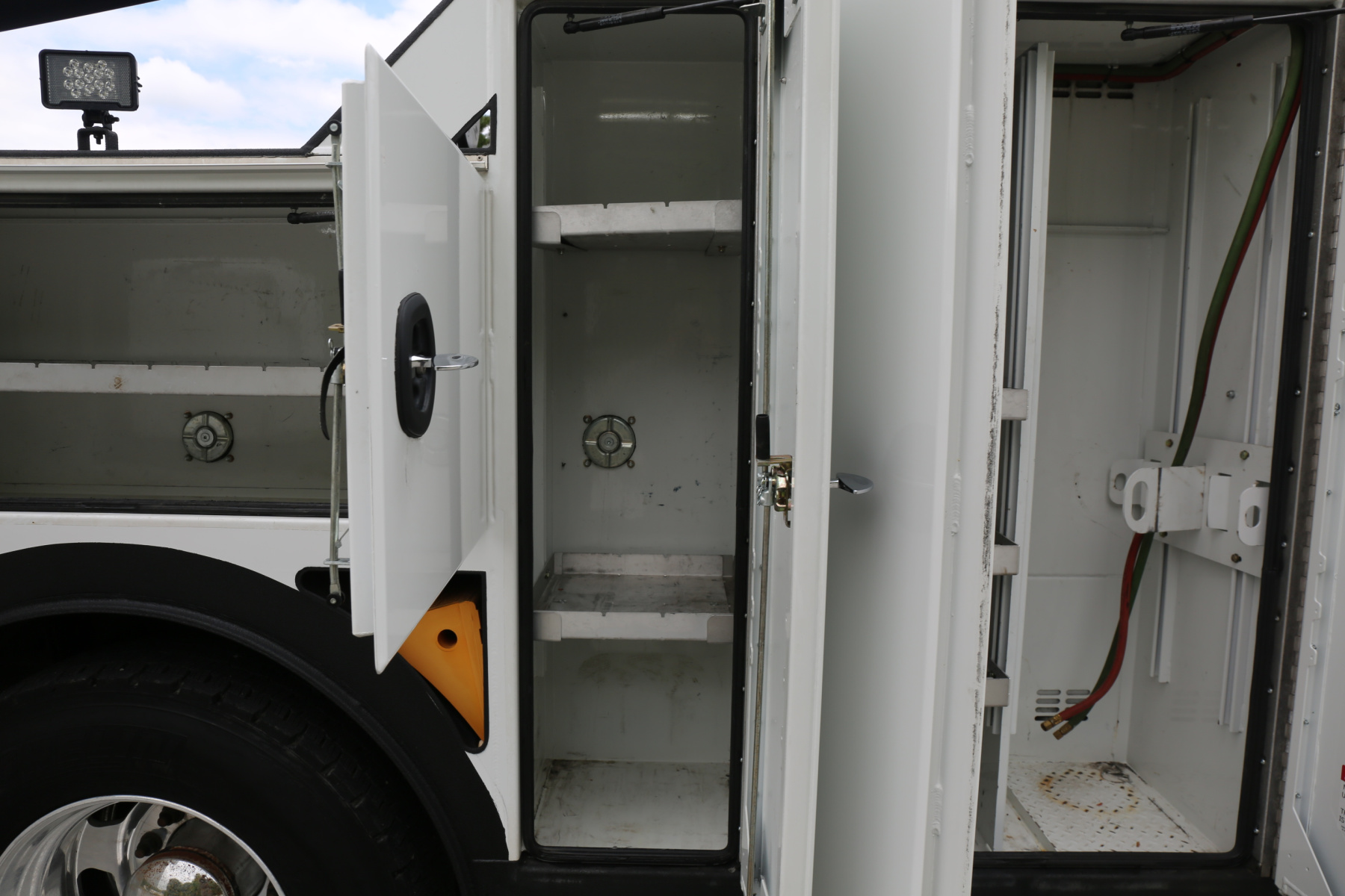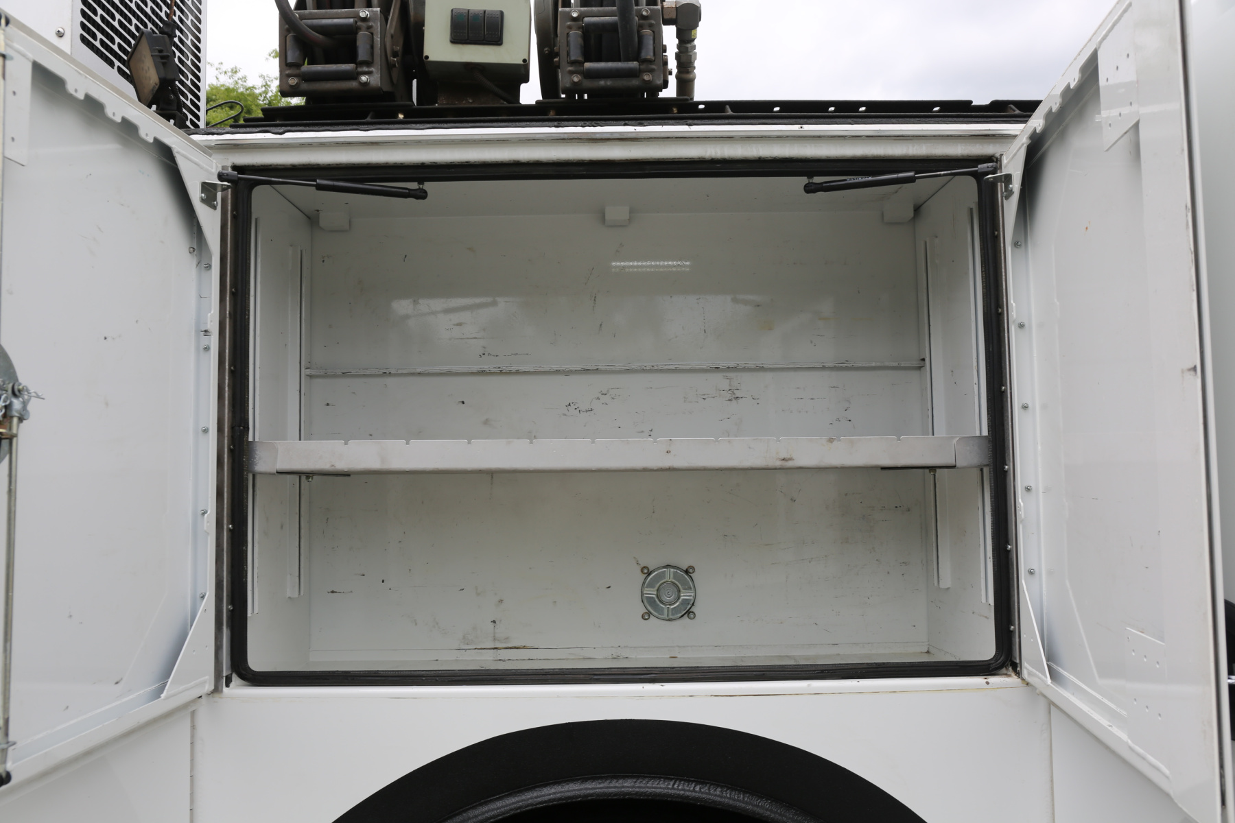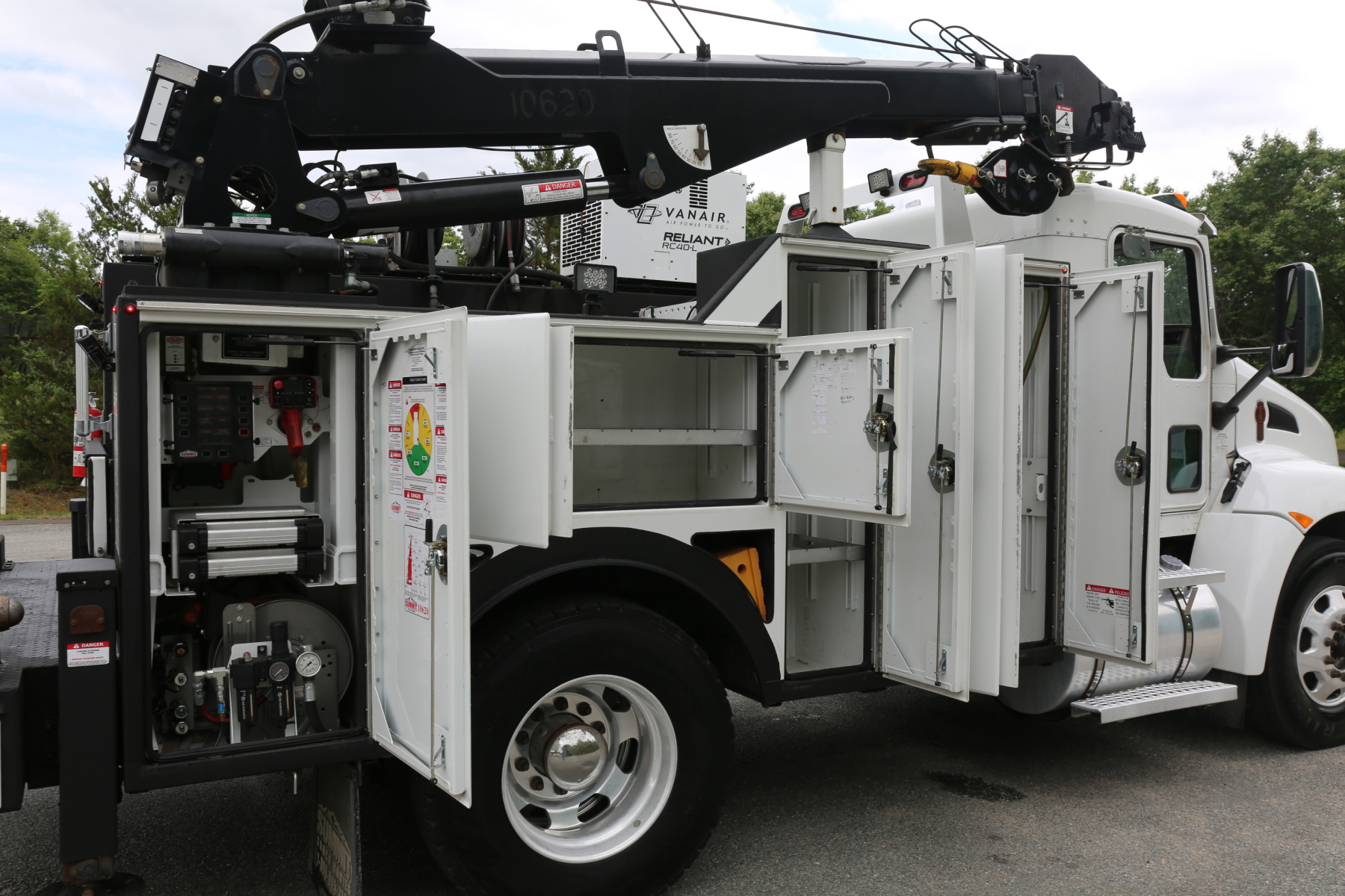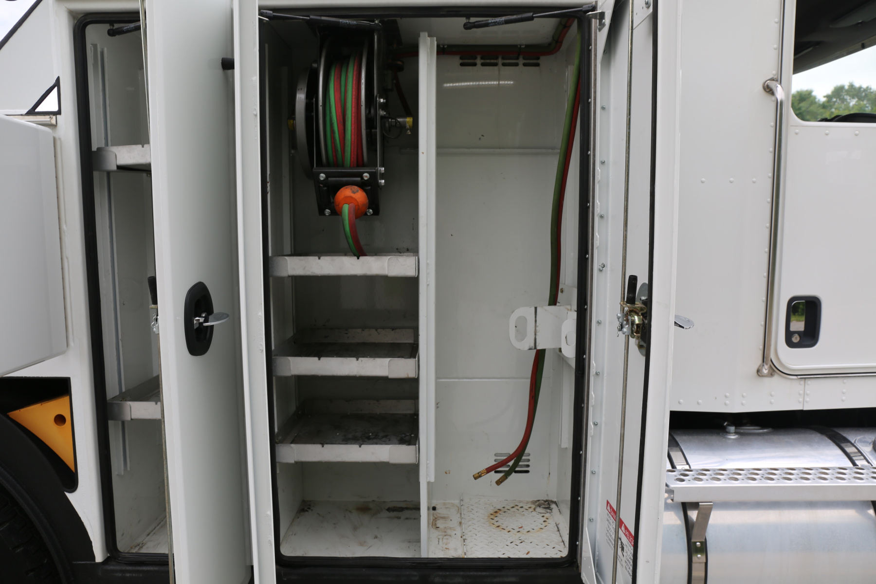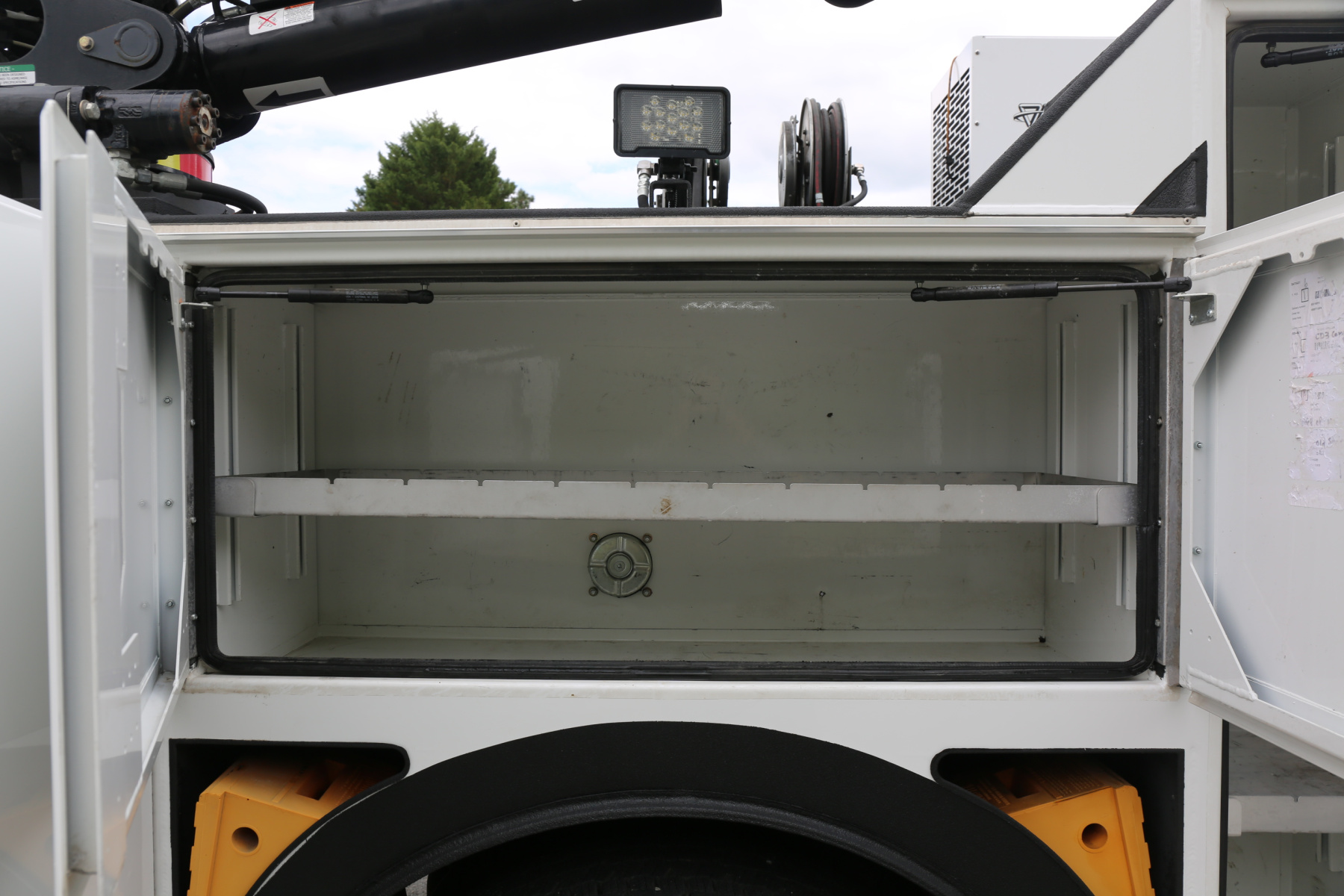The crane compartment houses a Hannay hose reel, air regulator and drier, two drawers, and the body control panel. The body control panel controls all bed lighting, outrigger functions, and has manual overrides for the crane.