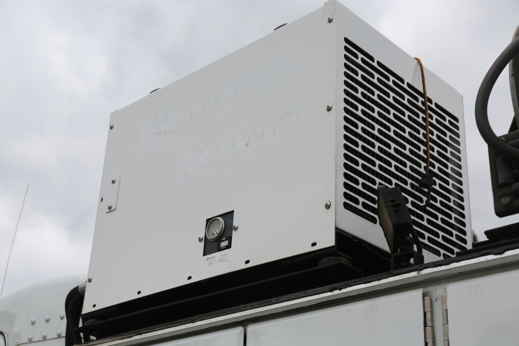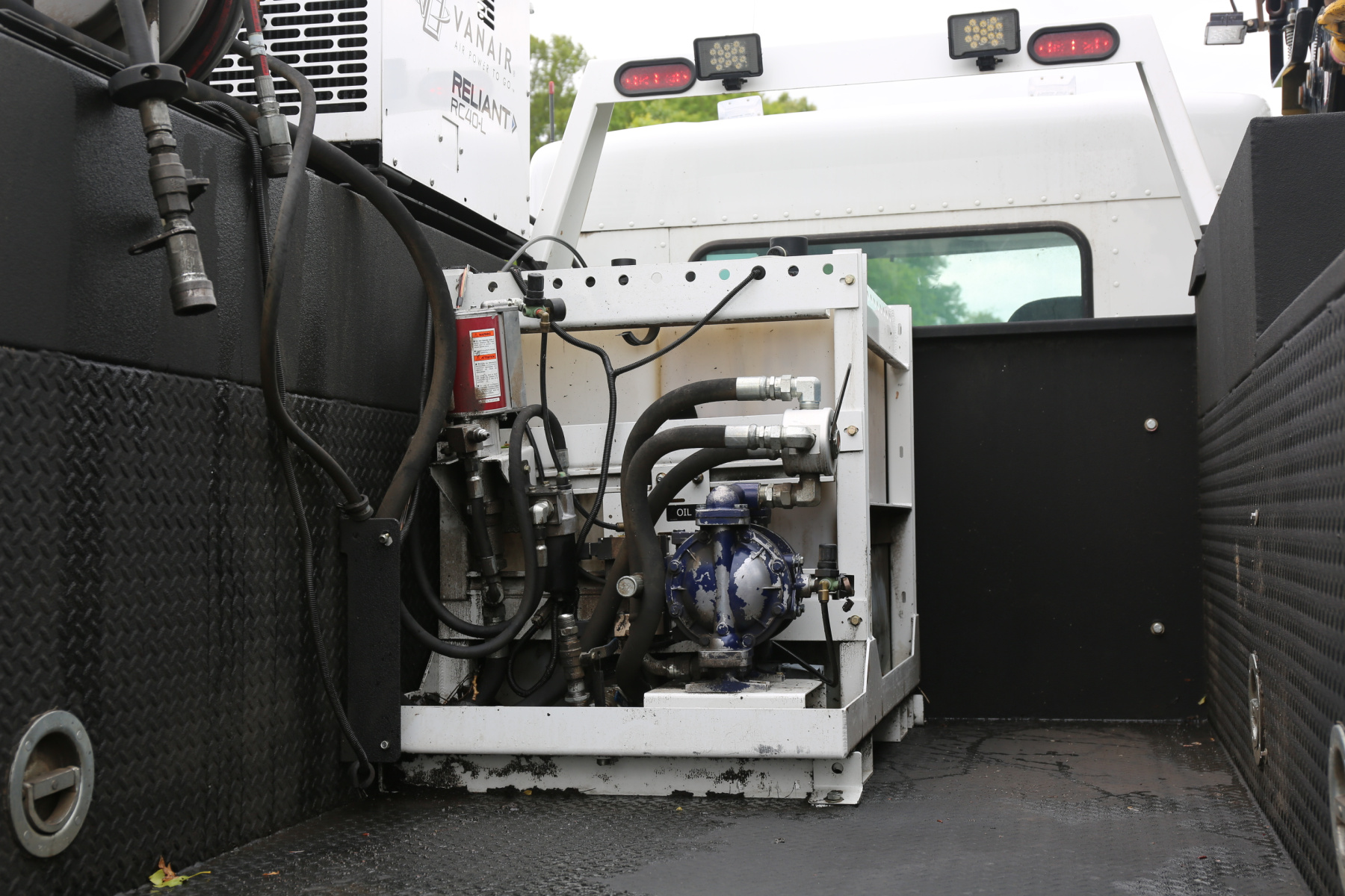 Inside the bed are two 40g tanks, one fresh and one waste, with lube reels mounted behind the compressor. The compressor is a Vanair RC40 showing 22 hours, runs as it should and builds air quickly.