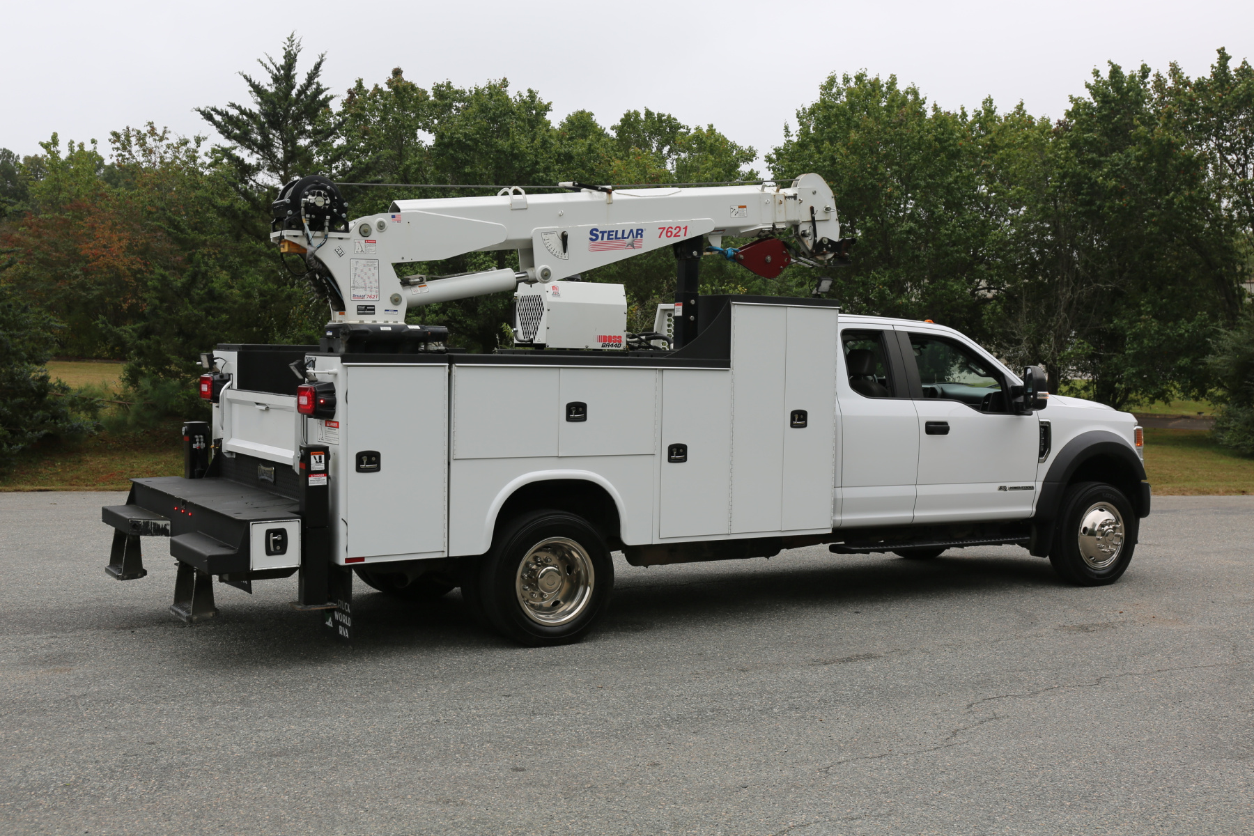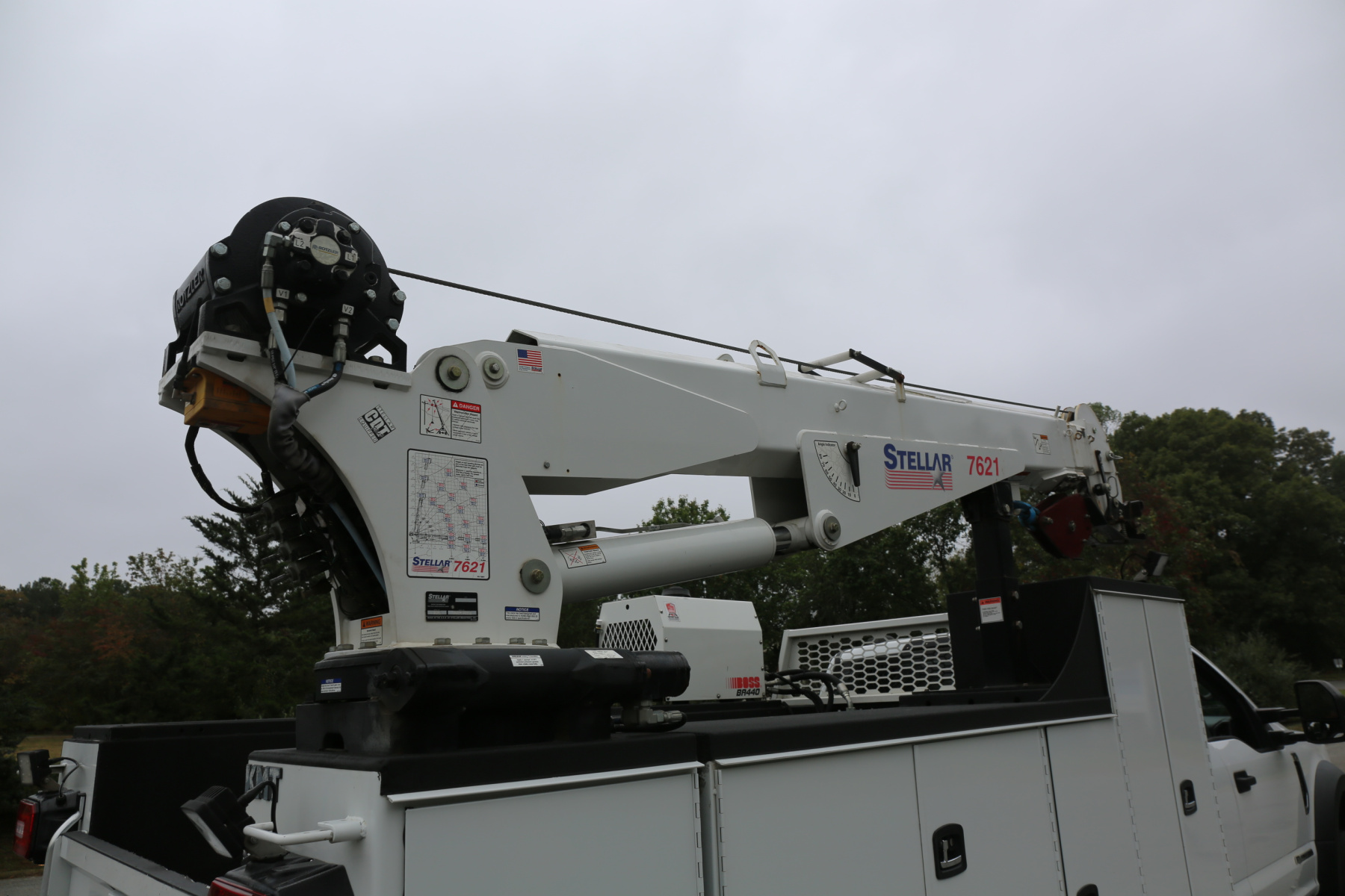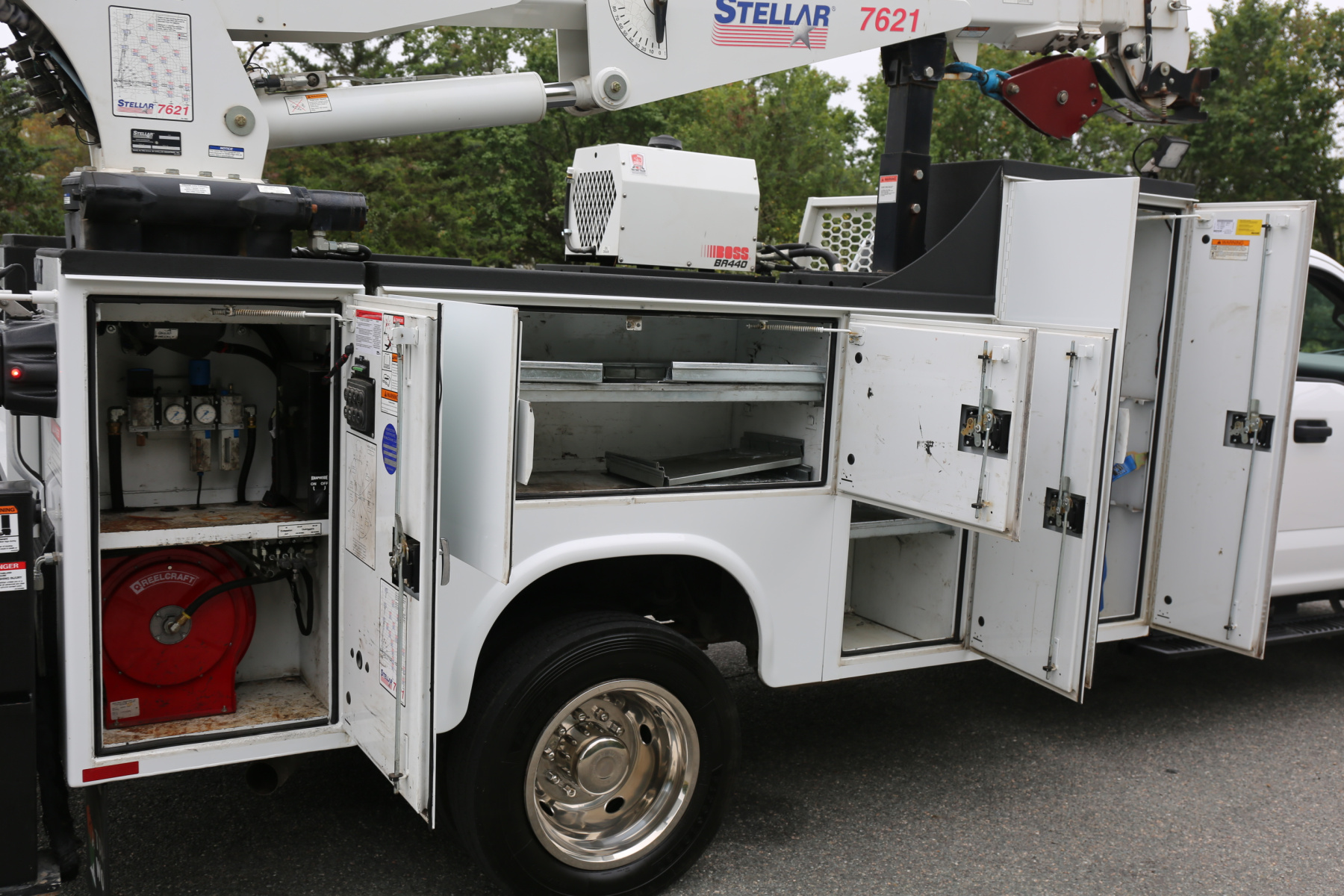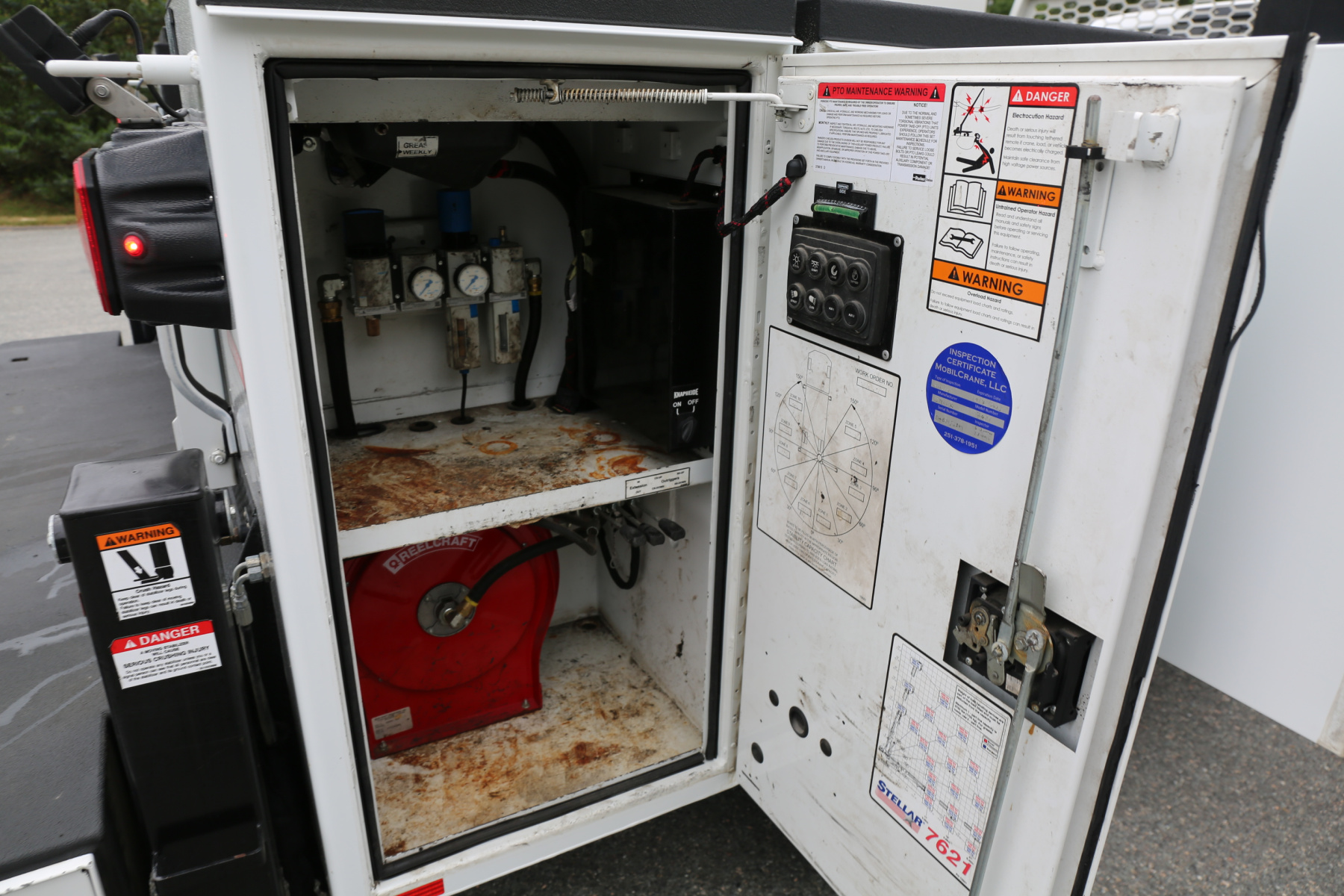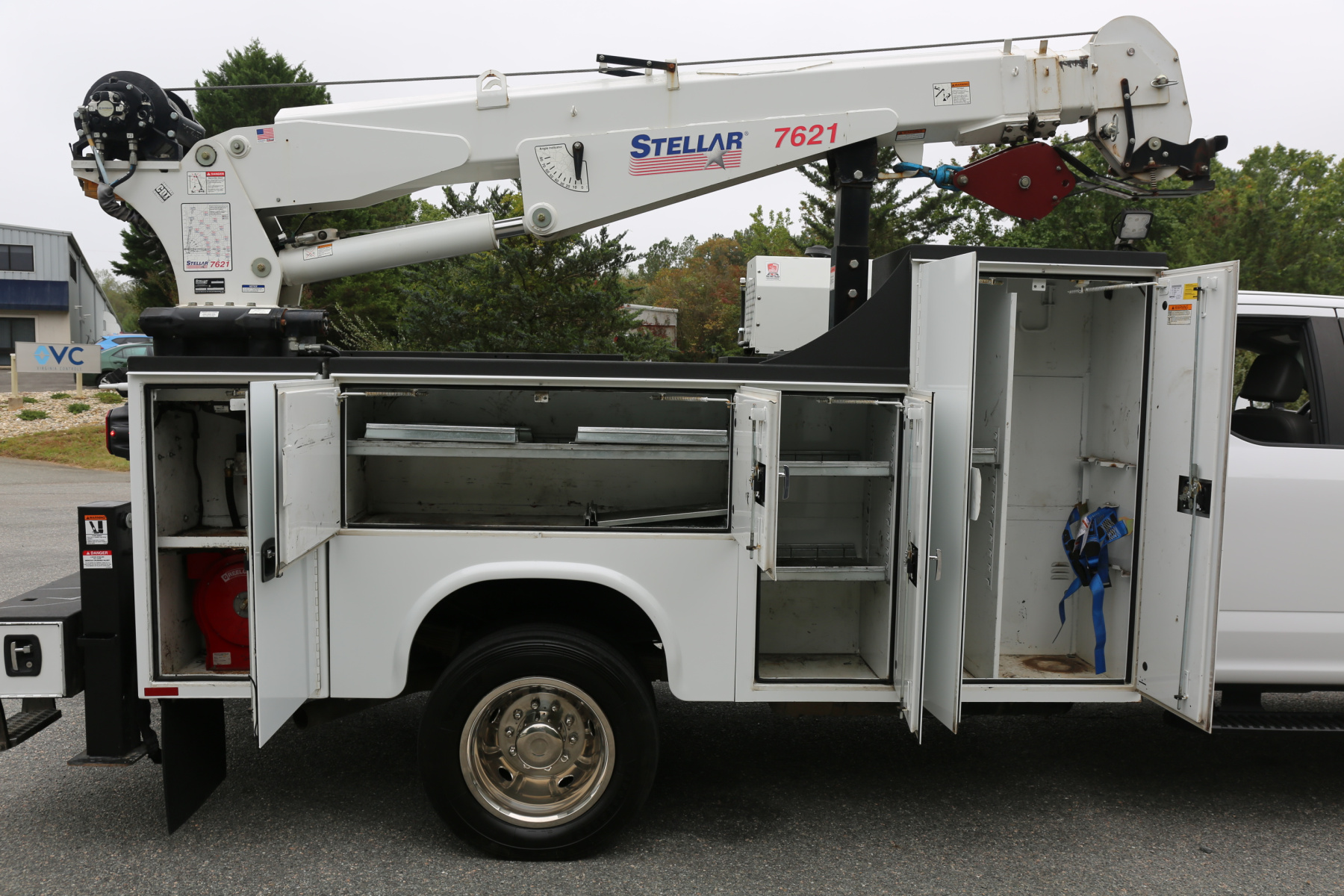The crane is a Stellar 7621, with a 7500# maximum lifting capacity and a two stage reach out to 21′. Run off a factory wireless remote. The remote can turn the truck on and off, and controls the compressor as well.