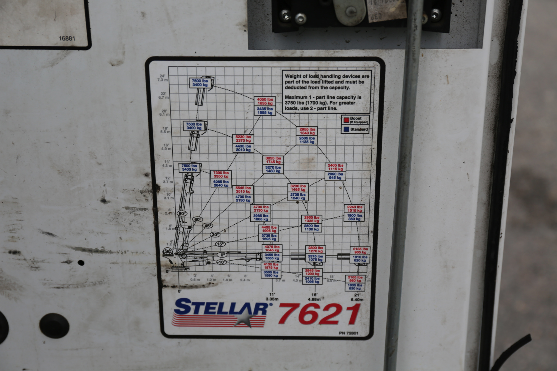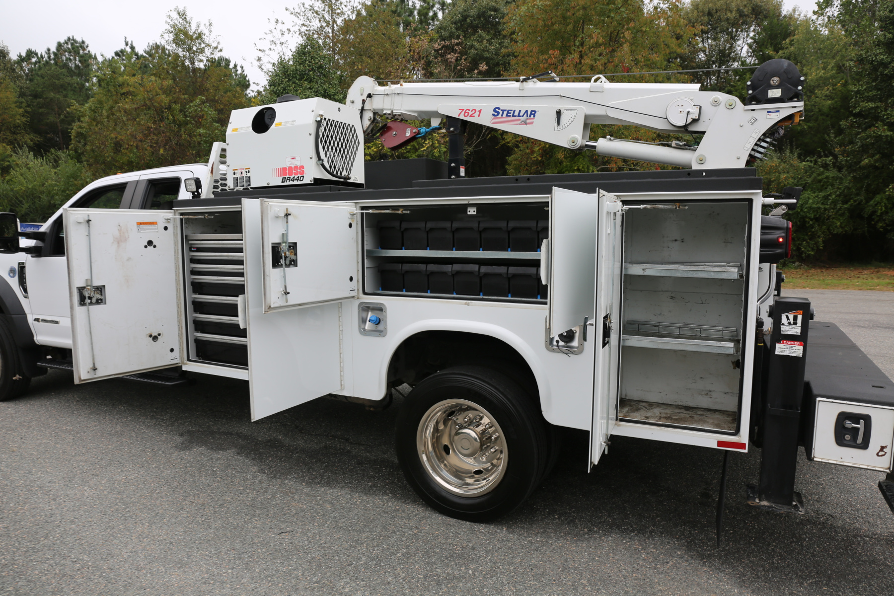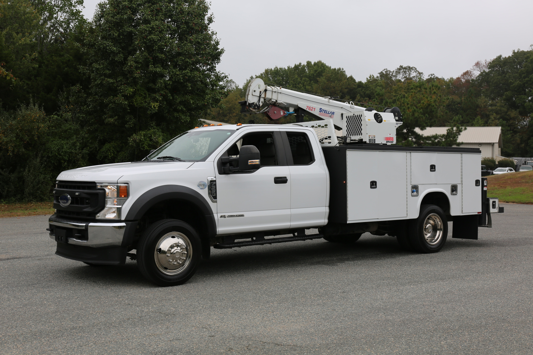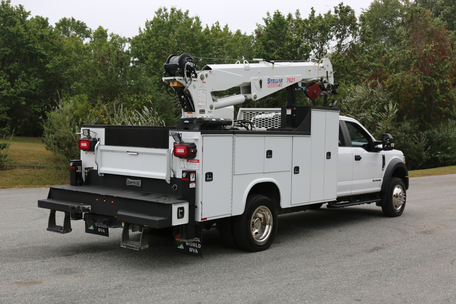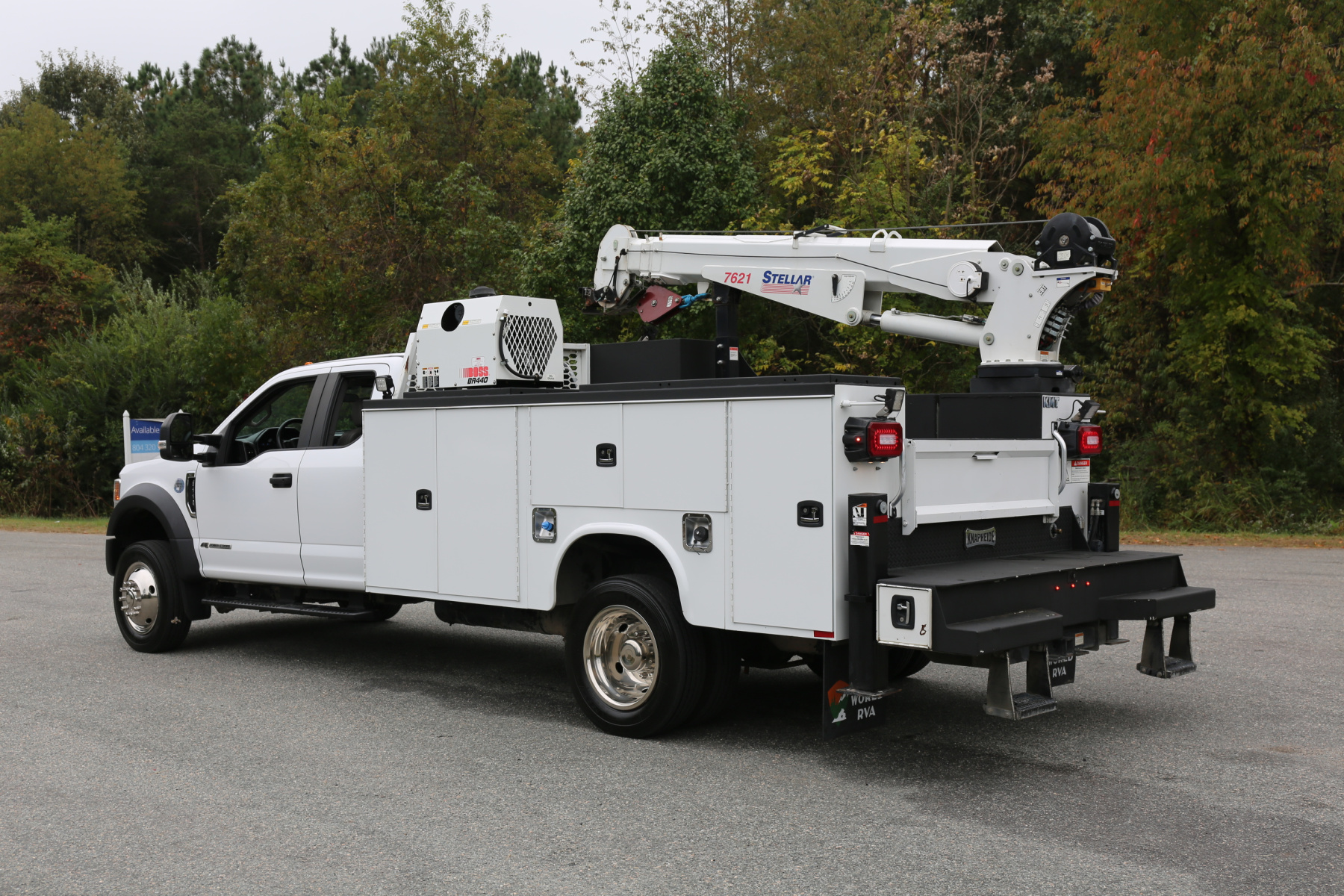 The crane is a Stellar 7621, with a 7500# maximum lifting capacity and a two stage reach out to 21′. Run off a factory wireless remote. The remote can turn the truck on and off, and controls the compressor as well.