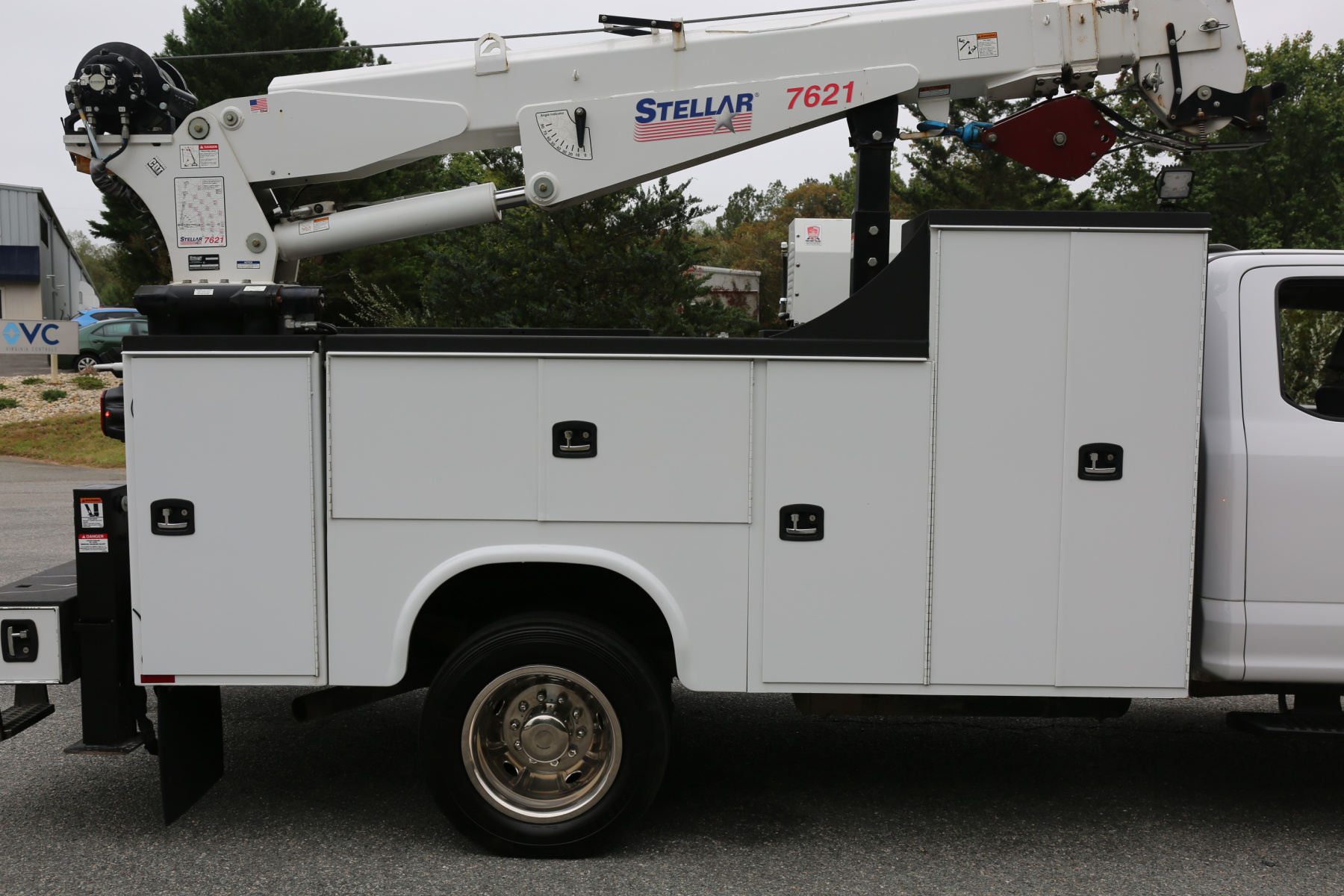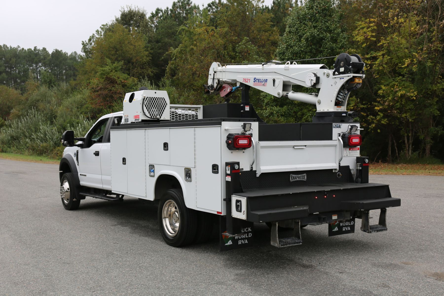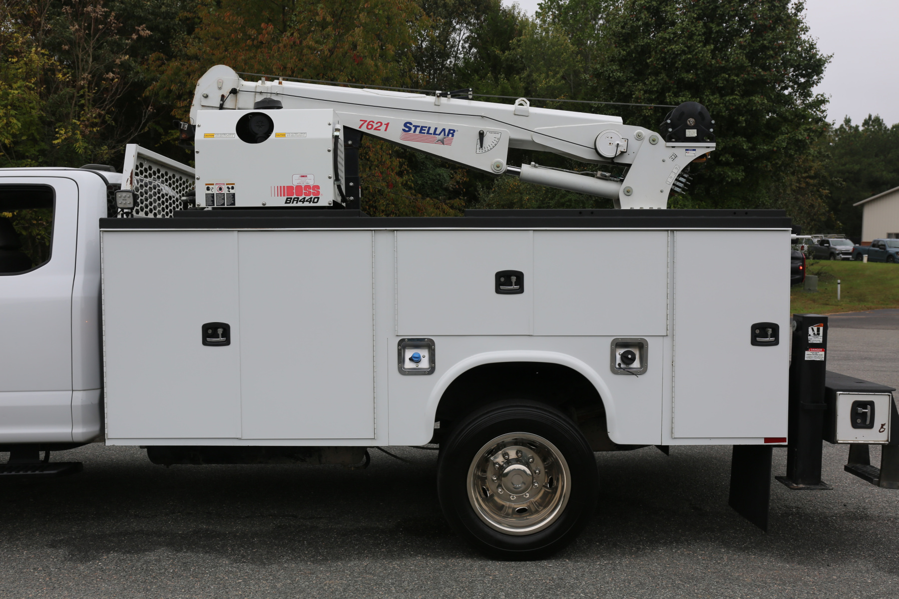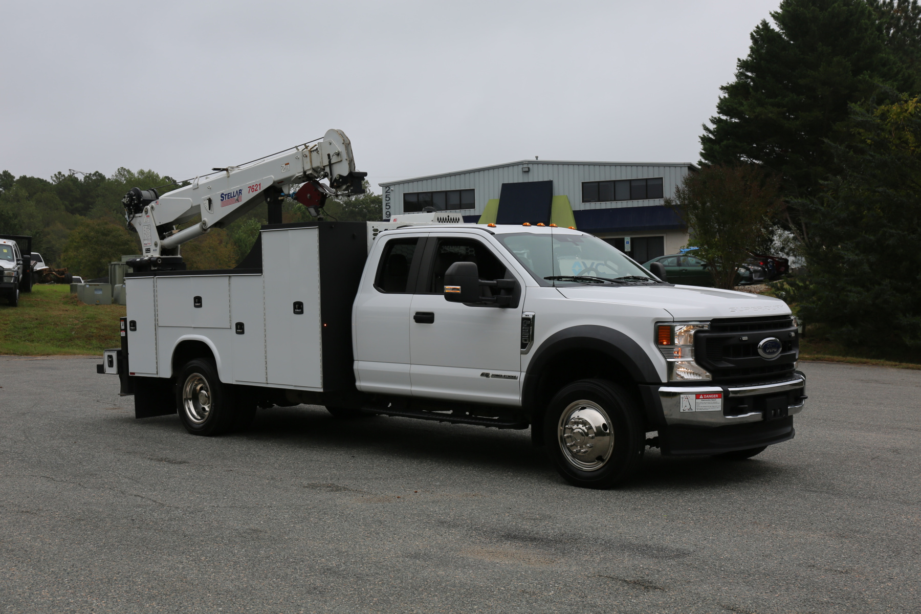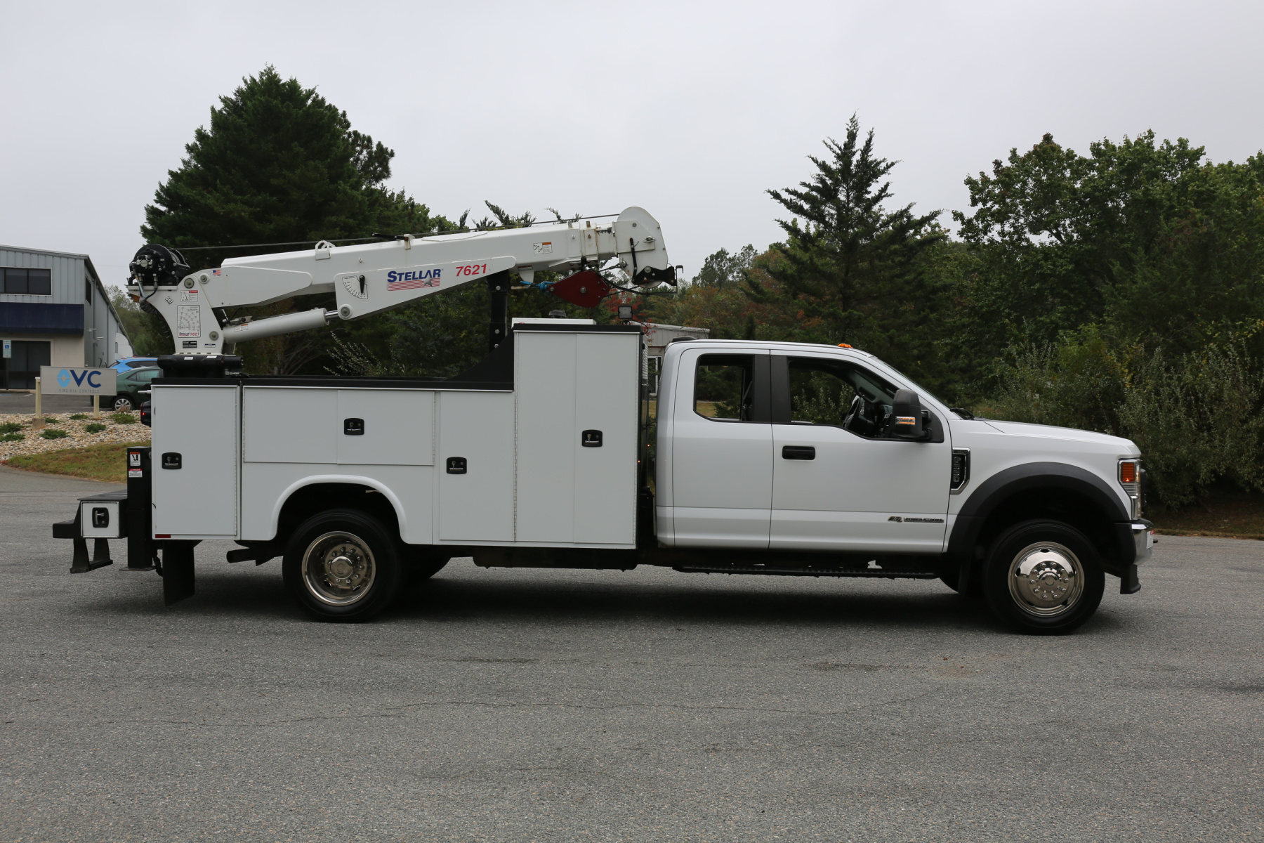 The crane is a Stellar 7621, with a 7500# maximum lifting capacity and a two stage reach out to 21′. Run off a factory wireless remote. The remote can turn the truck on and off, and controls the compressor as well.