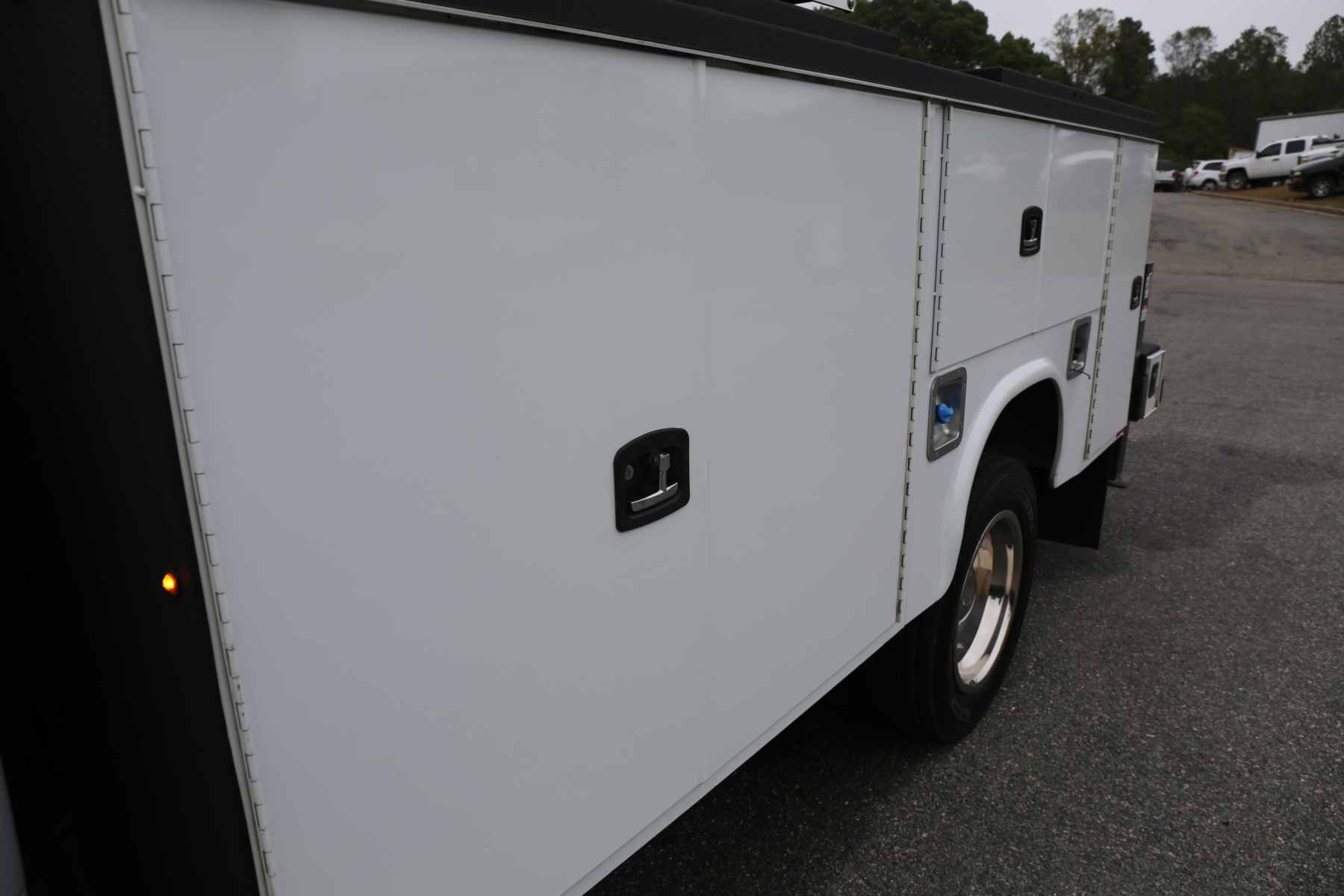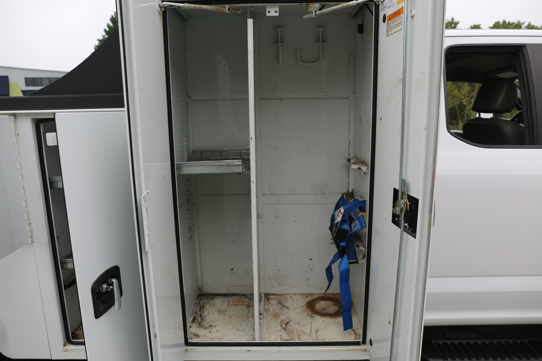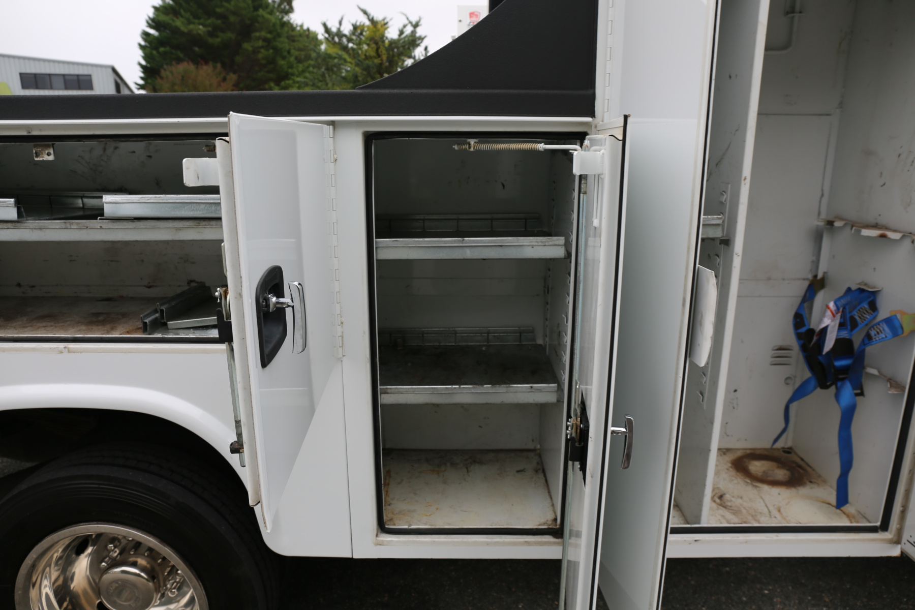 All of the doors close, latch, and lock as they should – we have the bin keys, and all latches are keyed the same. Master sliding locks on both bedsides. Factory welder mount. Exterior LED lighting on both sides and rear of the truck. Front and rear strobes. Factory paint is intact – overall the bed is very clean with just a few minor rock chips etc. No large scratches or dents – no rust in the bed.