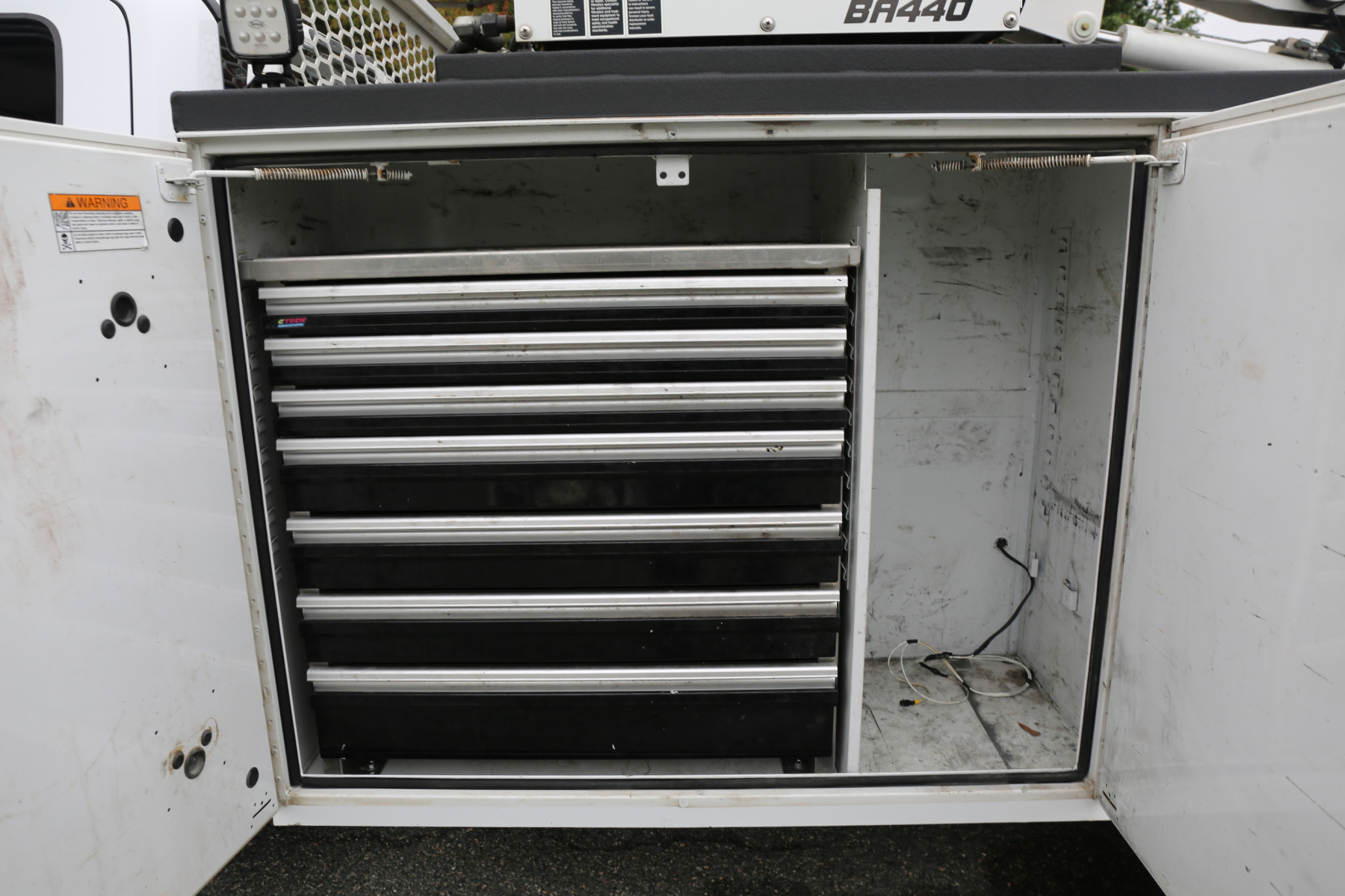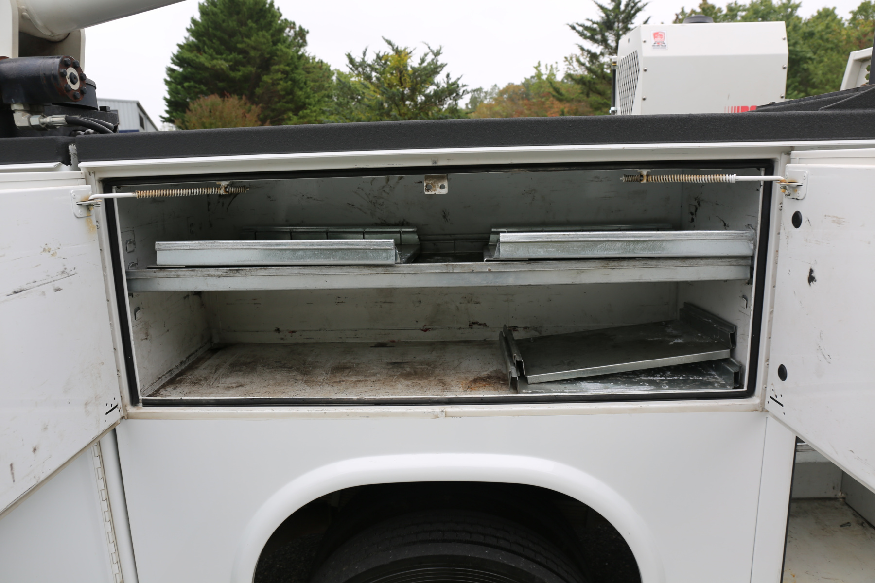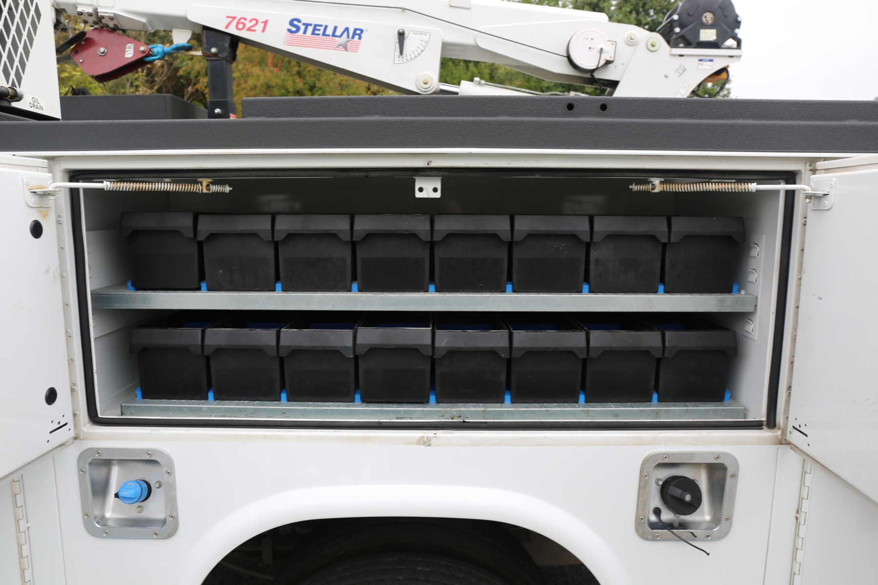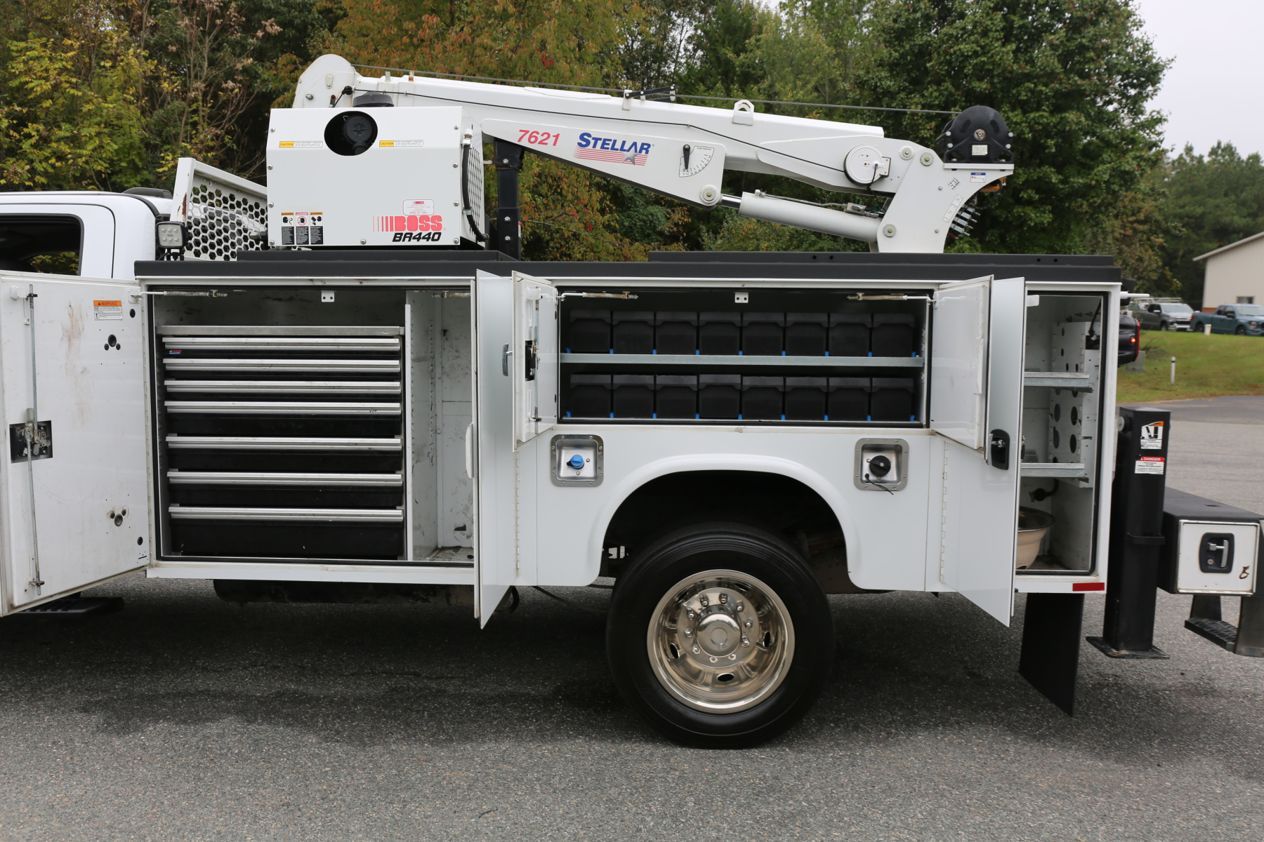 This truck came to us from down south, and is free of any rust in the body or frame. 11′ Knapheide service body with hydraulic outriggers, 7621 Stellar crane, hydraulic compressor, one full set of CTech drawers, and one full set of bolt drawers. Everything on the truck works as it should.