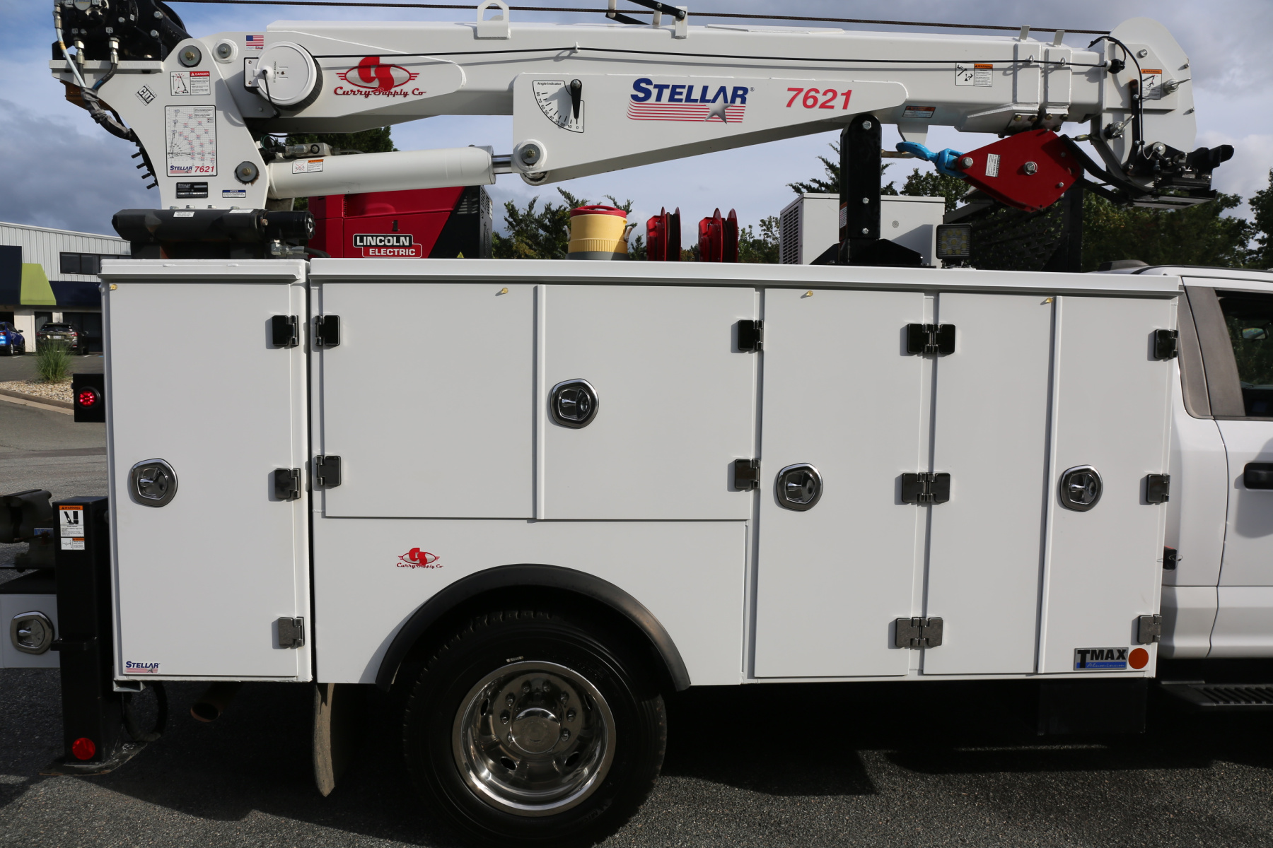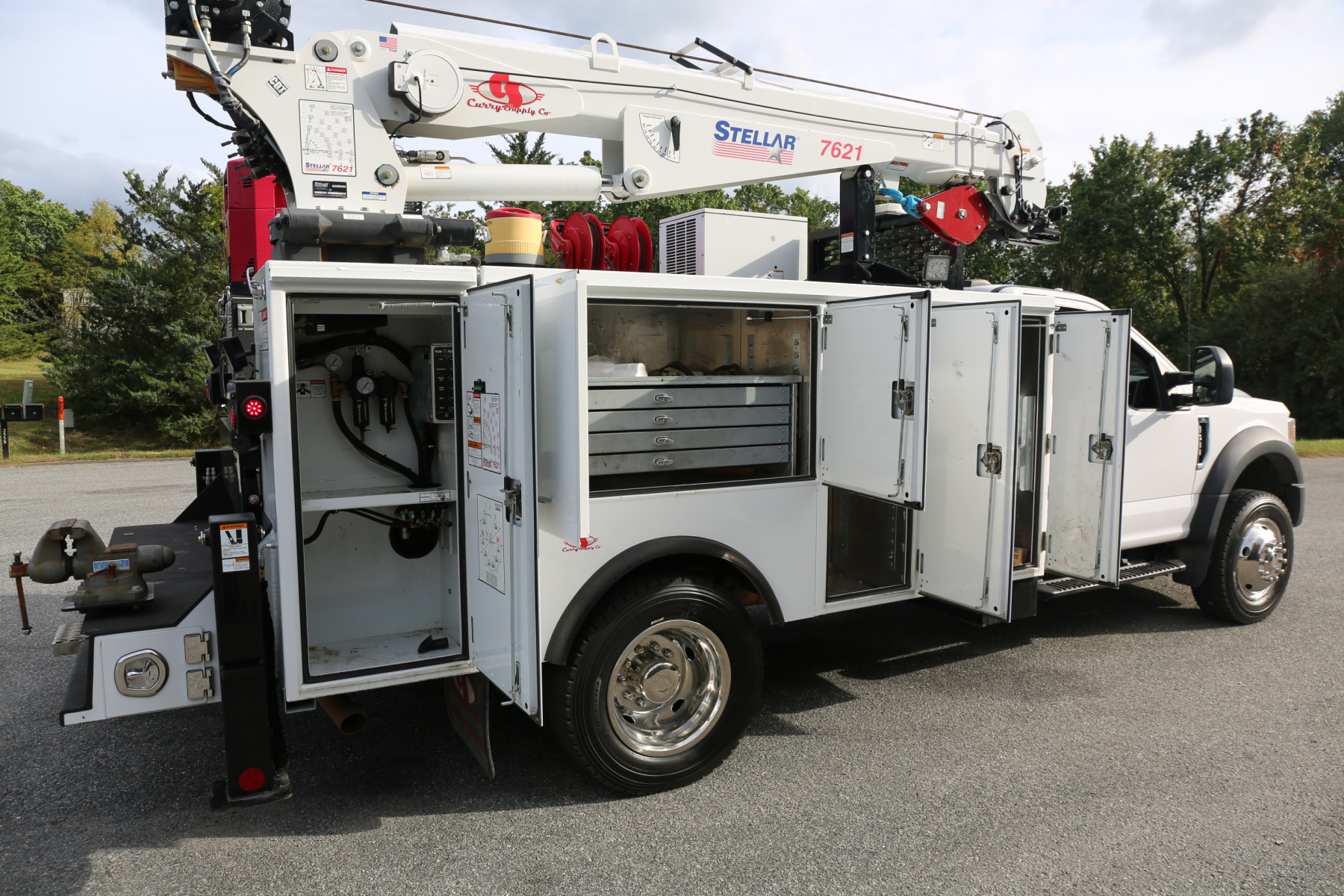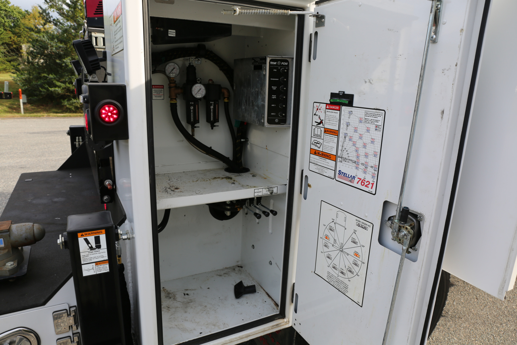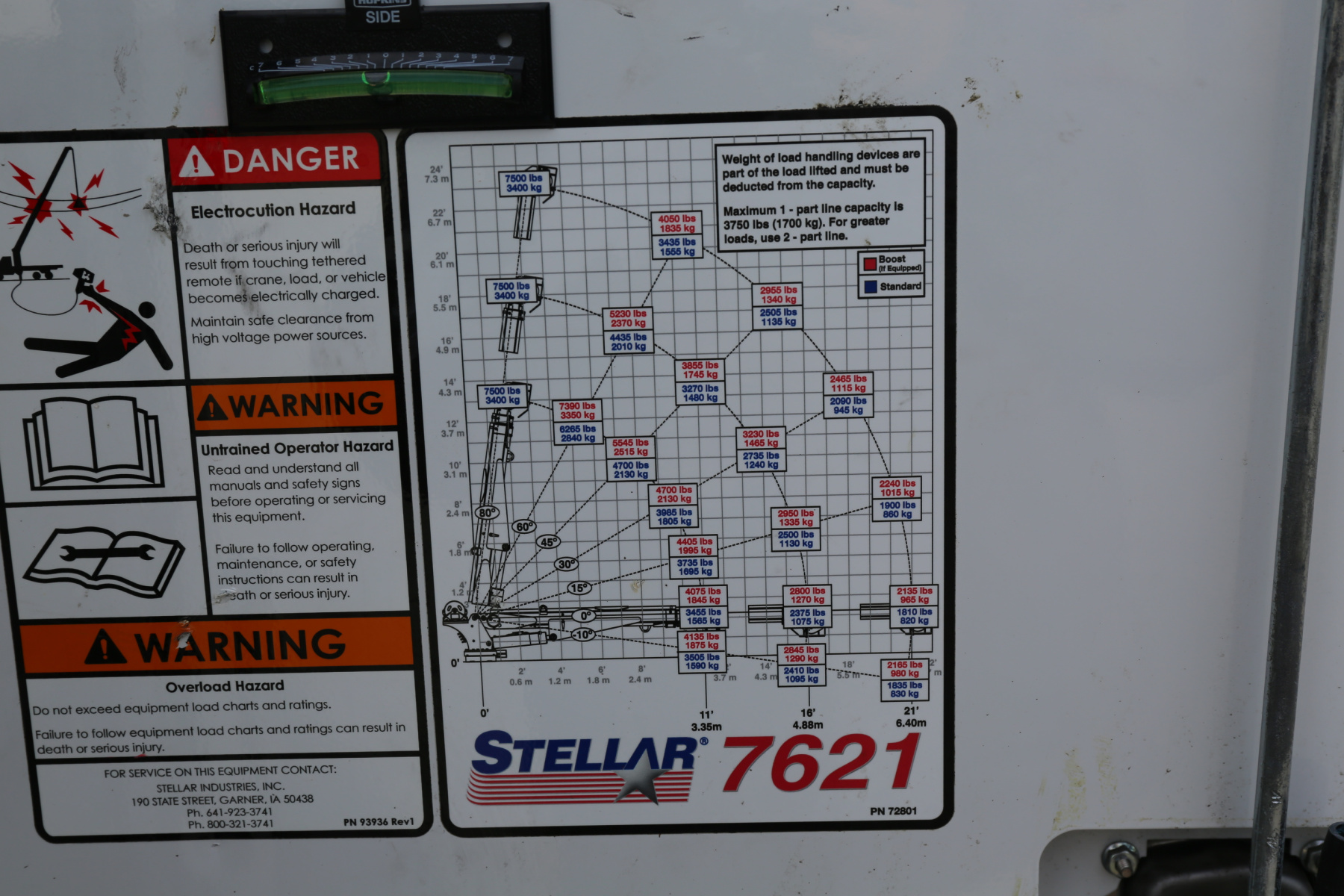The crane is a Stellar 7621, with 7500# maximum lifting capacity and a two stage hydraulic extension out to 21′ of reach. Run off a factory wireless remote, with recharging cradle inside of the cab. The remote can turn the compressor on and off, as well as the truck itself.