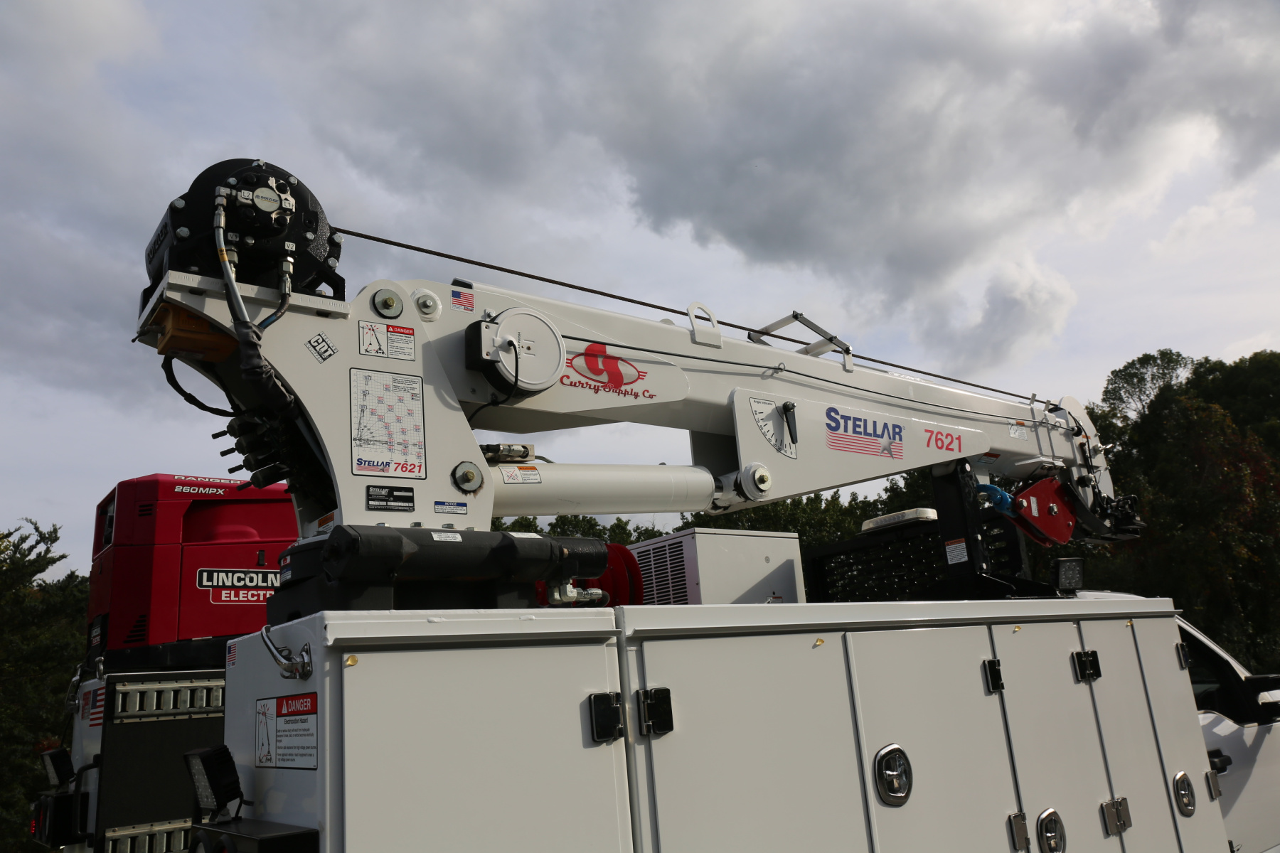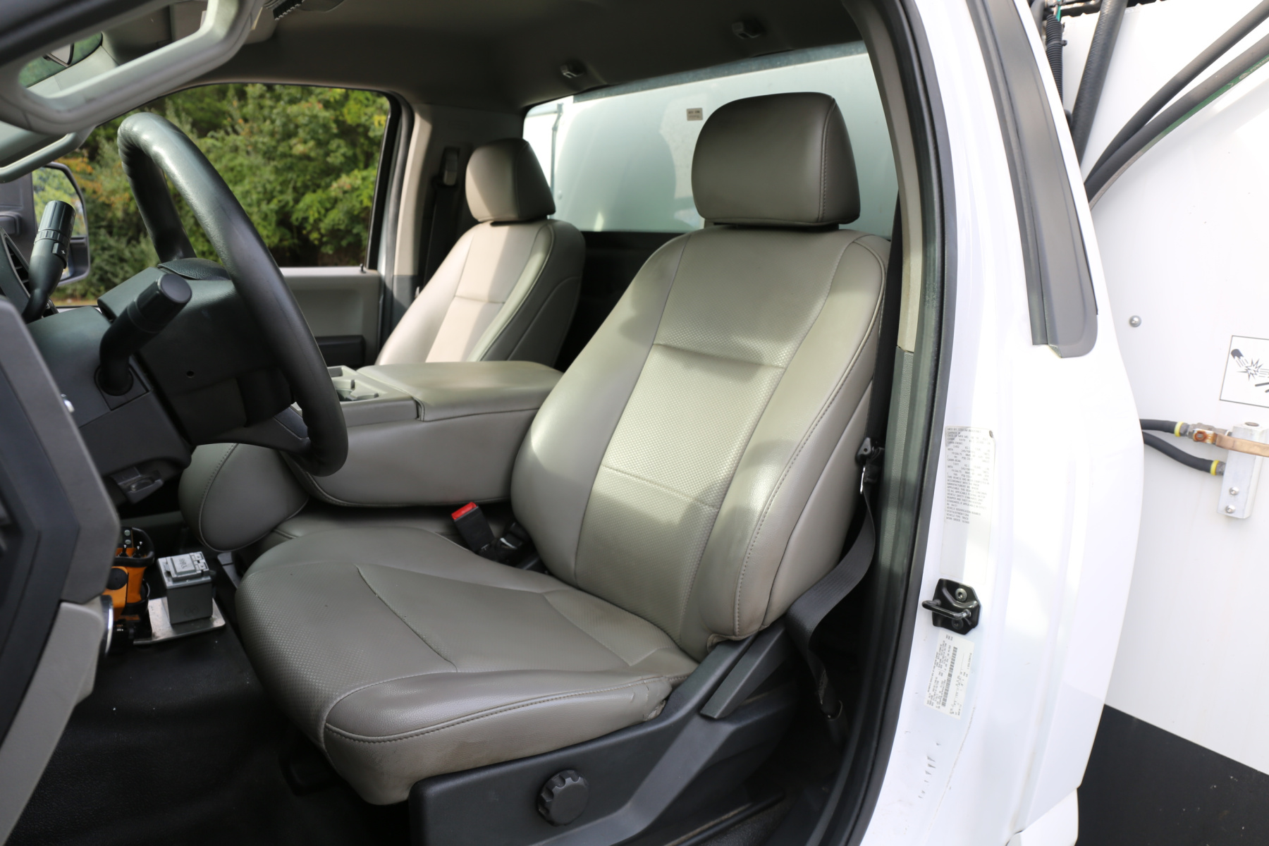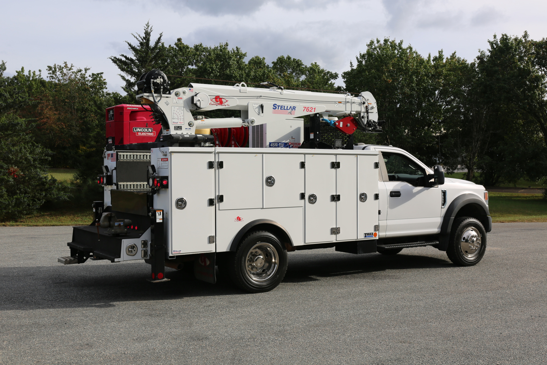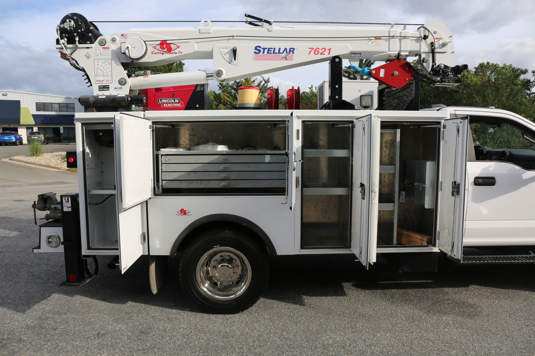 The crane is a Stellar 7621, with 7500# maximum lifting capacity and a two stage hydraulic extension out to 21′ of reach. Run off a factory wireless remote, with recharging cradle inside of the cab. The remote can turn the compressor on and off, as well as the truck itself.