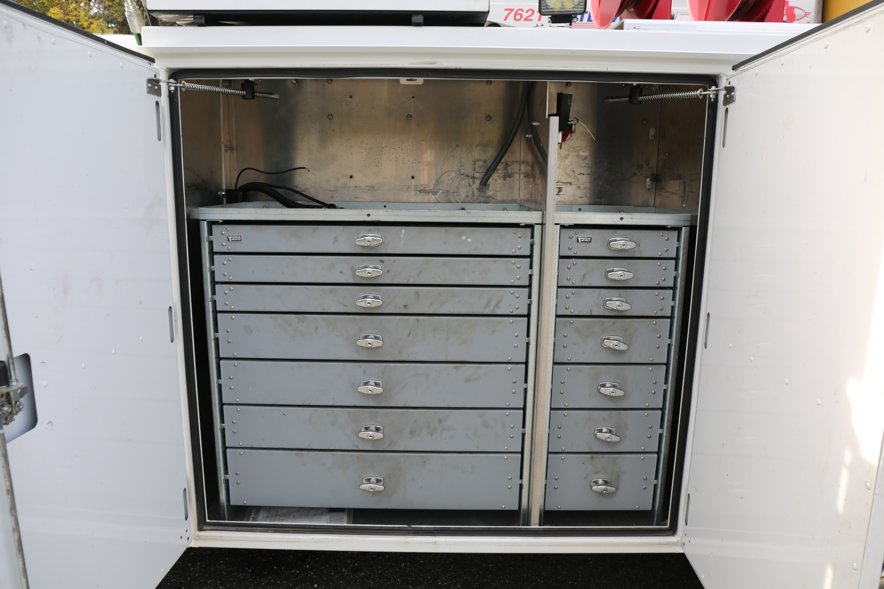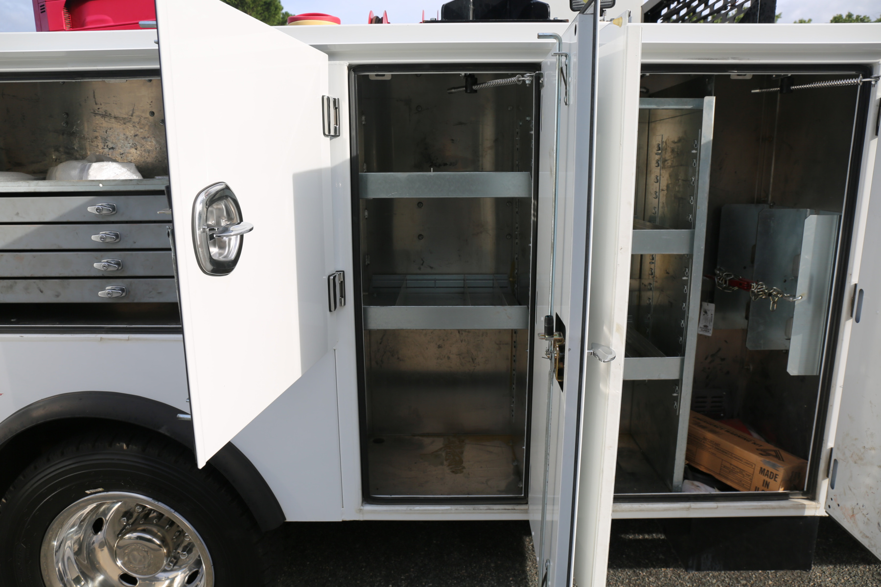 The crane compartment houses your outrigger control levers, has one shelf, and the body control panel for bed lighting. Another set of four American Eagle drawers over the passenger wheel well. The P2 compartment has two sets of shelves. Two more shelves in the P1 compartment, as well as torch bottle racks and binders.