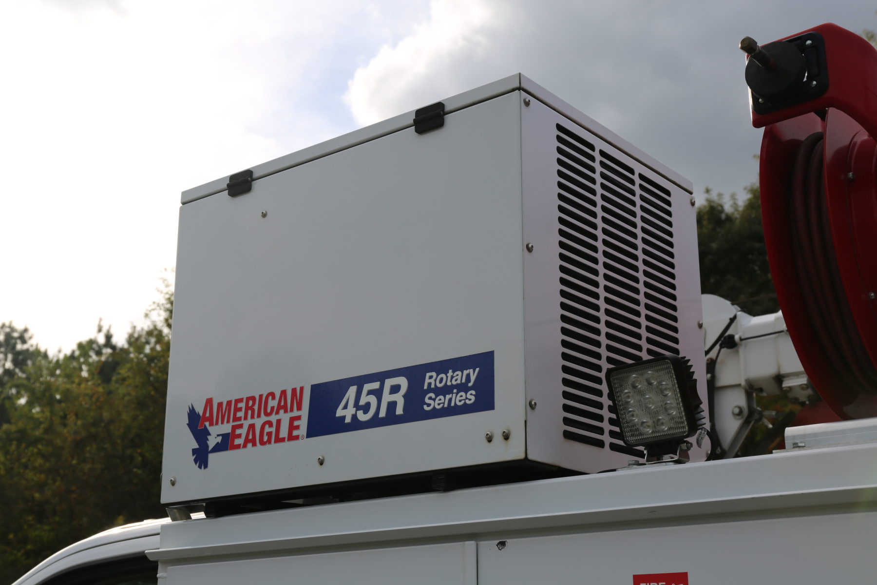 The compressor is an American Eagle 45R rotary hydraulic compressor. Showing 189 total hours. Air is routed to the hose reel mounted on top of the bins, right behind the compressor. Runs as it should.
