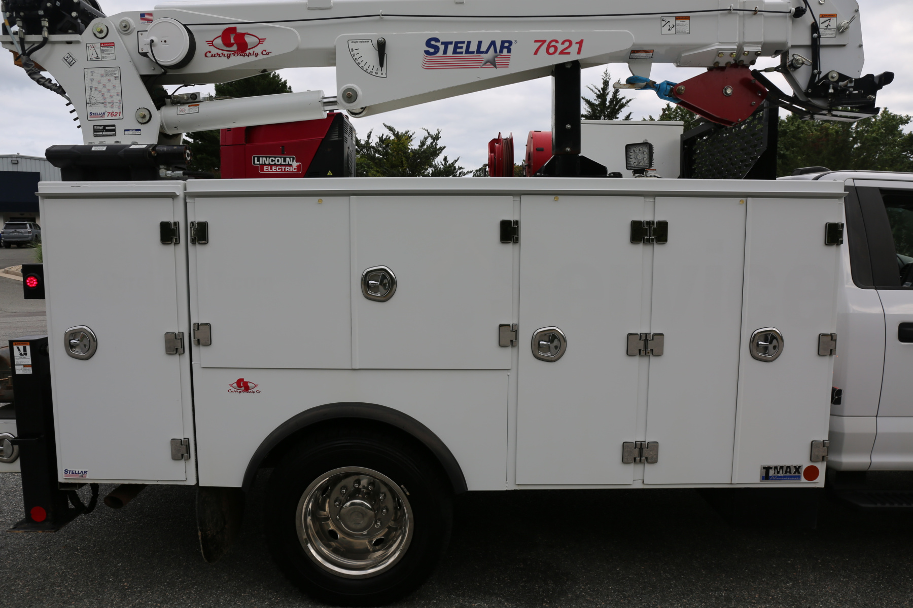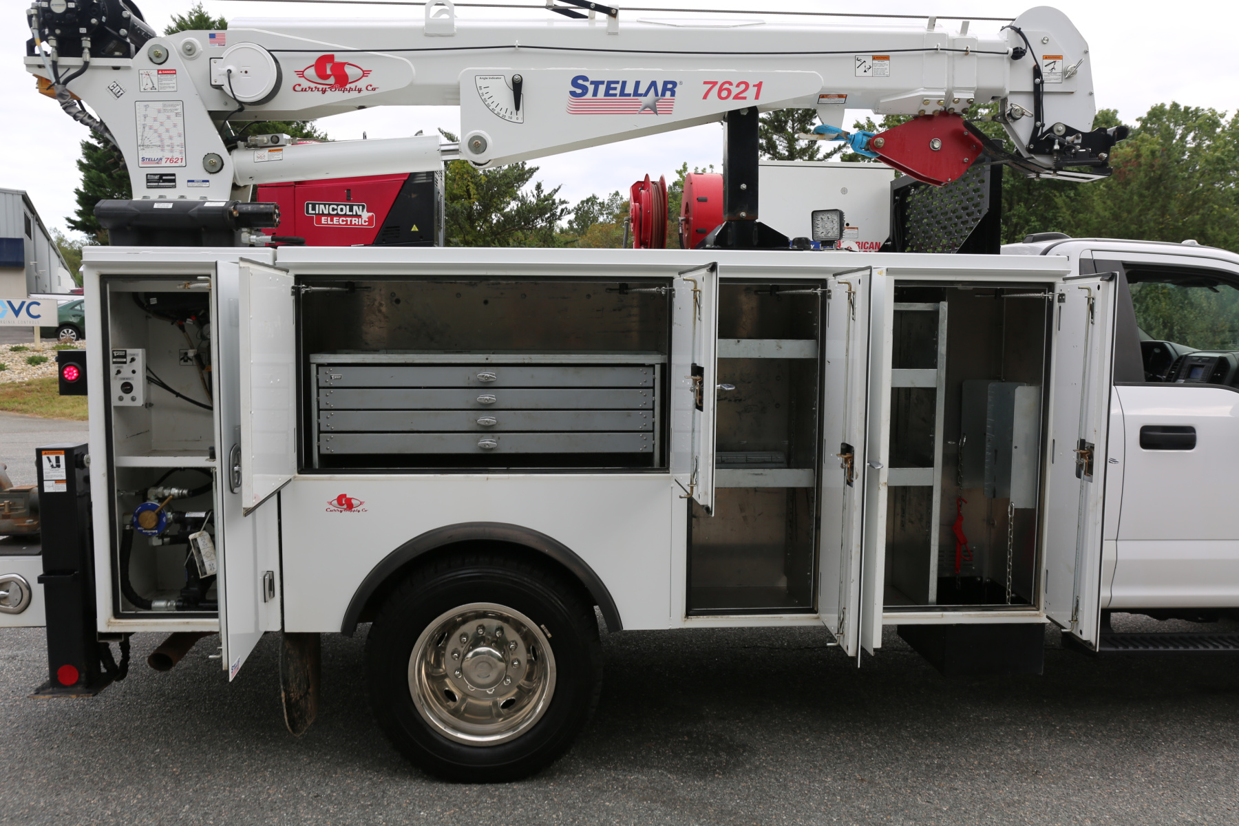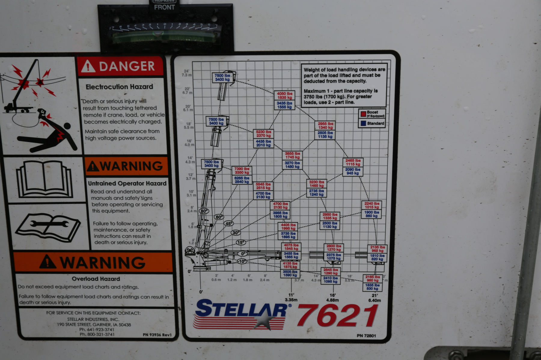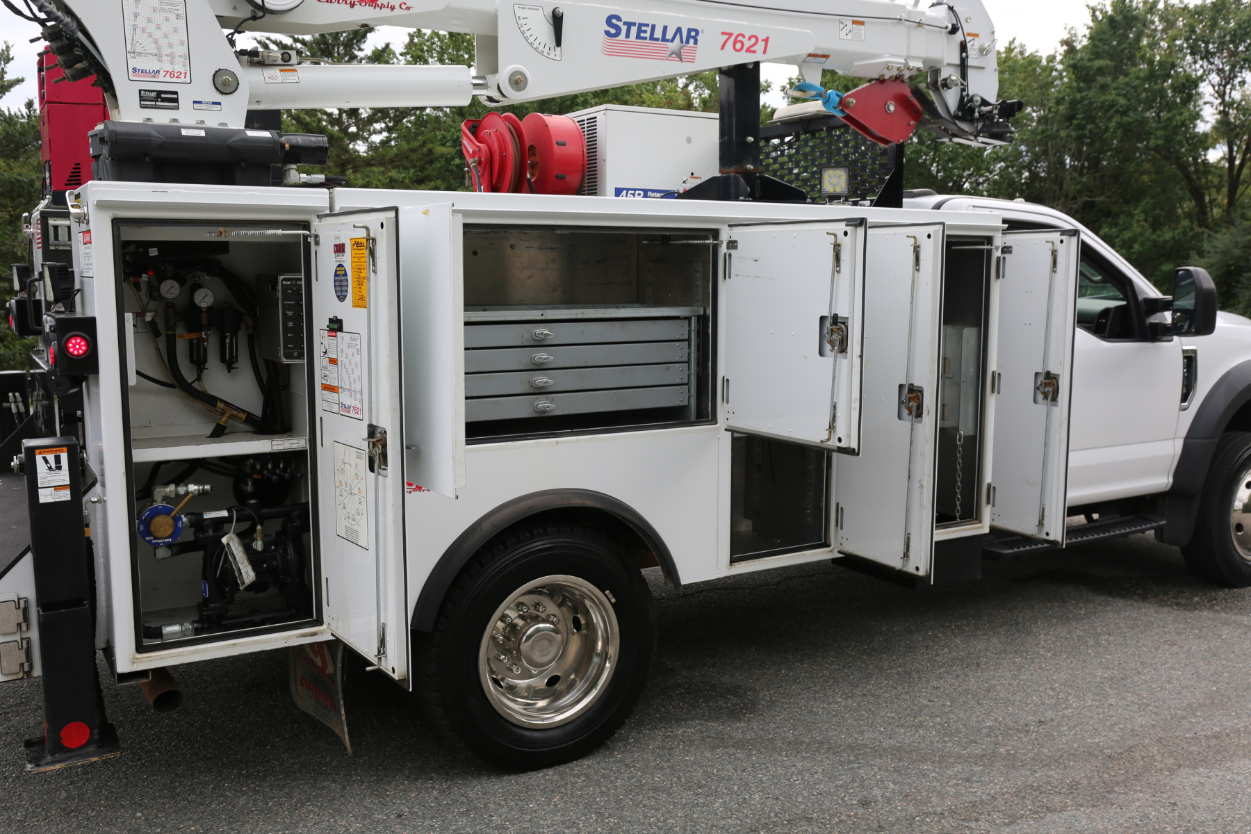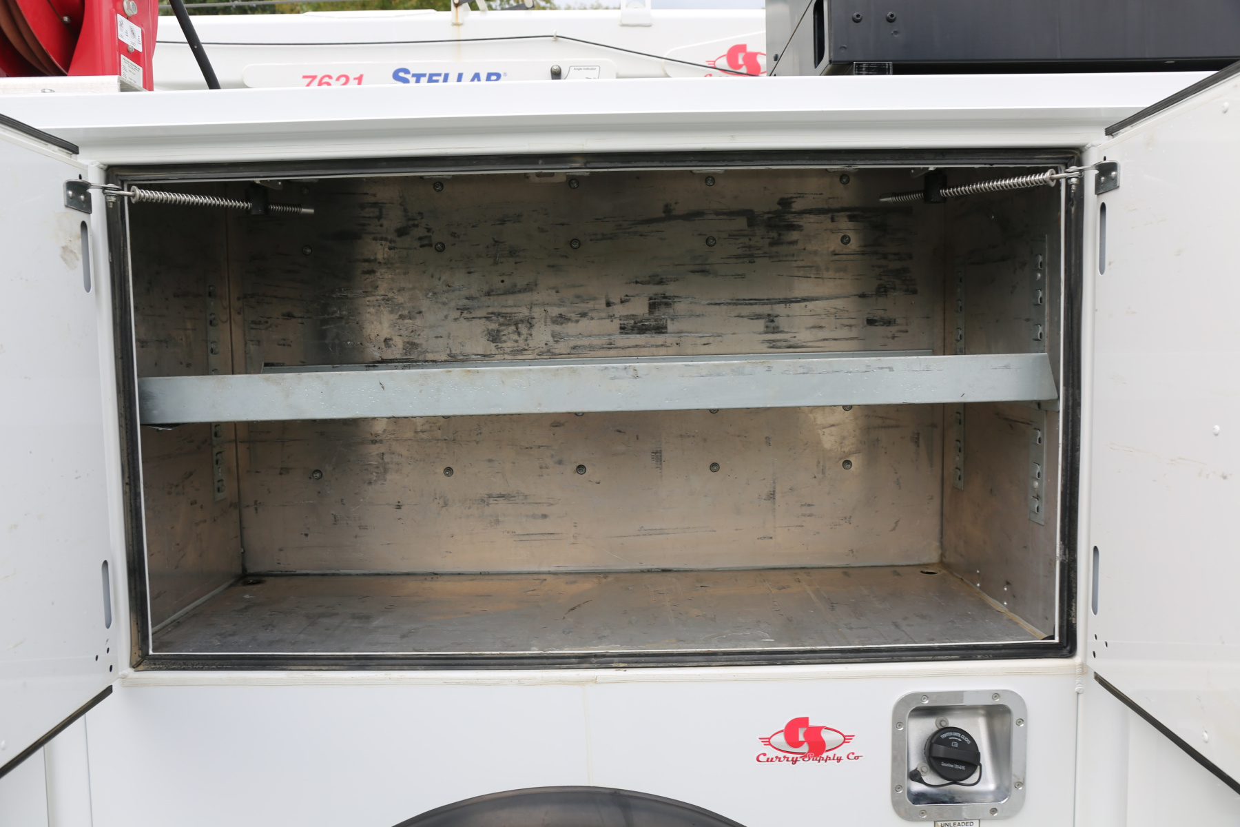 The crane is a Stellar 7621, with a 7500# maximum lifting capacity and a two stage hydraulic reach out to 21′ of total extension. Run off a factory wireless remote, the remote controls the compressor, and can turn the truck on and off as well.
