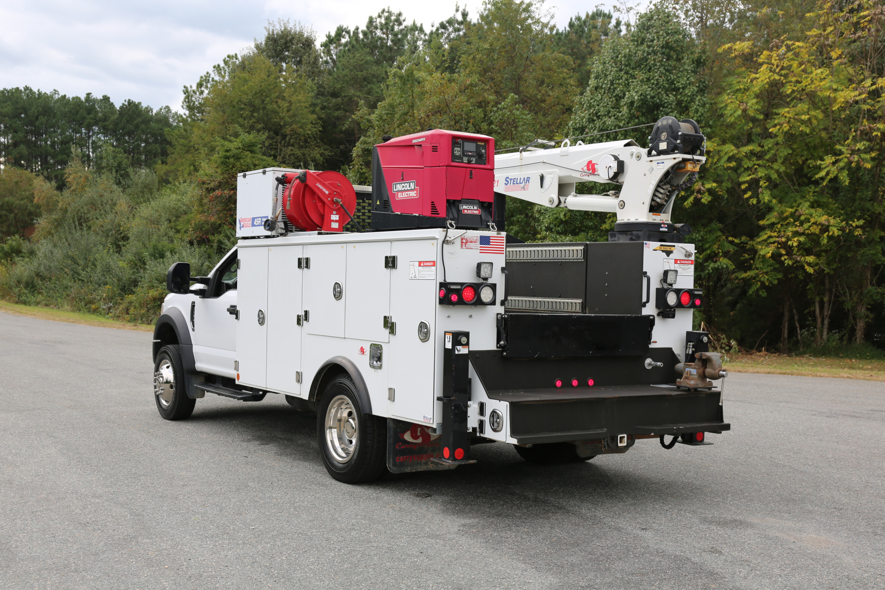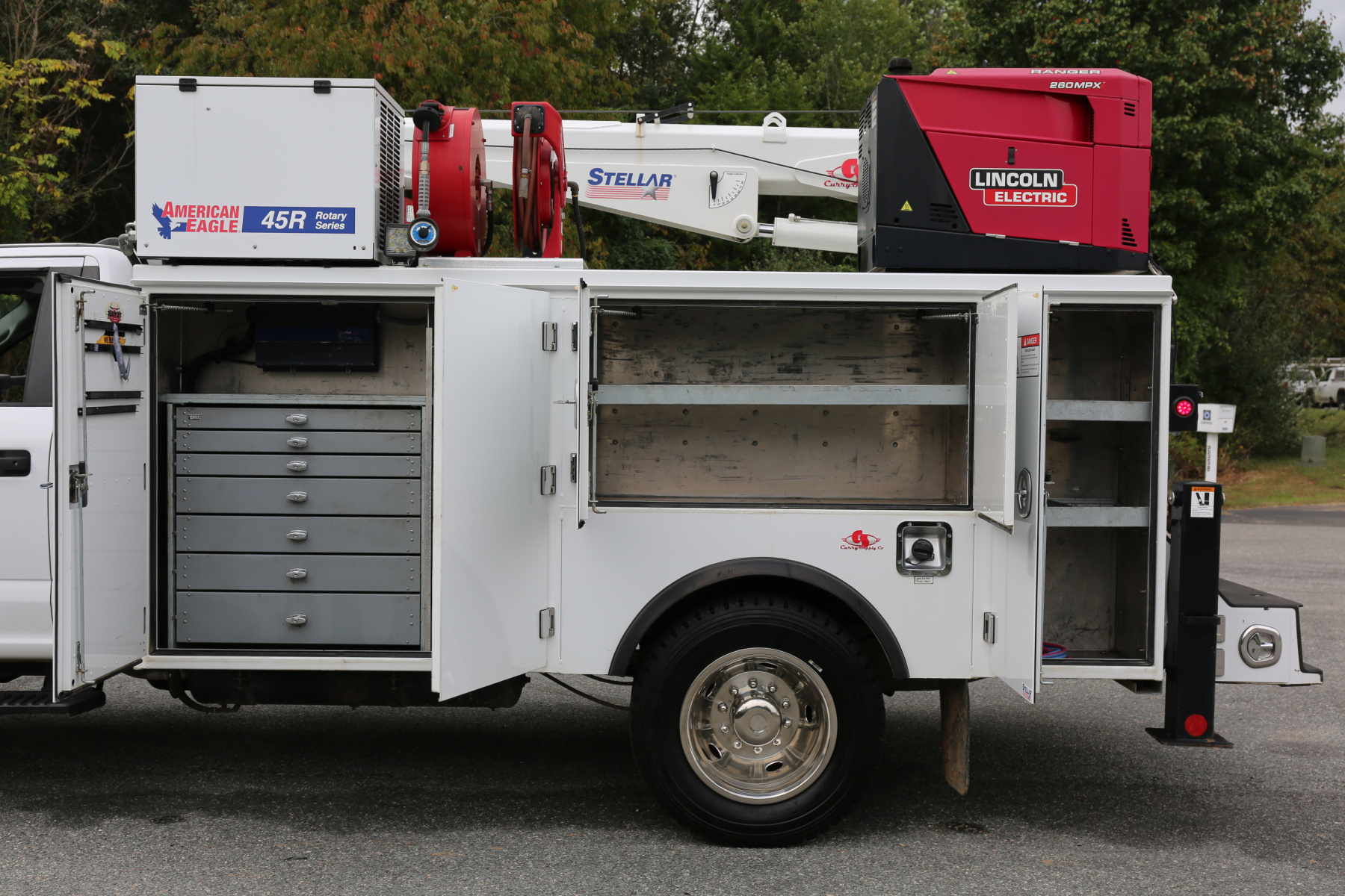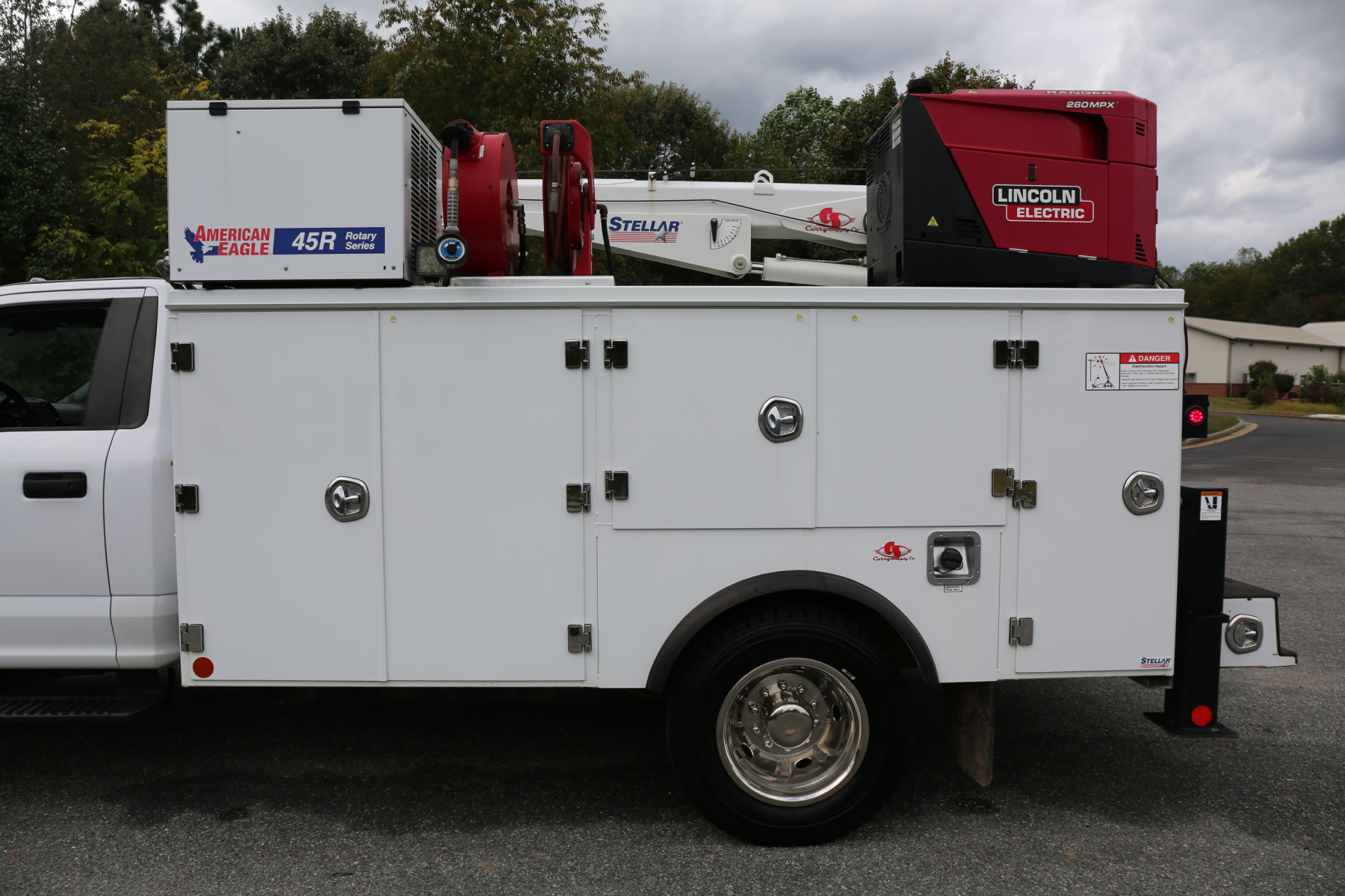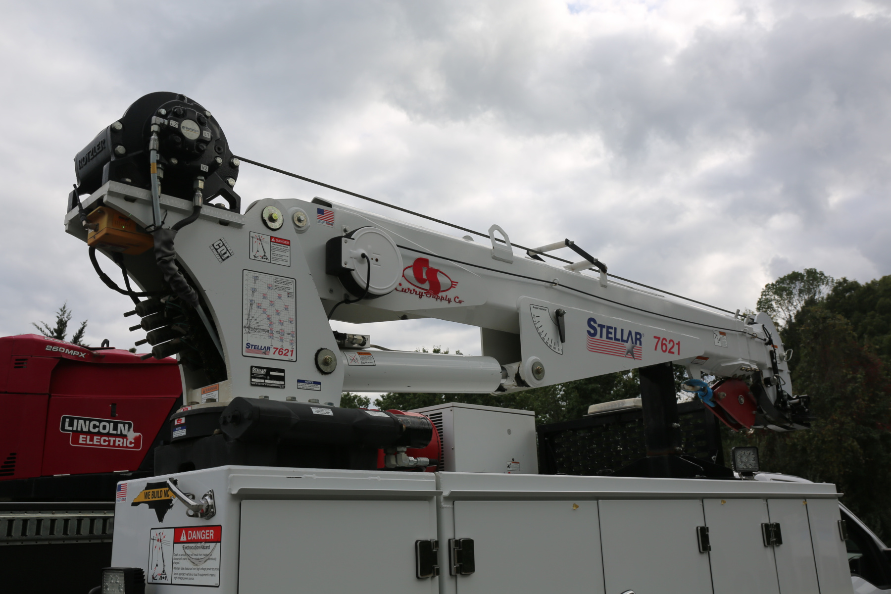 The crane is a Stellar 7621, with a 7500# maximum lifting capacity and a two stage hydraulic reach out to 21′ of total extension. Run off a factory wireless remote, the remote controls the compressor, and can turn the truck on and off as well.