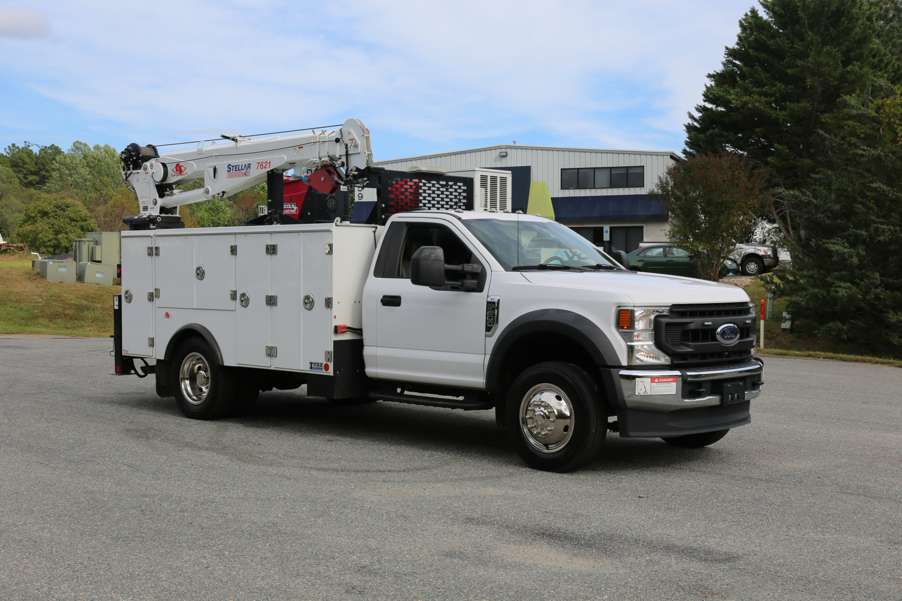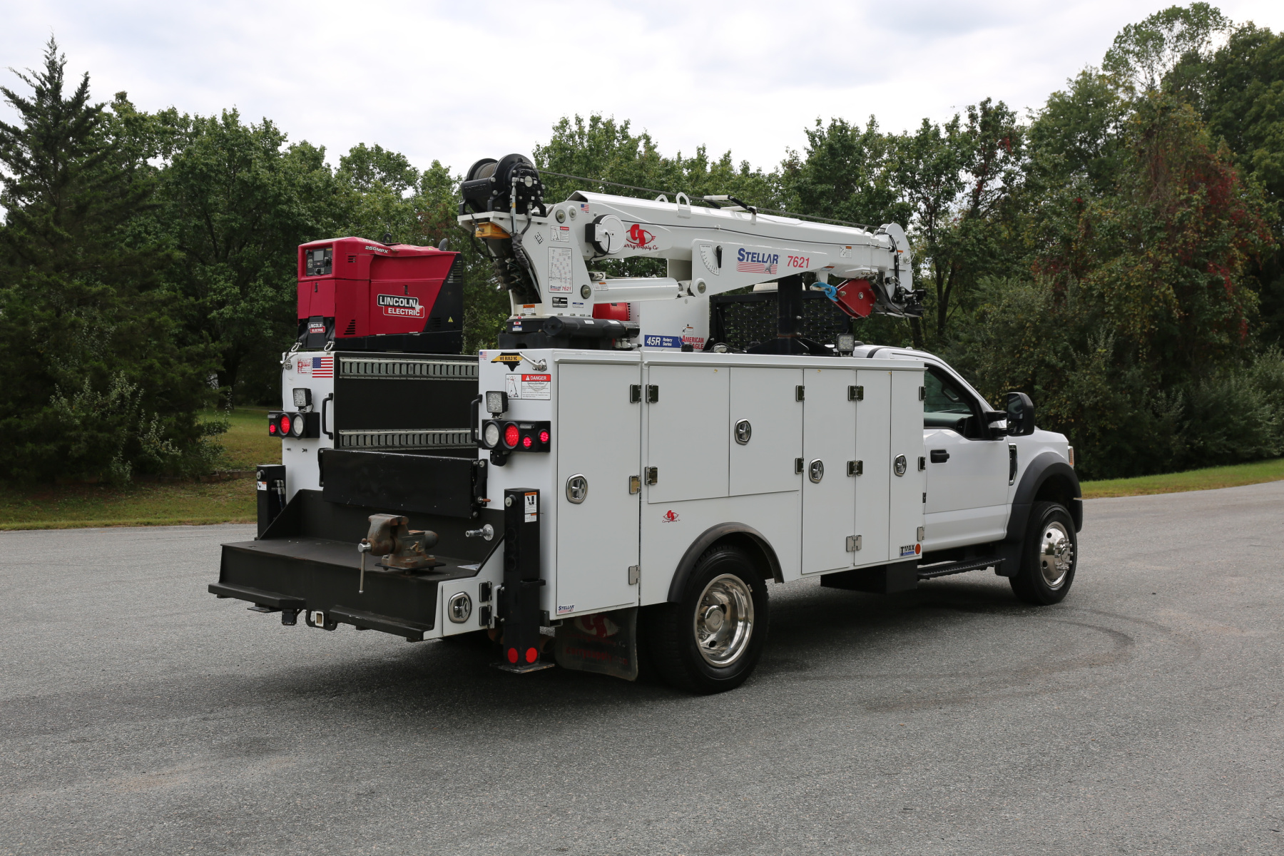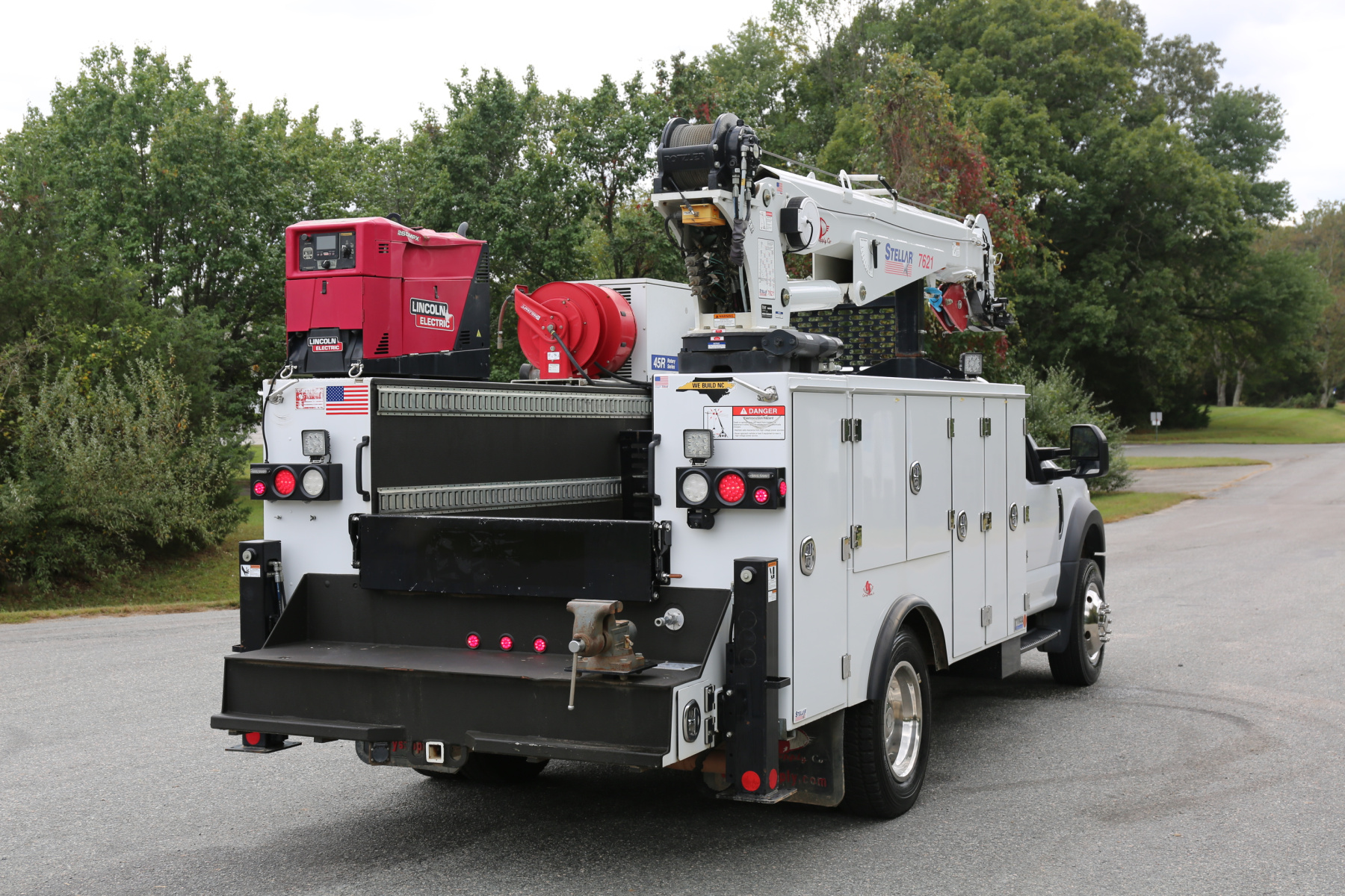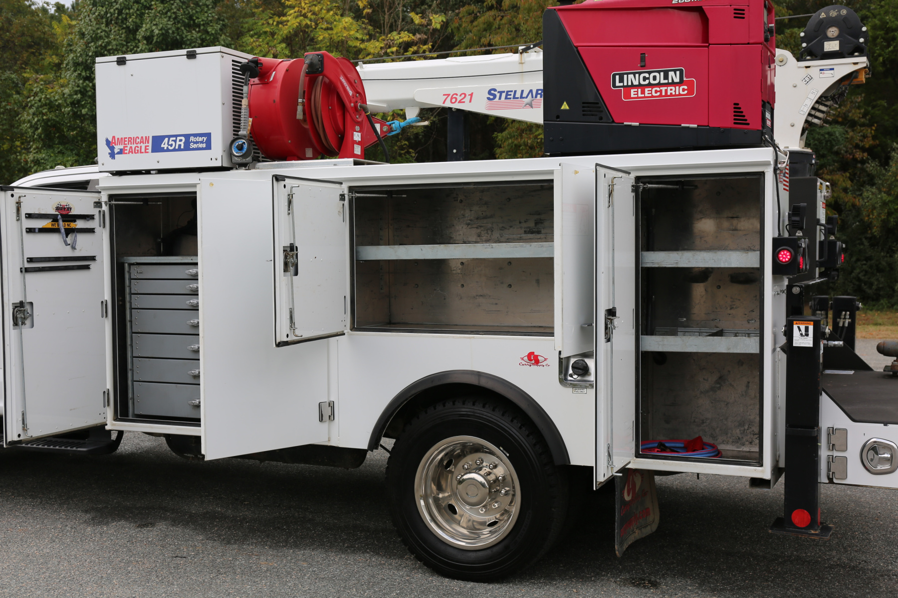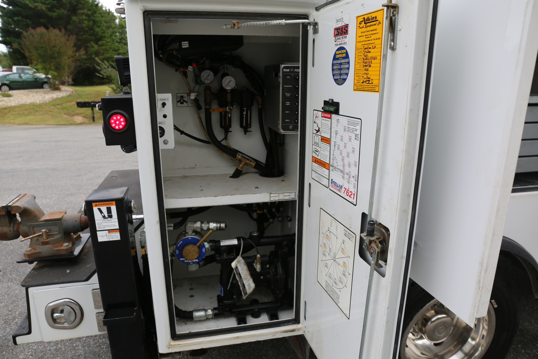 The crane is a Stellar 7621, with a 7500# maximum lifting capacity and a two stage hydraulic reach out to 21′ of total extension. Run off a factory wireless remote, the remote controls the compressor, and can turn the truck on and off as well.