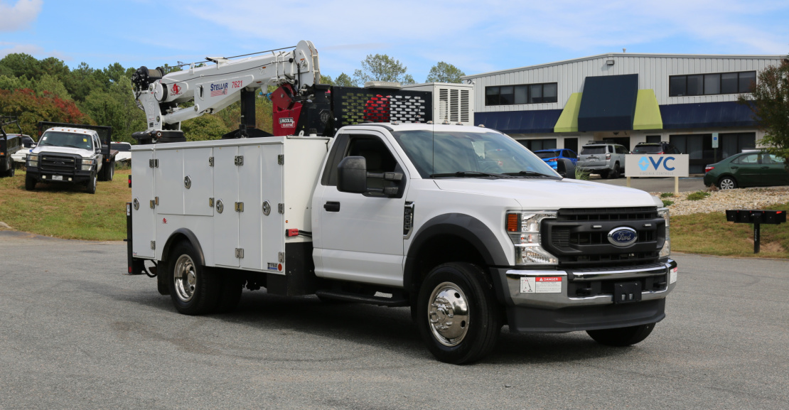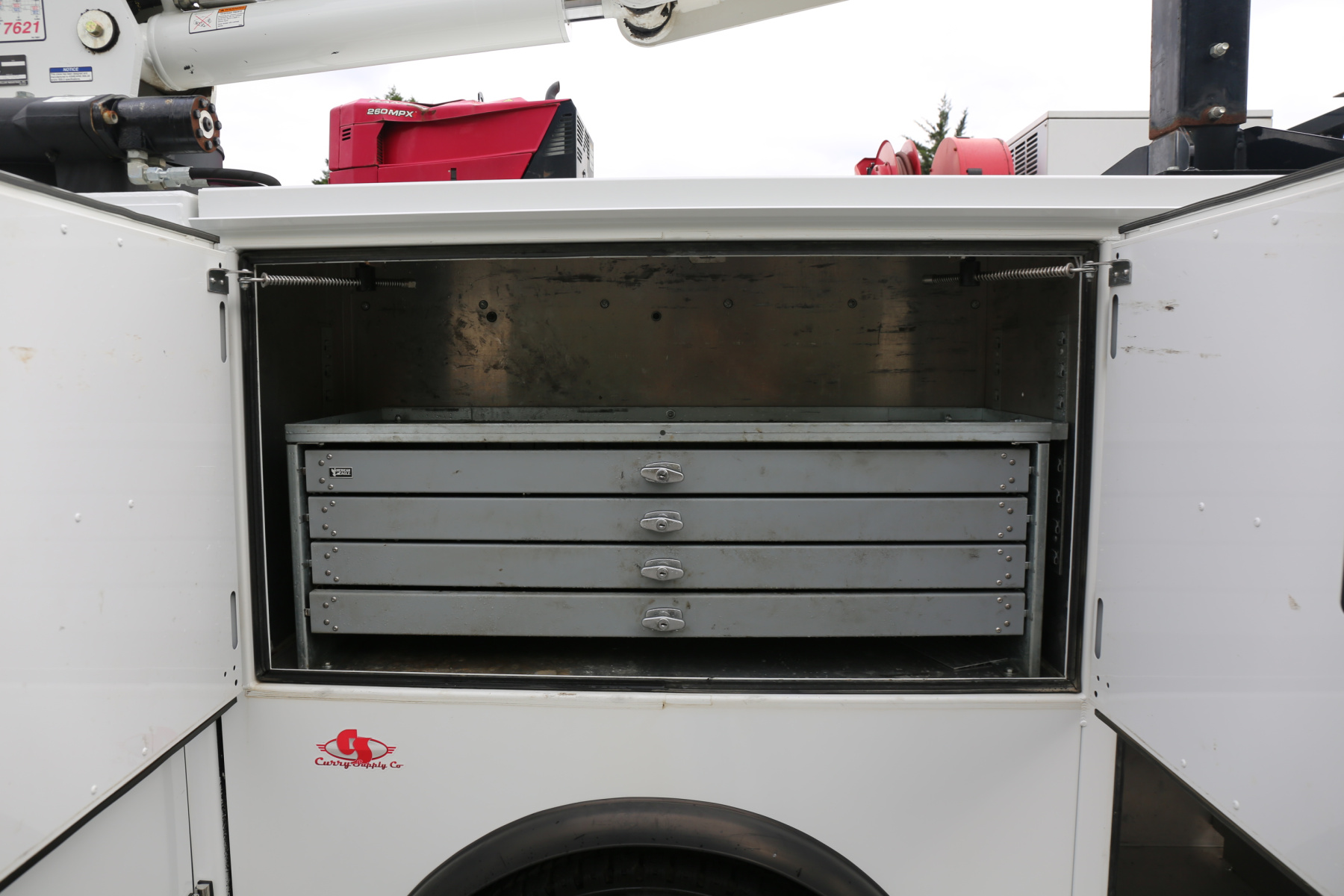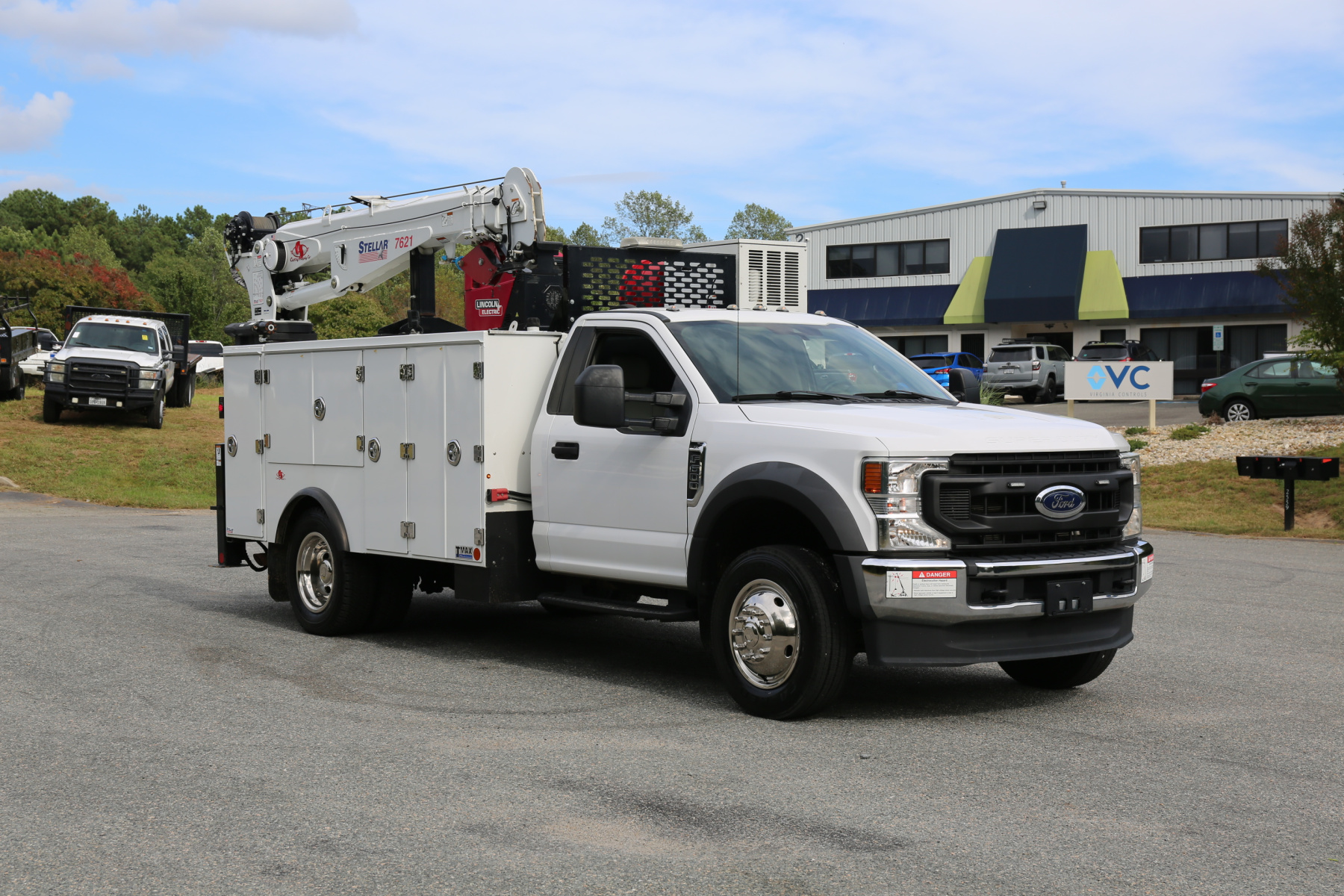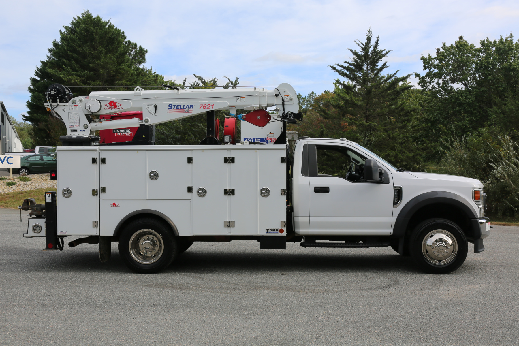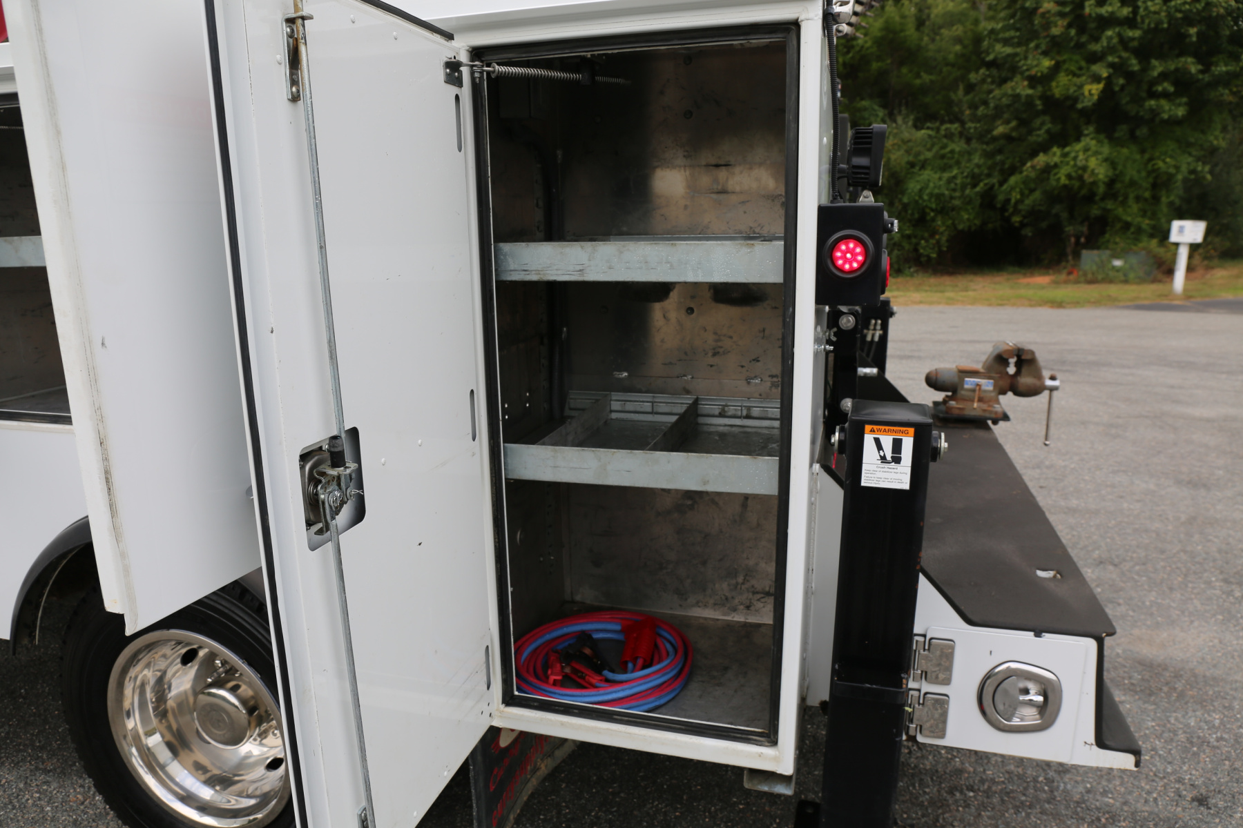 The crane is a Stellar 7621, with a 7500# maximum lifting capacity and a two stage hydraulic reach out to 21′ of total extension. Run off a factory wireless remote, the remote controls the compressor, and can turn the truck on and off as well.