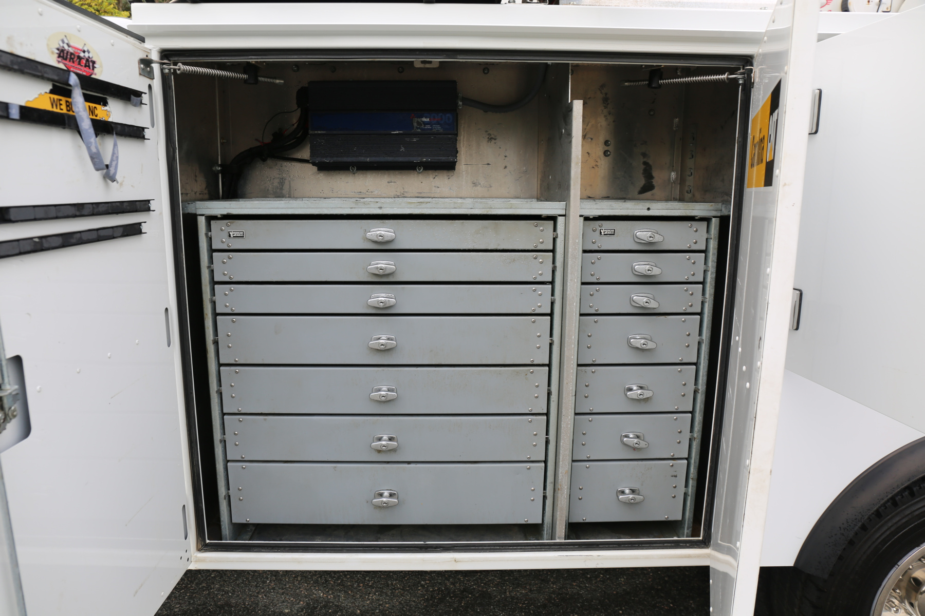 The D1 compartment is equipped with a full set of American Eagle drawers, seven total, with a shelf over top and a power inverter. The D2 compartment is equipped with another set of seven American Eagle drawers. The driver wheel well has one shelf, the driver rear compartment has two shelves and a power outlet.