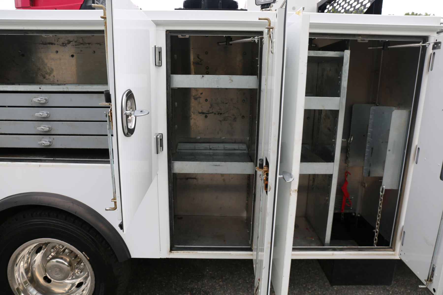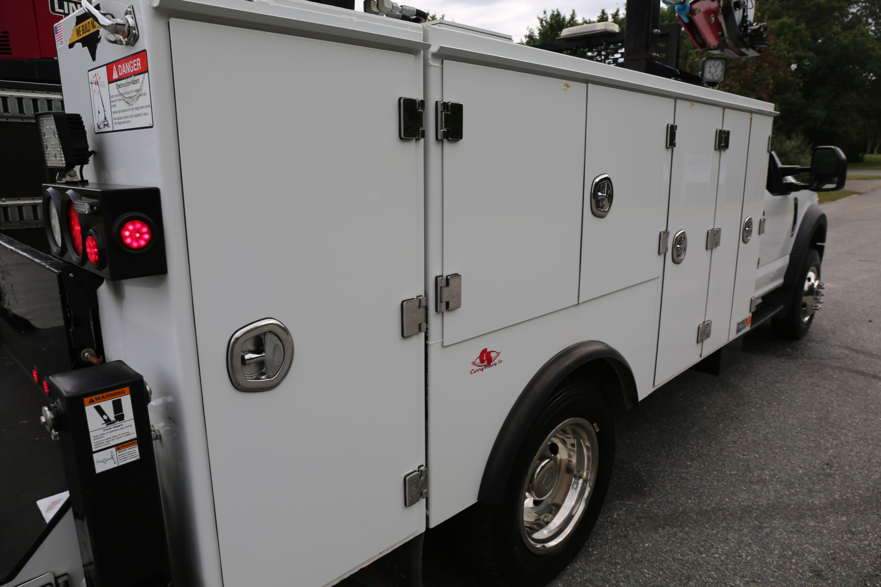 Work bench rear bumper with pass through bin storage underneath, hydraulic outriggers, master slide locks for both bedsides, and a working Wilton vise.