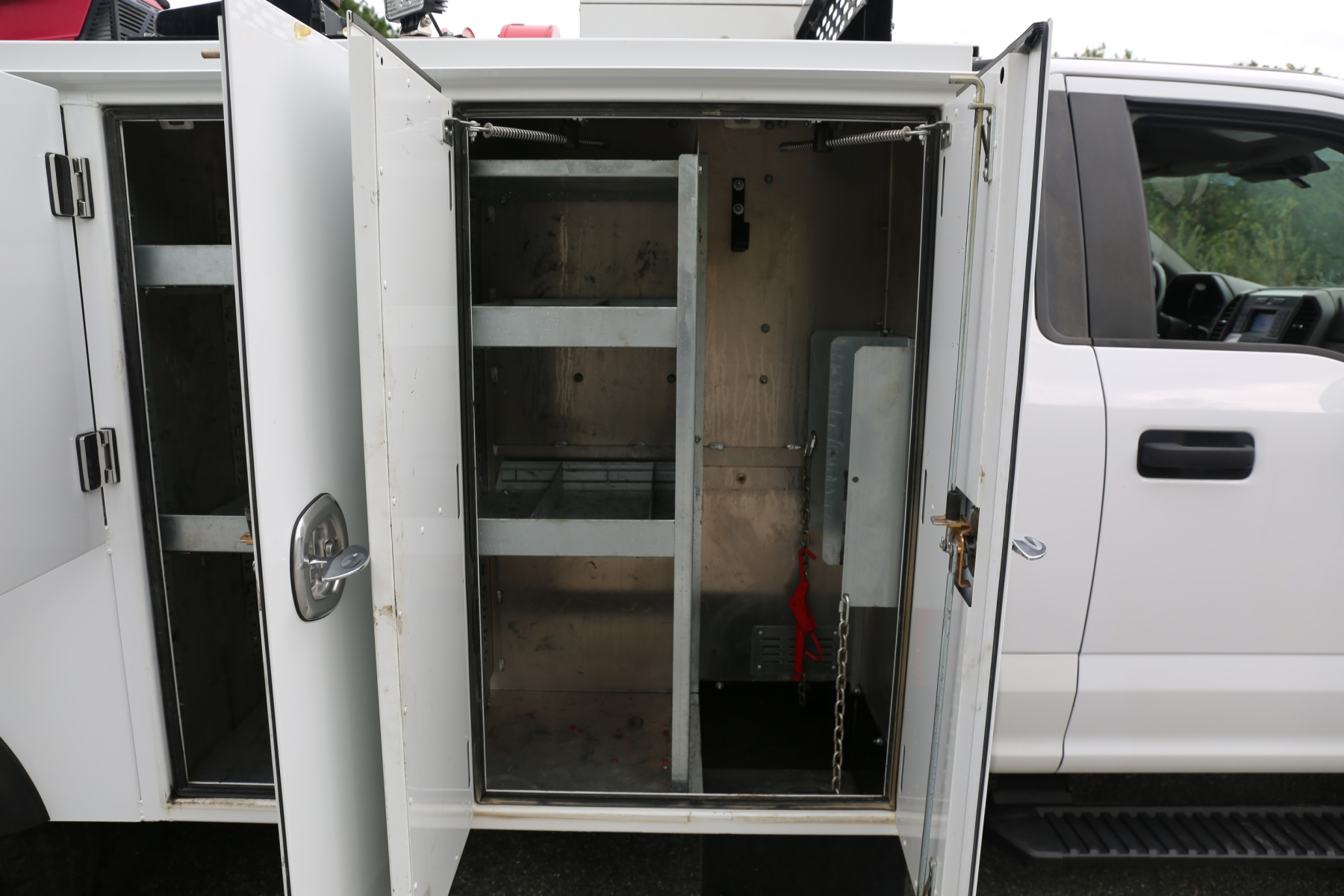The bed is an 11′ Stellar TMAX1-11AL aluminum body with a build date of 7/2021. Interior compartment lighting throughout, rail system on the tops of the bins for mounting accessories, LED worklights on the bed sides and rear of the bed. All of the doors close, latch, lock, and seal as they should. All latches are keyed the same. Factory paint intact, very few rock chips all around, overall the bed is in very good condition.