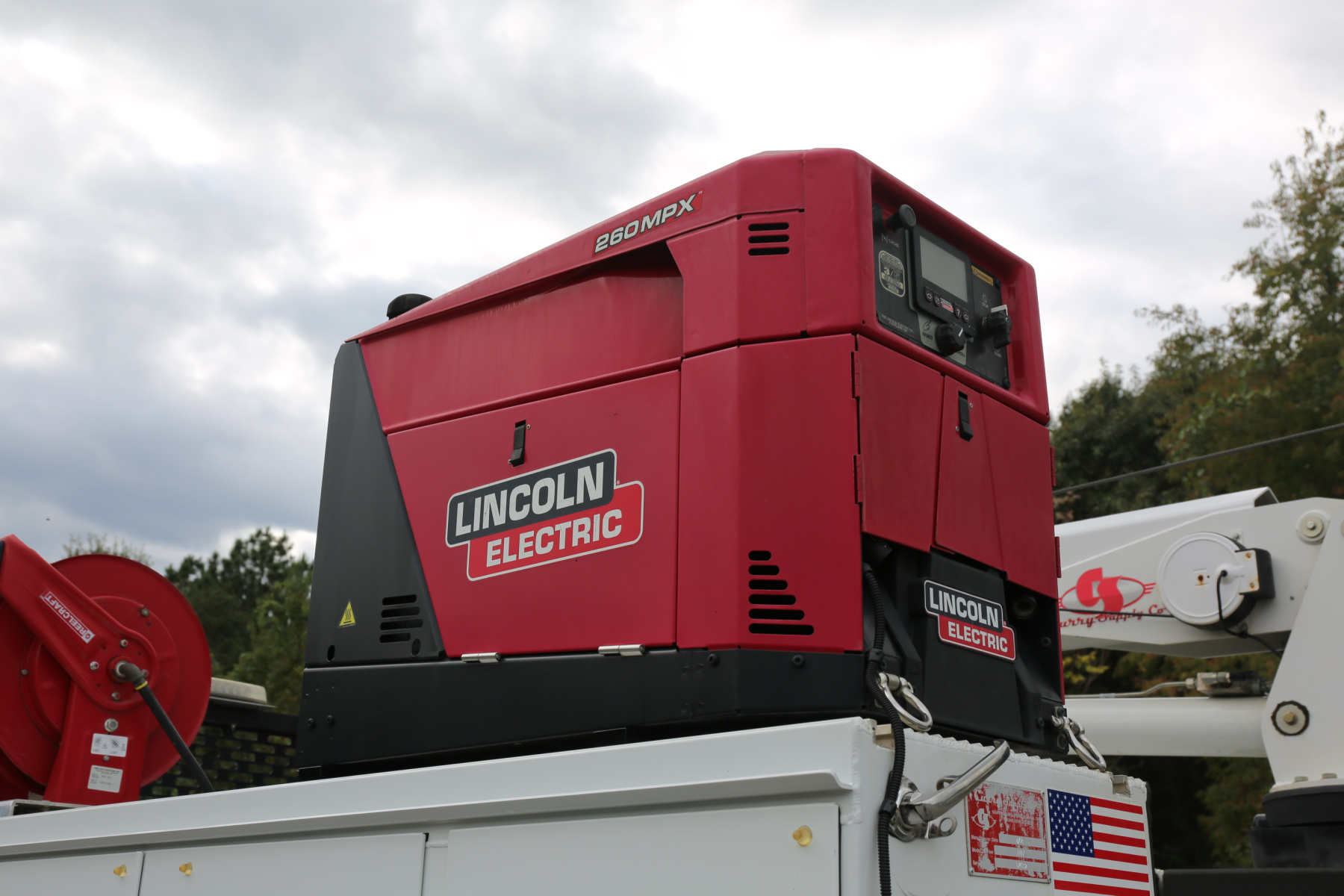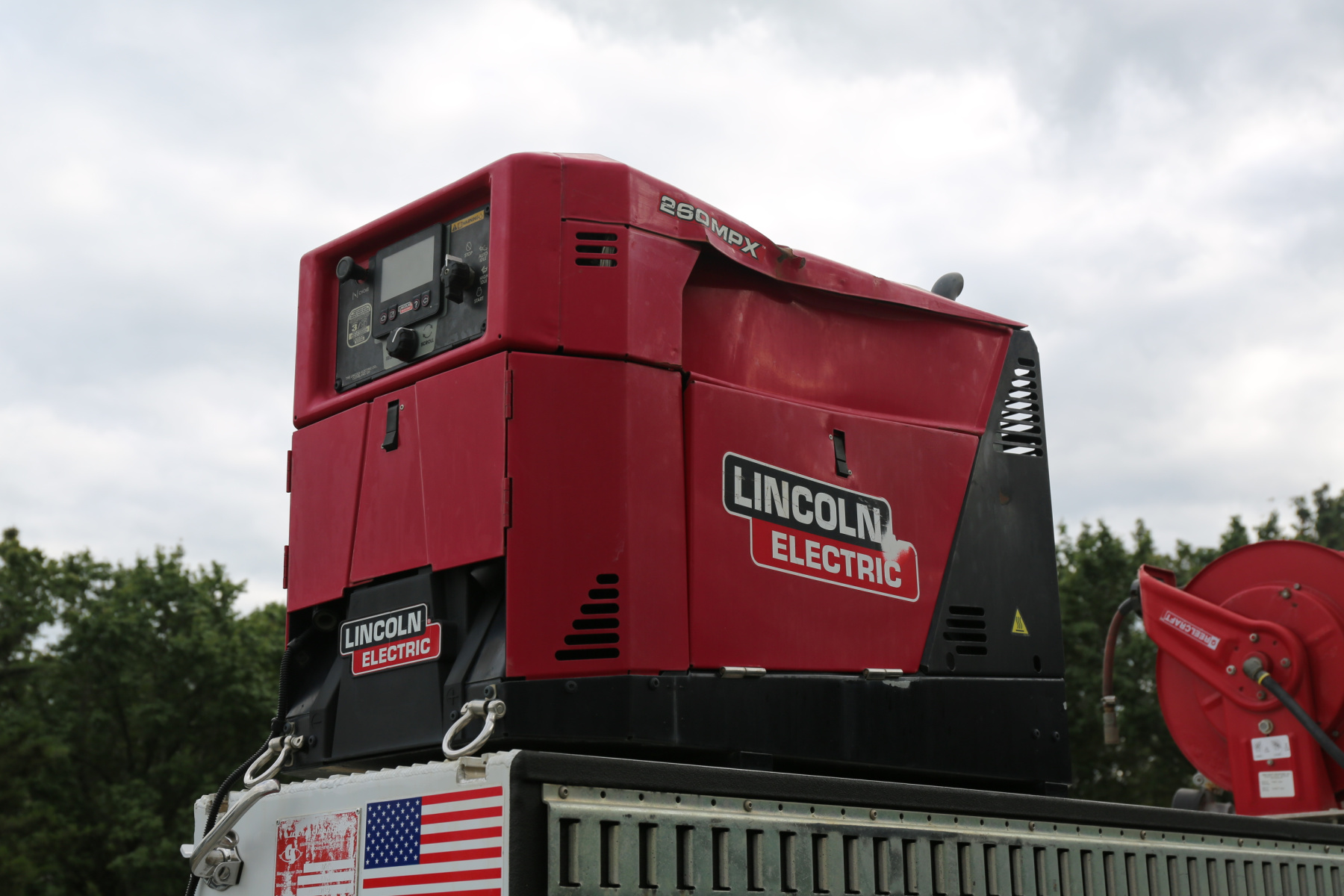 The welder is Lincoln MPX260, with some damage to the sheet metal. Runs as it should, leads included, and shows 38.3 total hours.