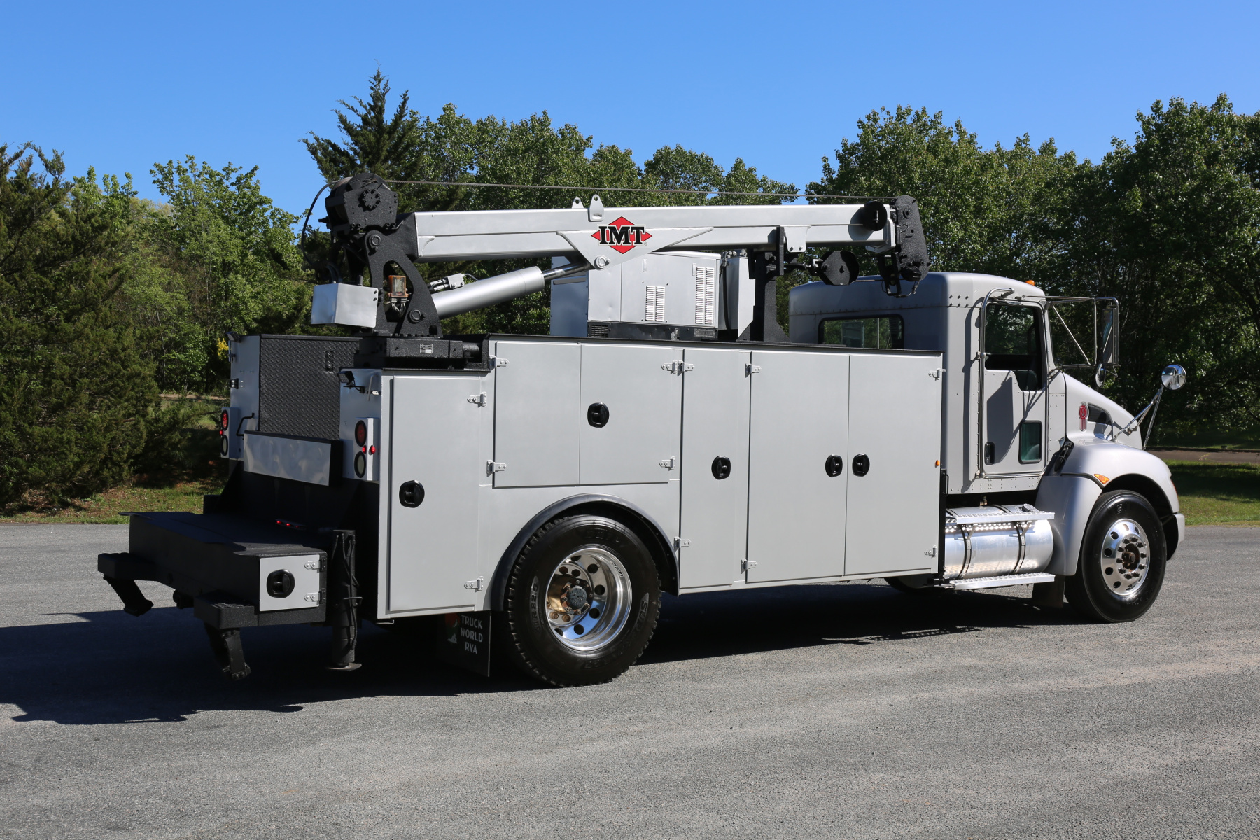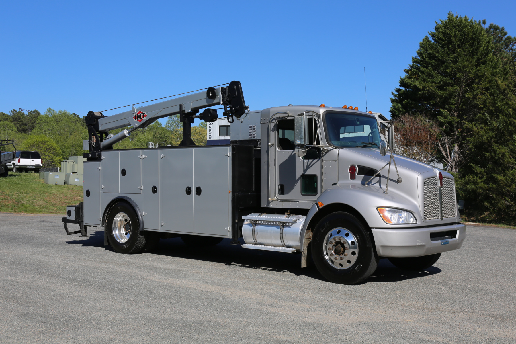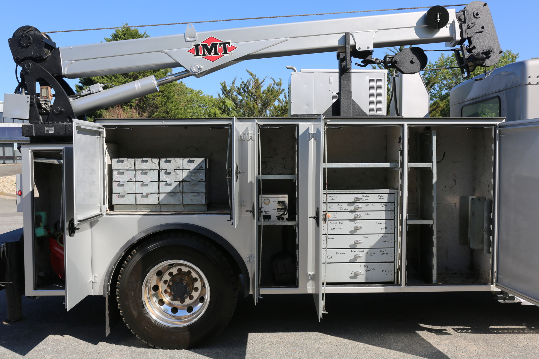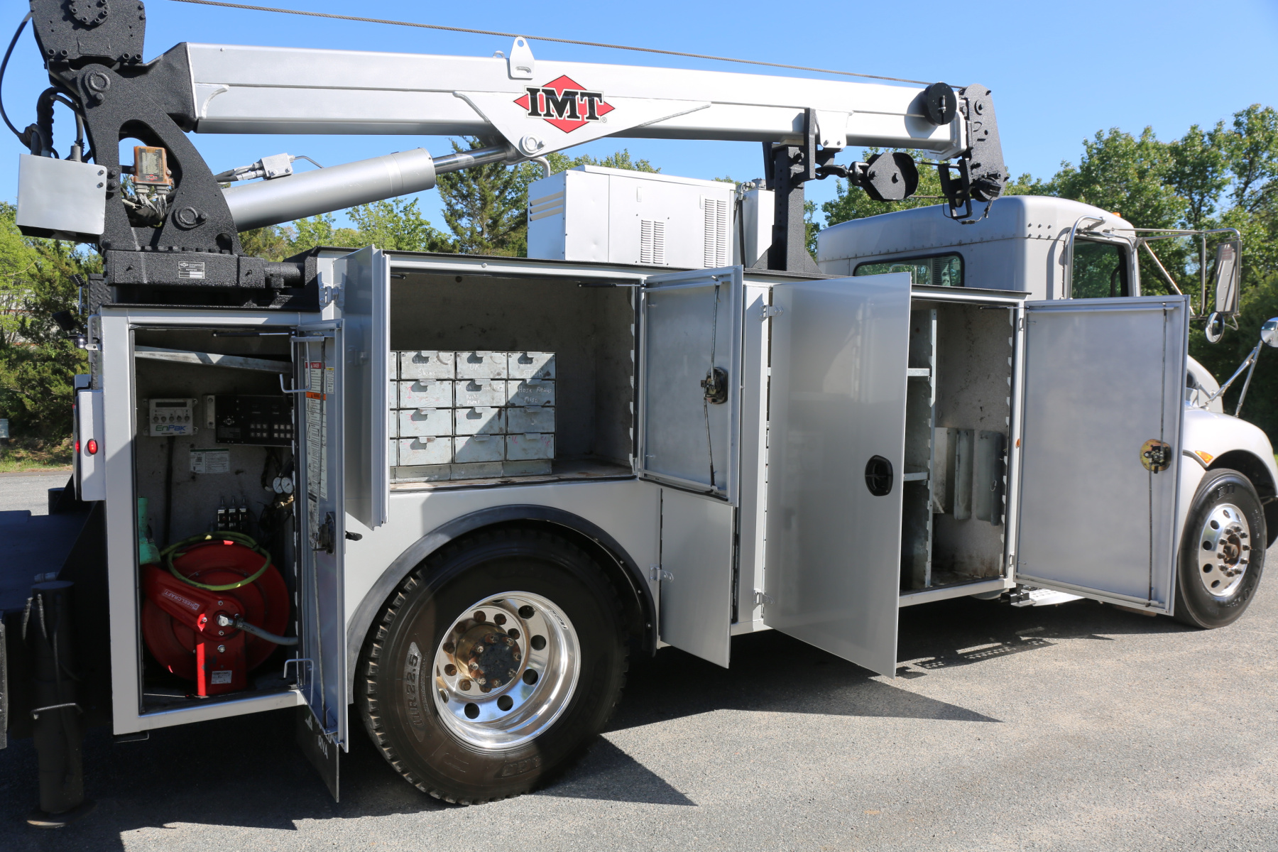 Equipped with a 14′ IMT service body painted to match the chassis, an IMT 10,000-30 series crane, Miller EnPak, and three sets of drawers.