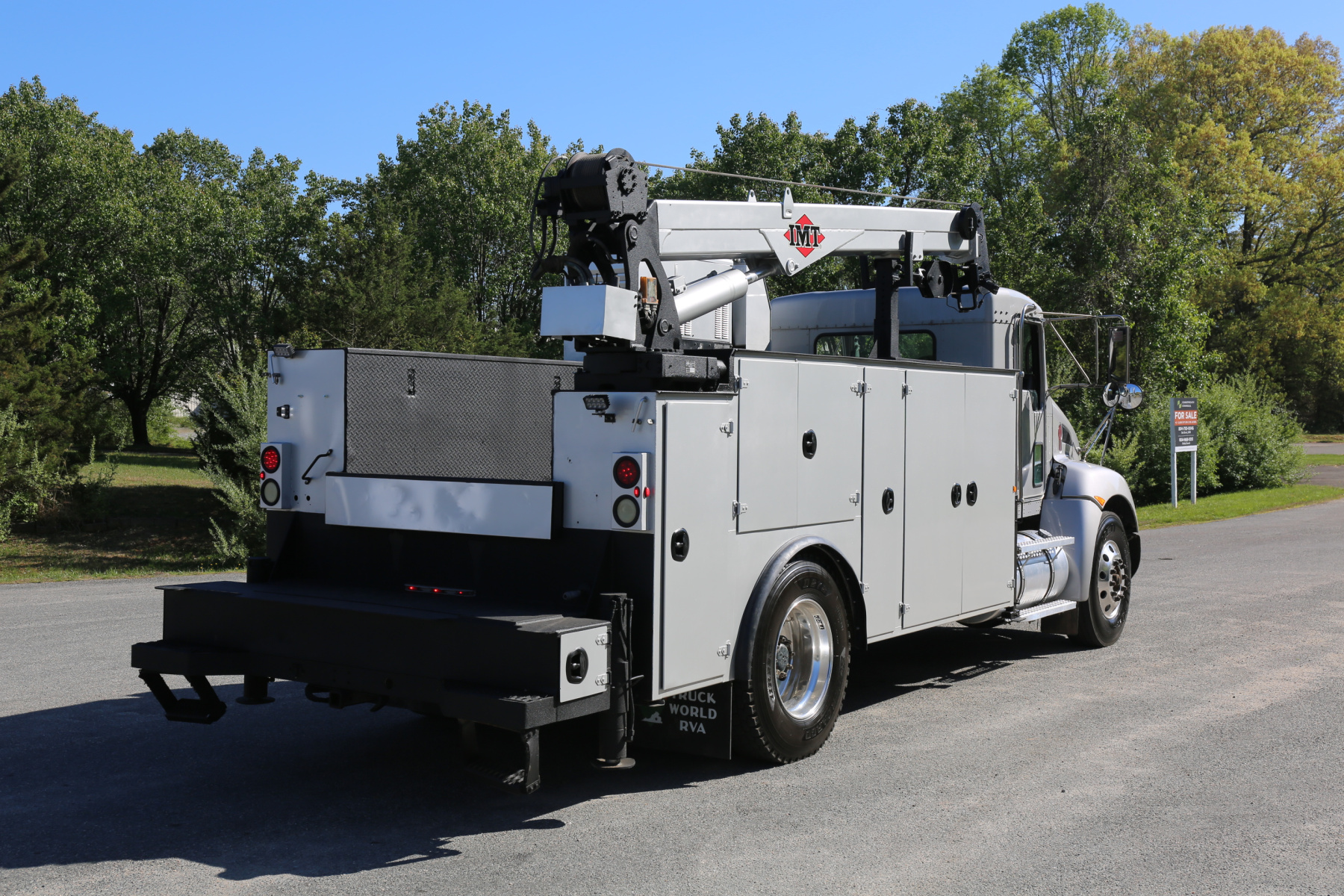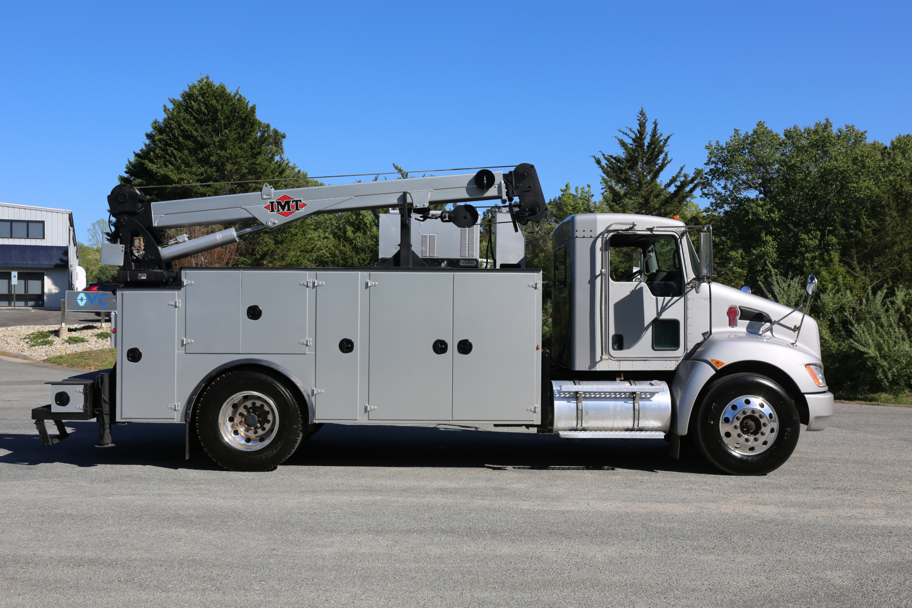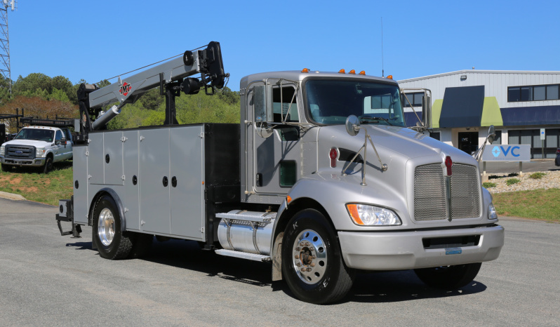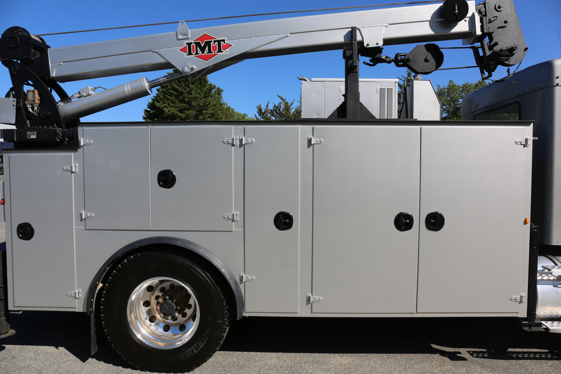 Equipped with a 14′ IMT service body painted to match the chassis, an IMT 10,000-30 series crane, Miller EnPak, and three sets of drawers.