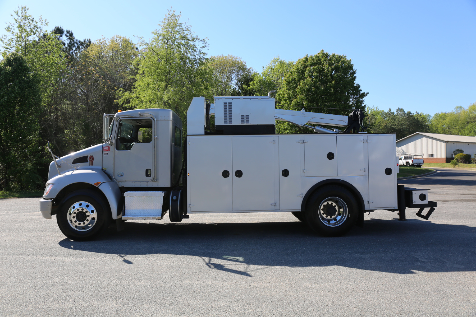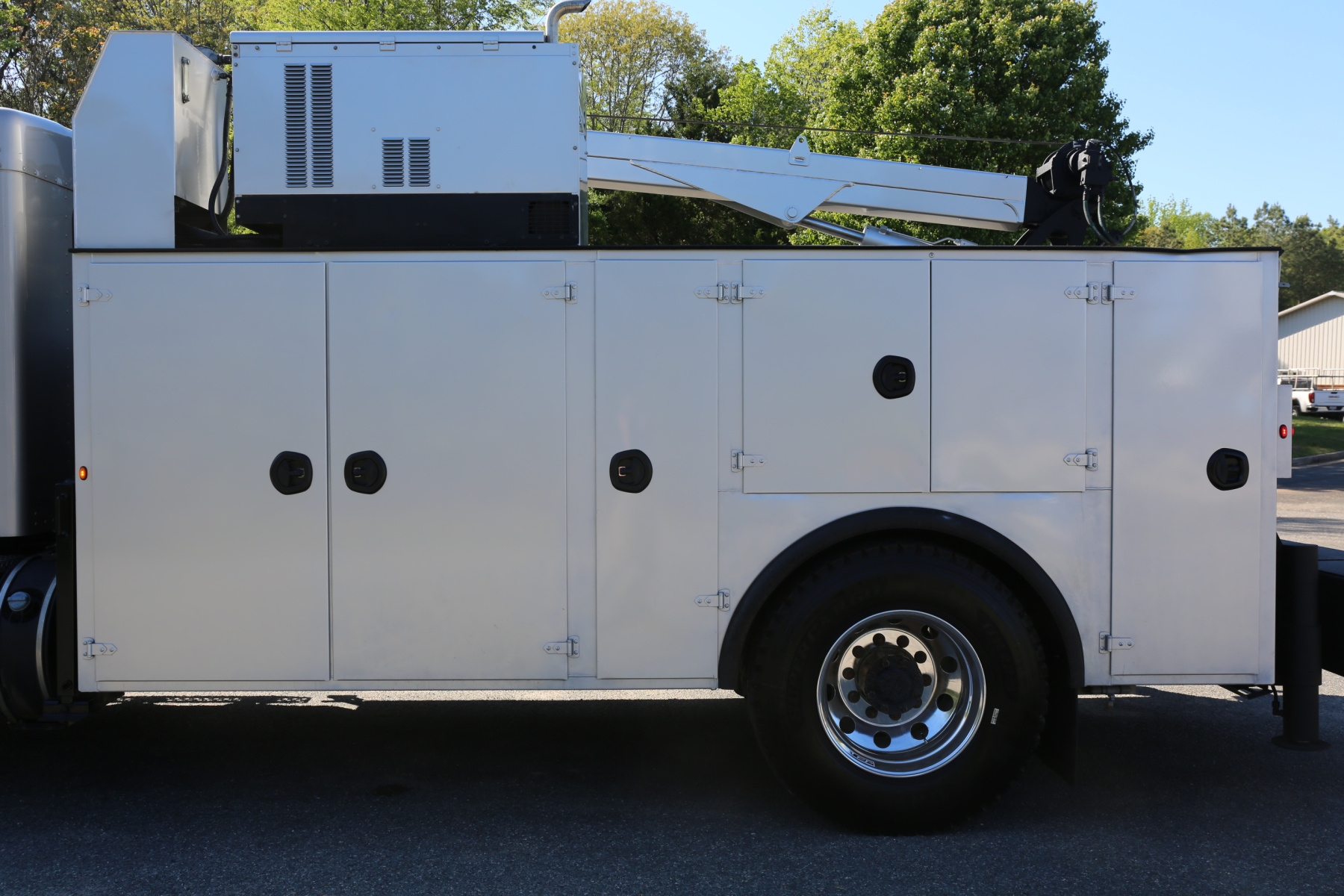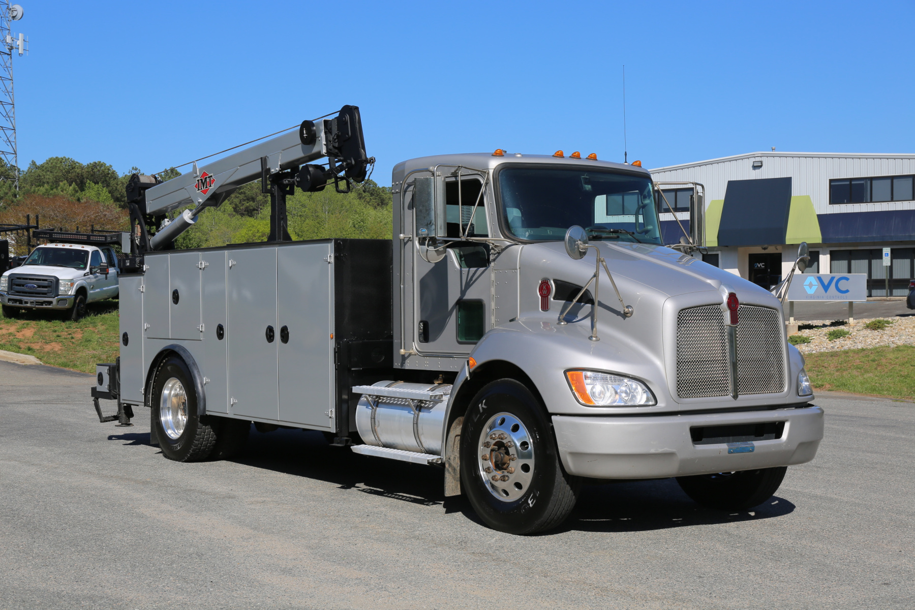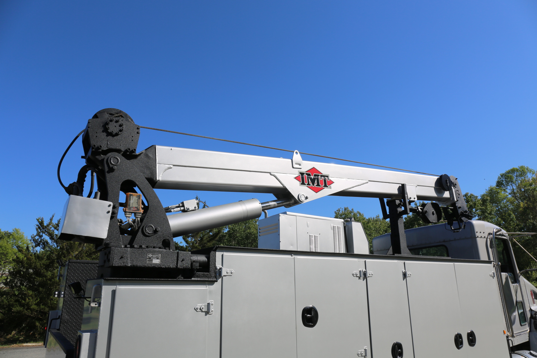 Equipped with a 14′ IMT service body painted to match the chassis, an IMT 10,000-30 series crane, Miller EnPak, and three sets of drawers.
