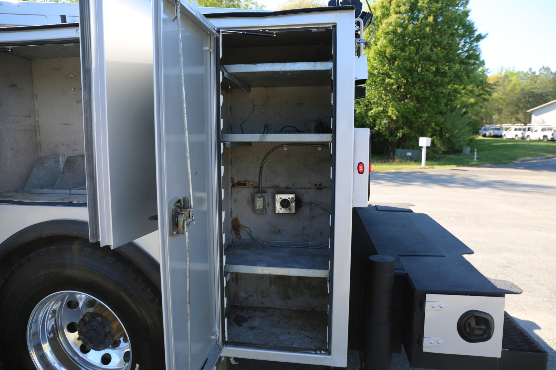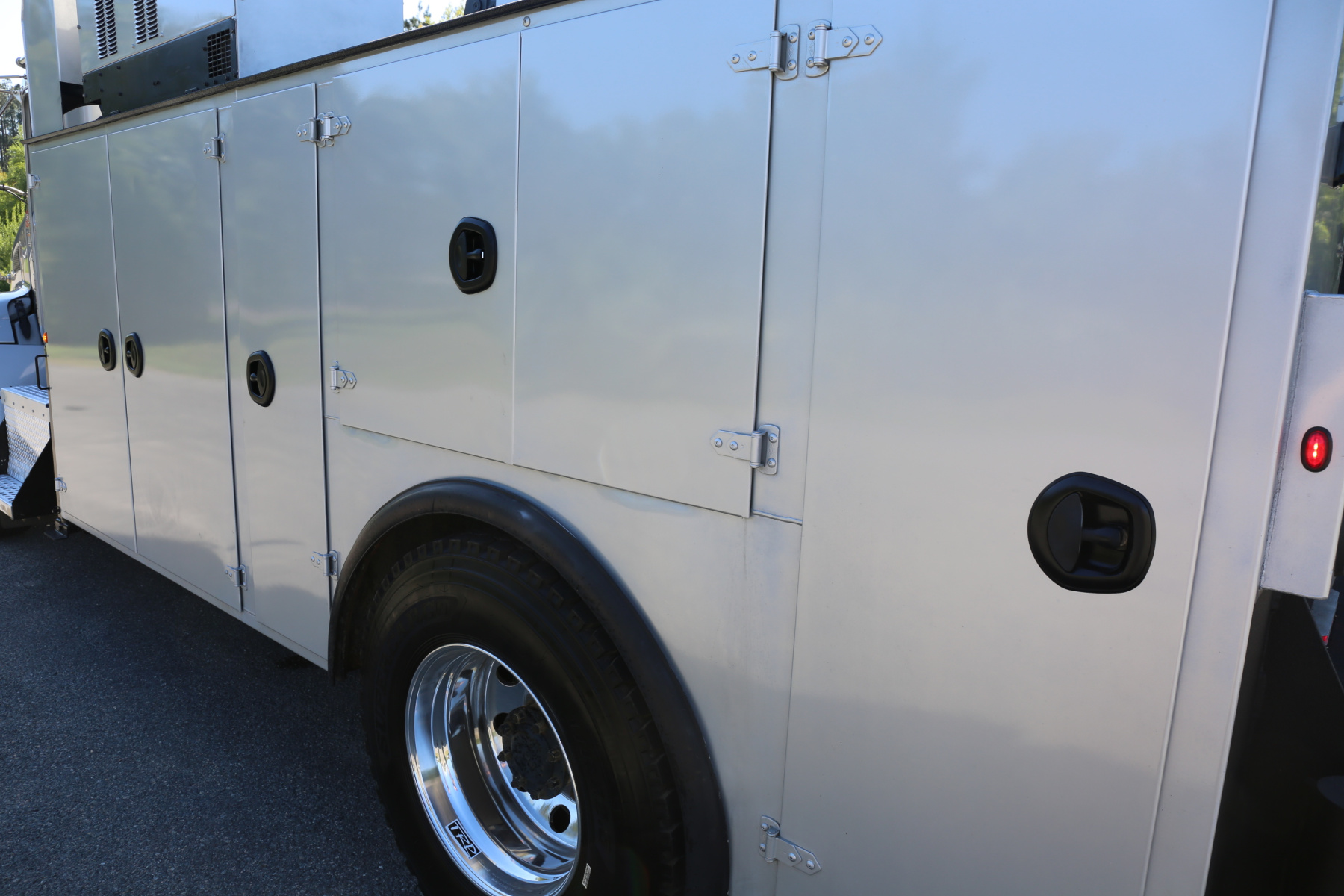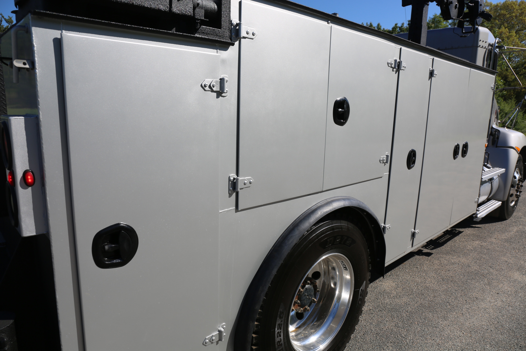 Work bench rear bumper with pass through bin storage, hydraulic outriggers, master slide locks for the bins, and rear LED work lights.