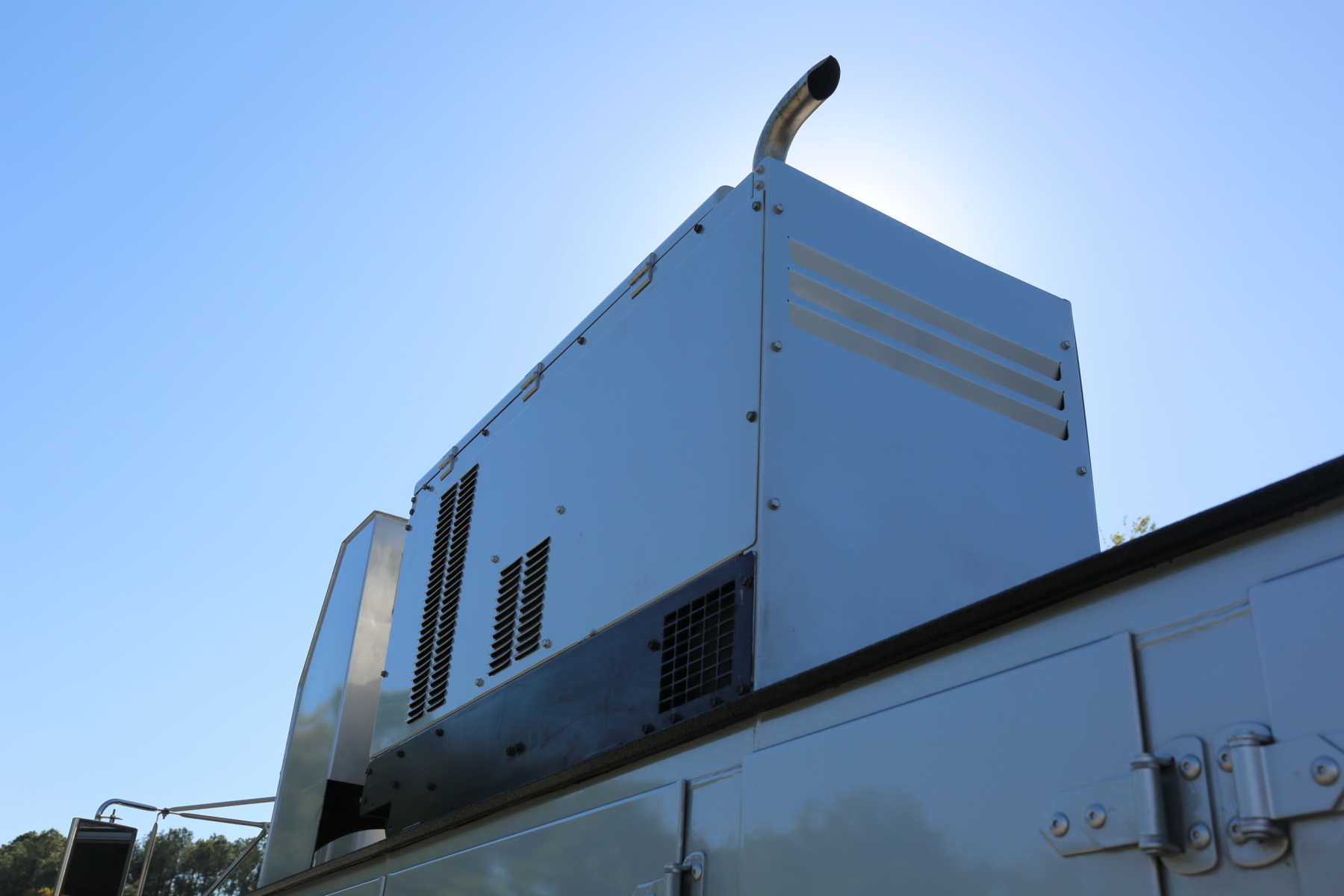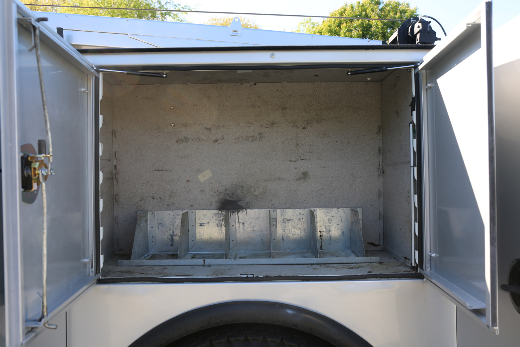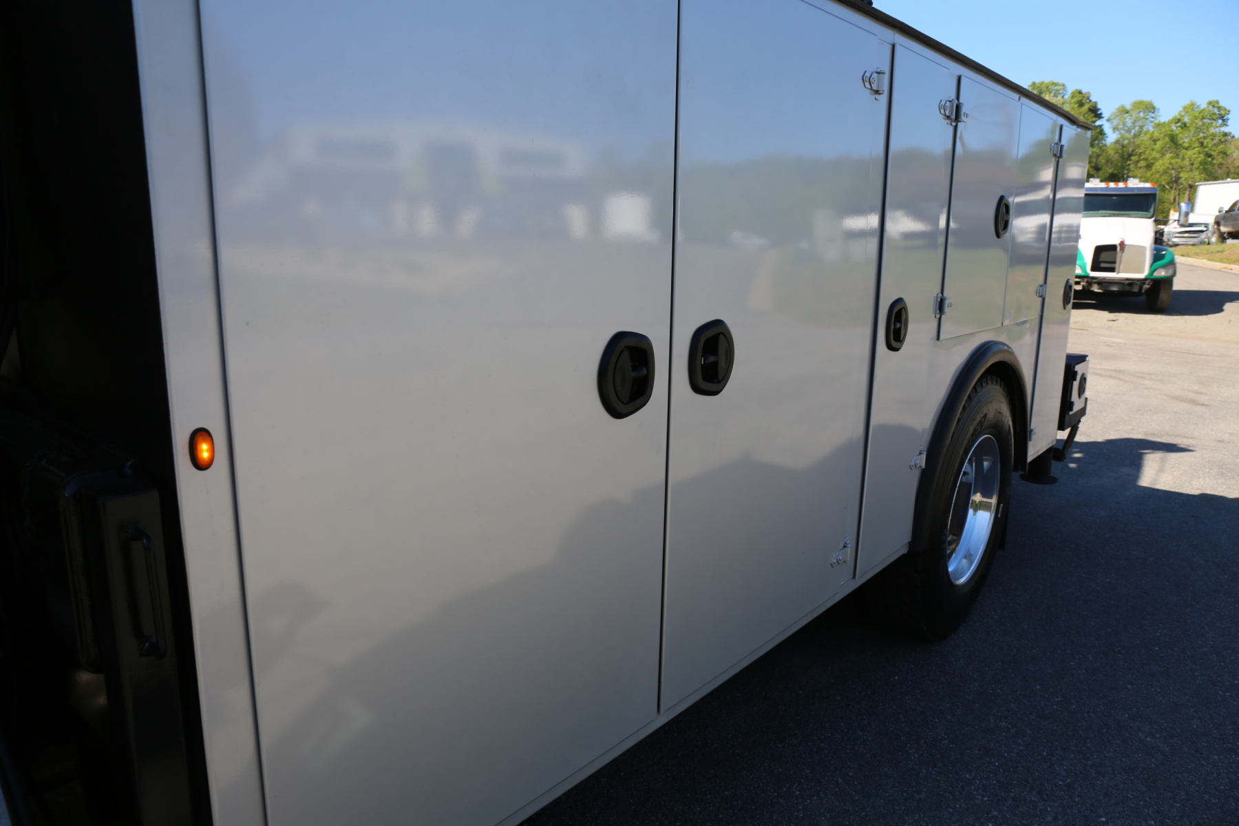 Work bench rear bumper with pass through bin storage, hydraulic outriggers, master slide locks for the bins, and rear LED work lights.