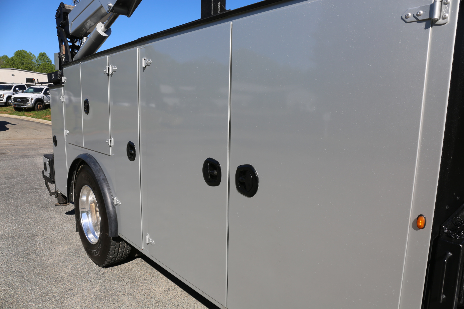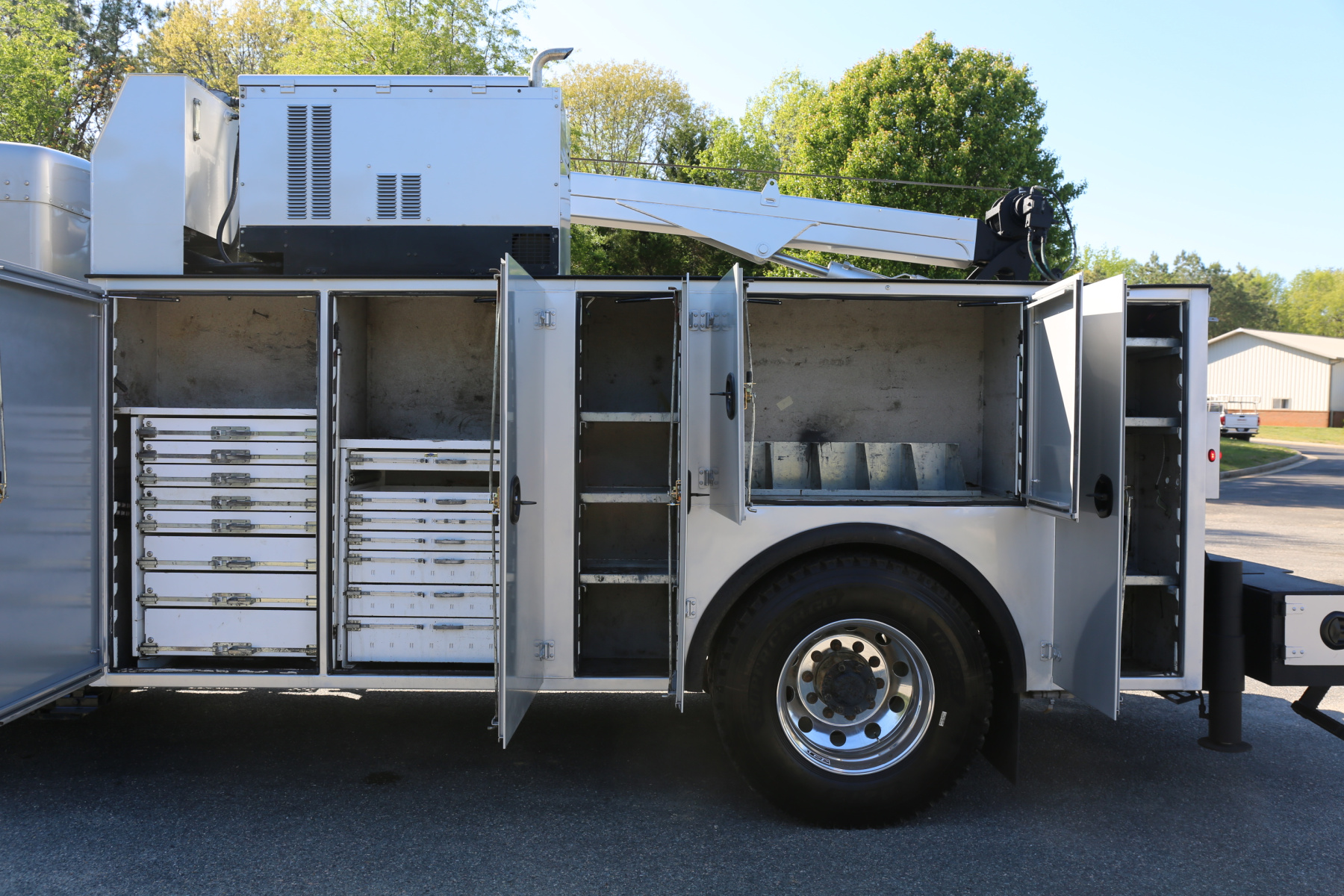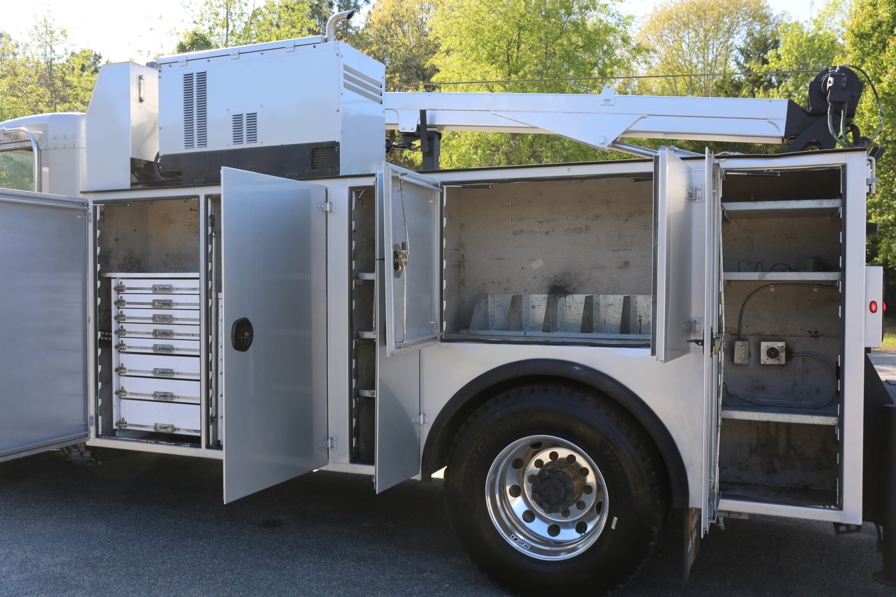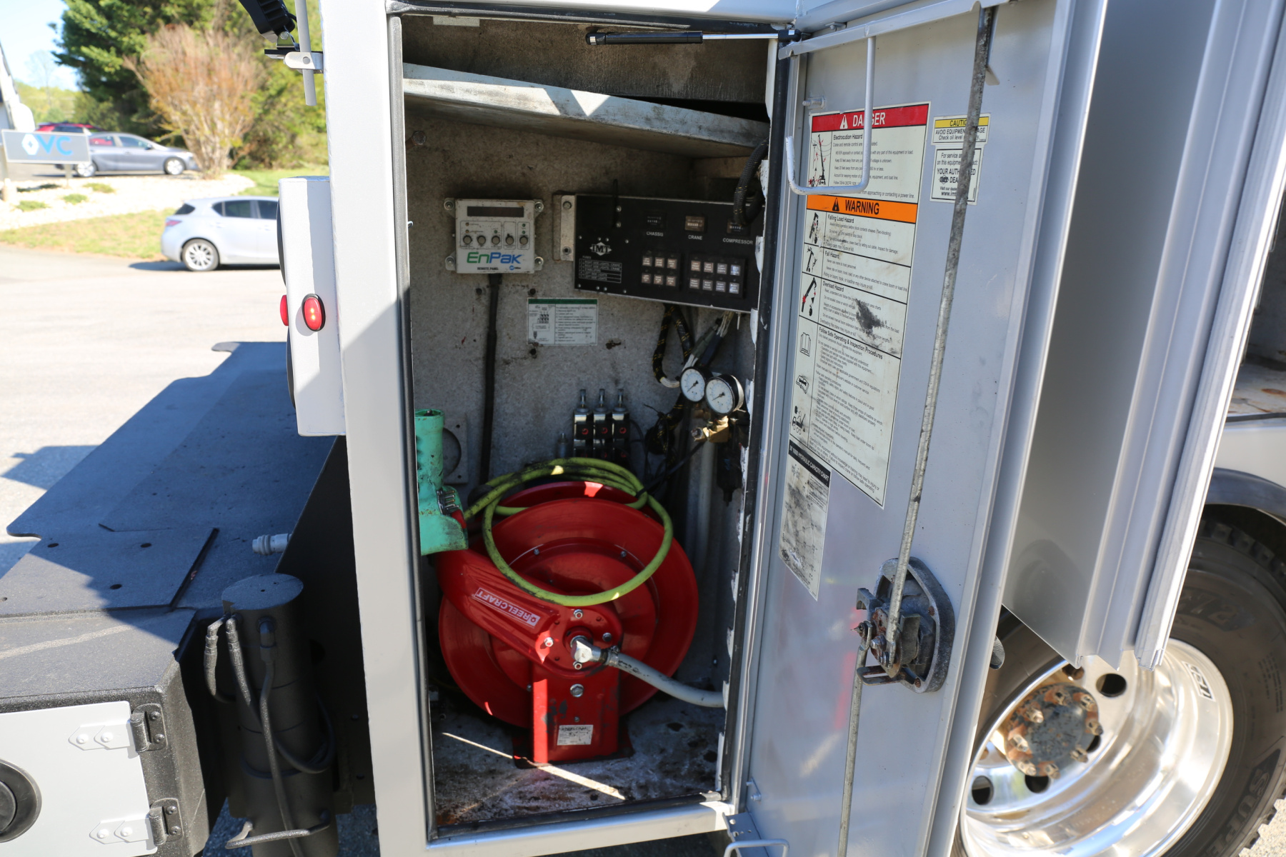 The crane compartment houses the body control panel to control the bed lighting and outriggers, a reelcraft hose reel, and an air regulator/drier.