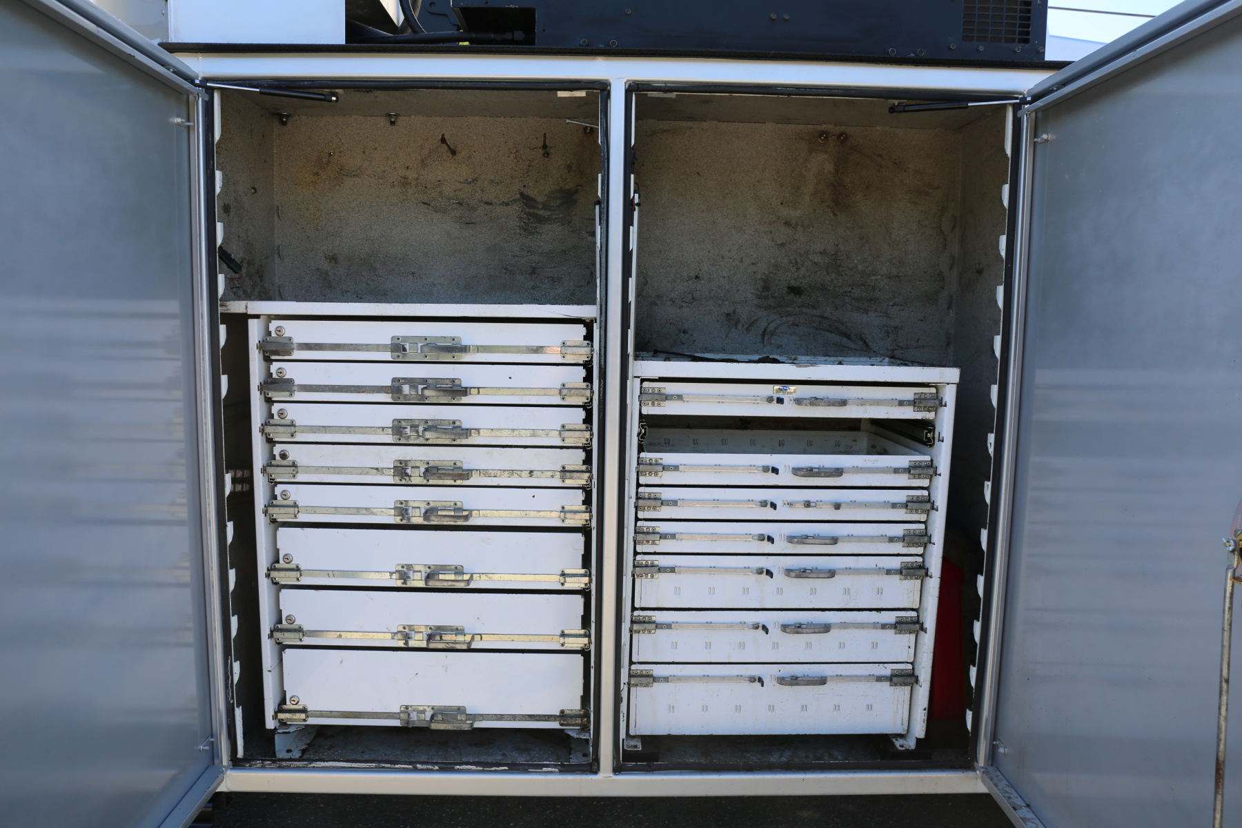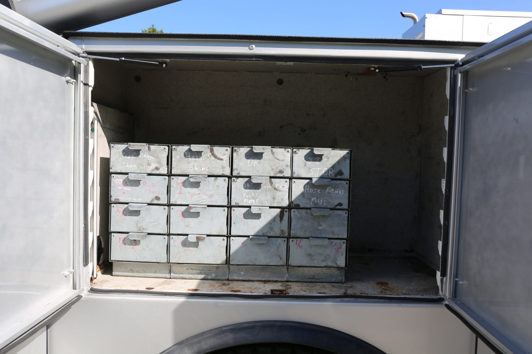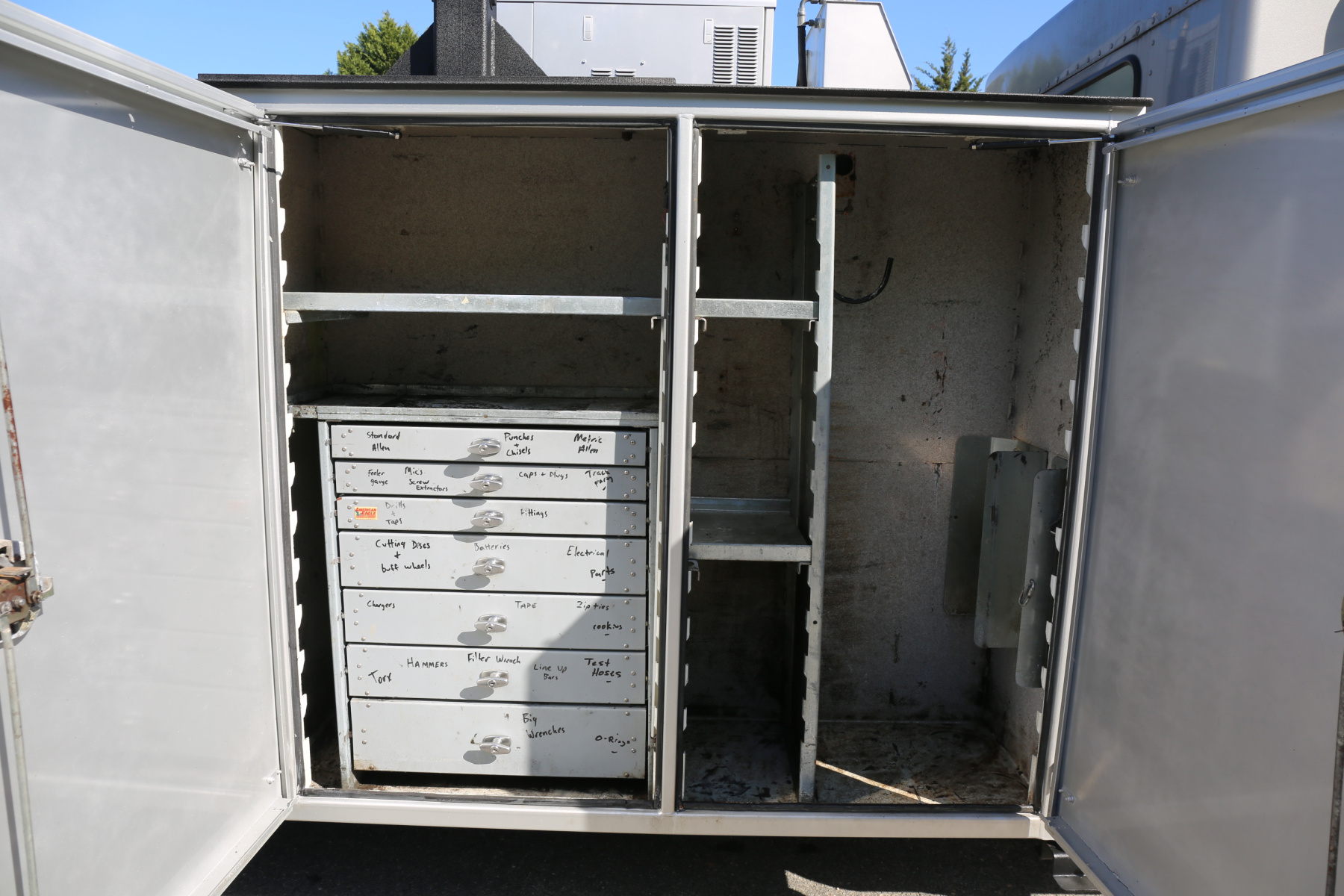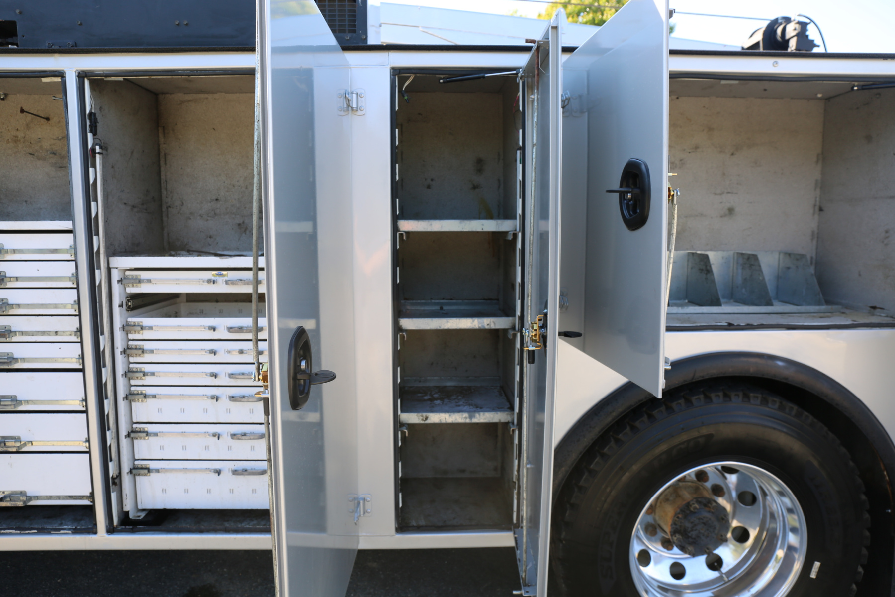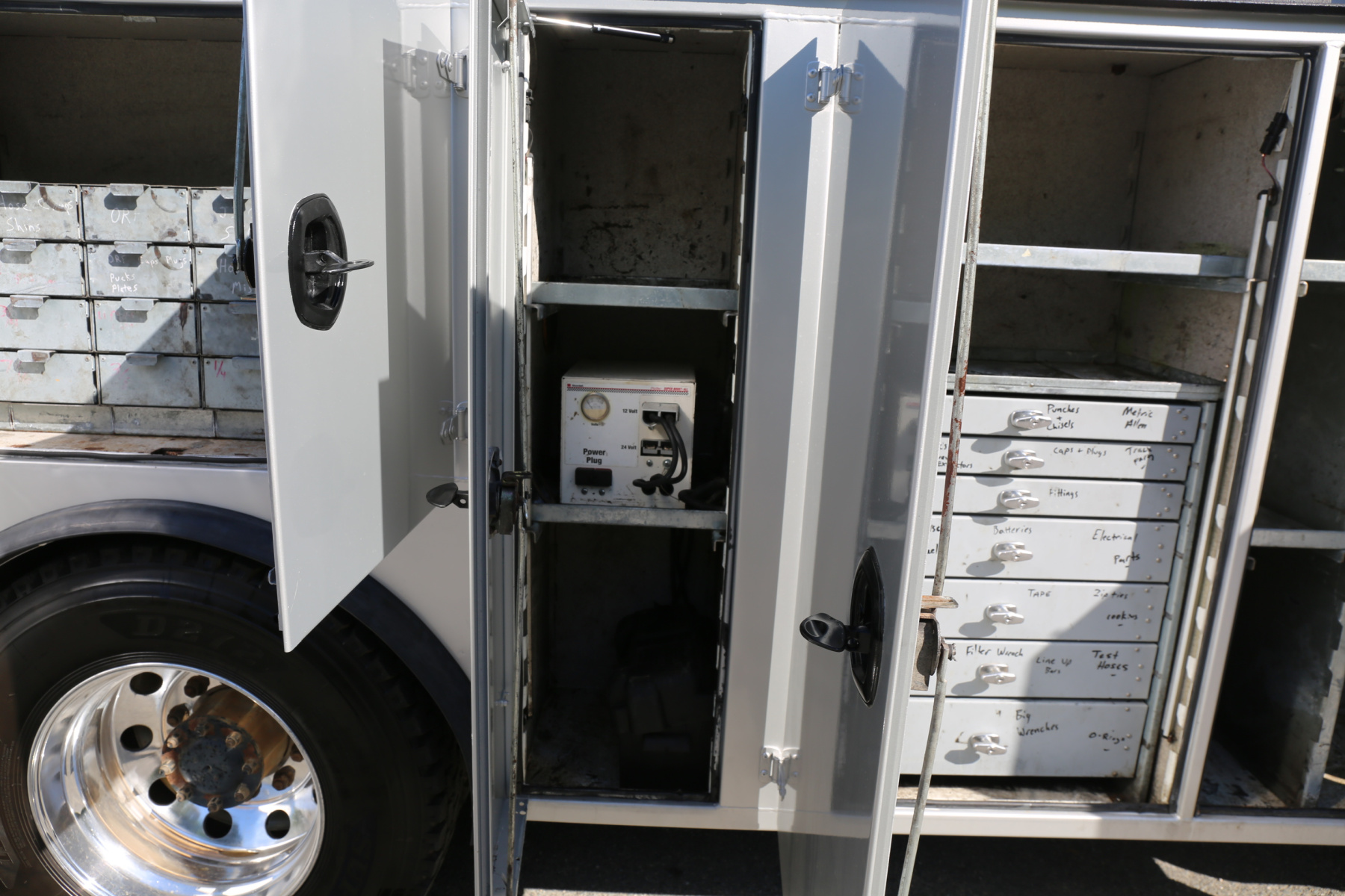 A set of sixteen bolt bins are over the passenger wheel well. Two shelves in the P3 compartment. A set of seven American Eagle drawers are in the P2 compartment as well as two shelves. The P1 compartment has two shelves and torch bottle racks/straps.