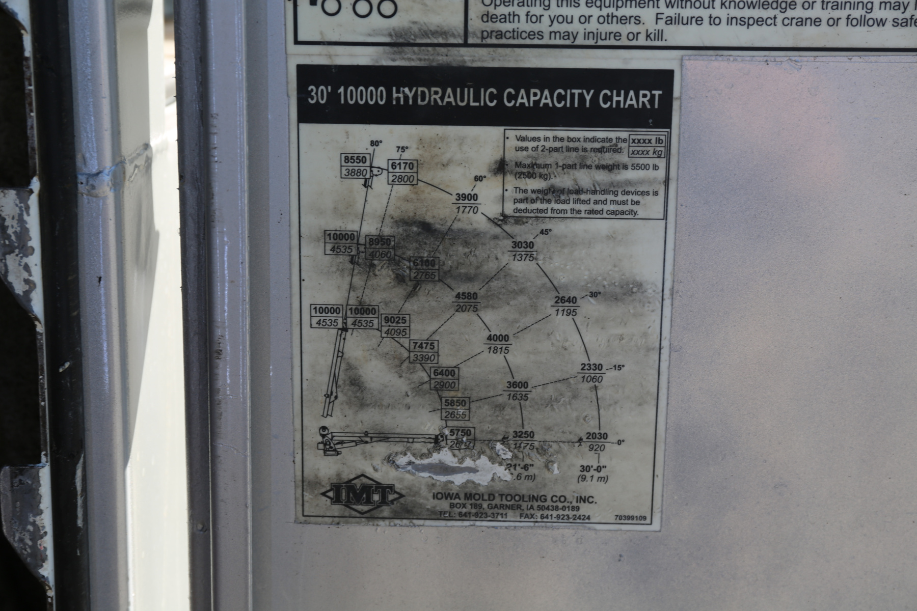The crane is an IMT 10,000-30 series, with a 10,000# maximum lifting capacity and a two stage extension out to 30′ Run off a factory wireless remote, and showing 282 hours.
